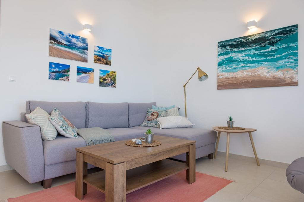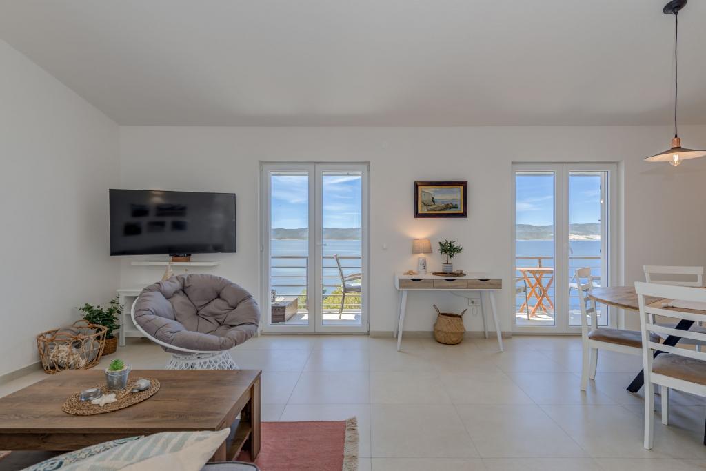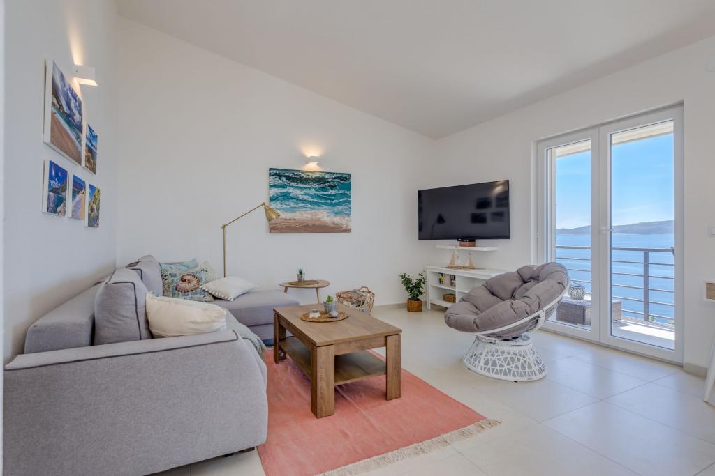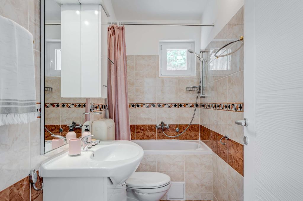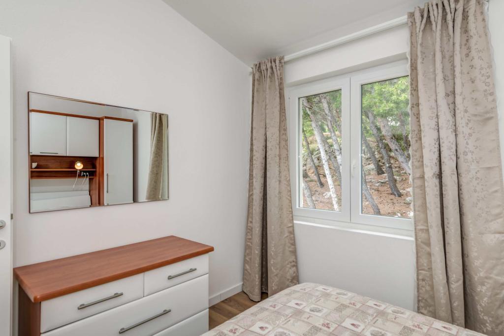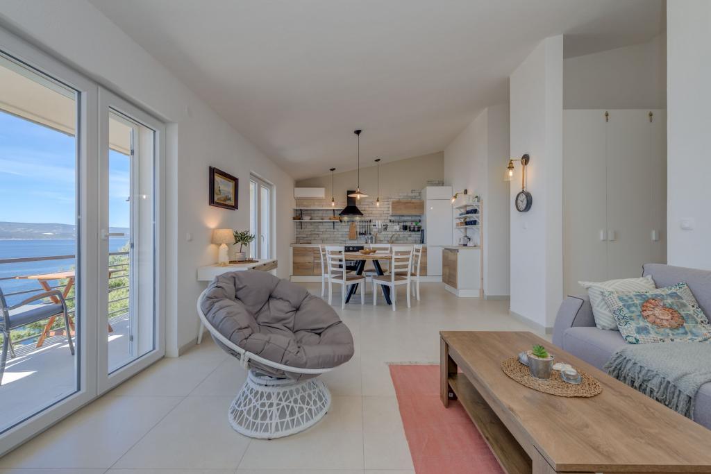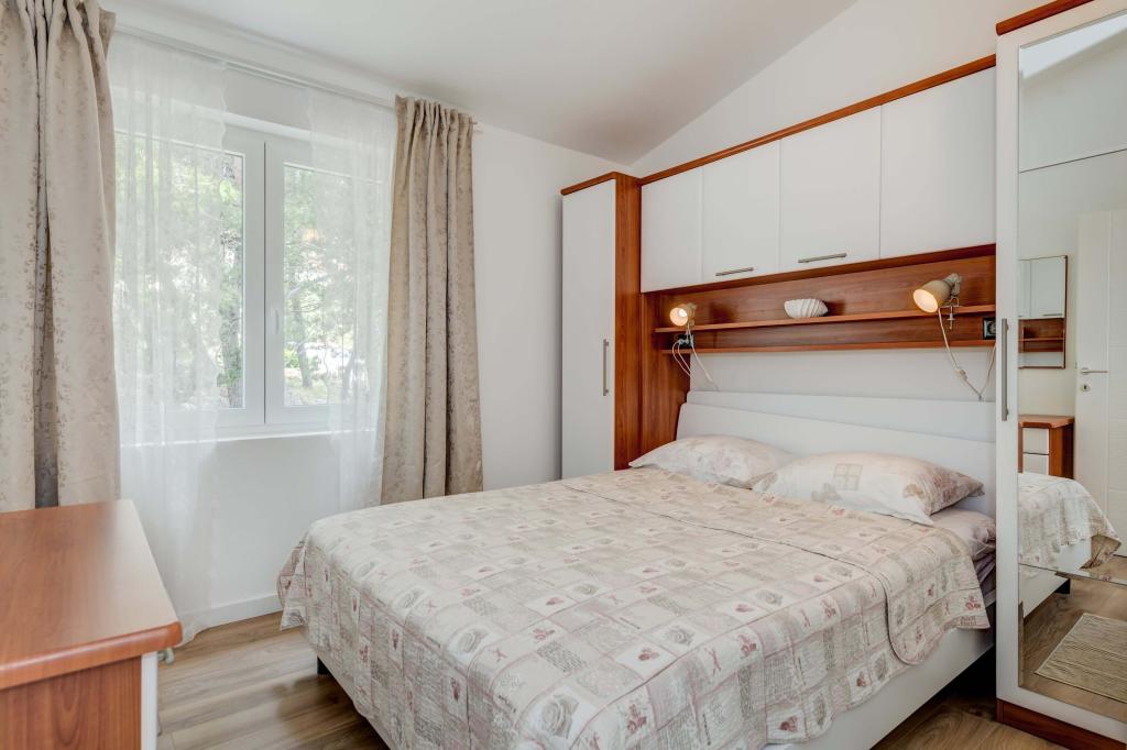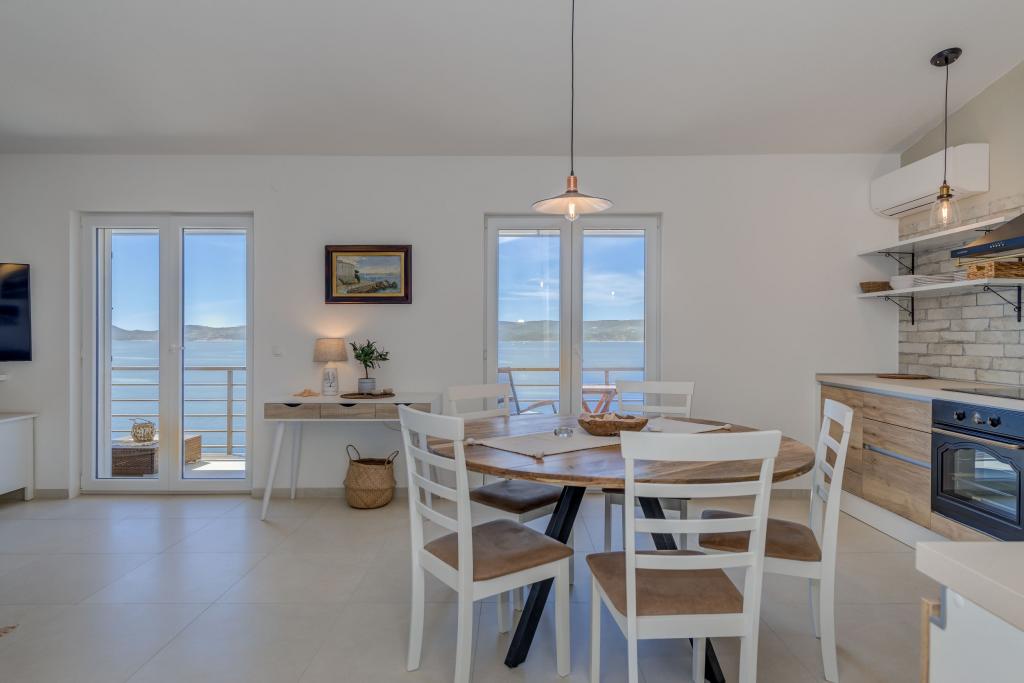 Apartma se nahaja v drugem nadstropju, s skupno površino 90 m2. Ima veliko teraso, ki se nahaja na jugozahodni strani v velikosti cca. 50m2. Apartma ima dve spalnici in dve kopalnici, popolnoma opremljeno kuhinjo in prostorno dnevno sobo. Ena soba ima zakonsko posteljo z dodatnim ležiščem (2 +1), ločeno kopalnico in dostop do prostorno teraso s pogledom na jug. Druga spalnica je obrnjen proti severu je borov gozd zakonsko posteljo. Kuhinja in dnevna soba razteza od severa proti jugu v liniji. S popolnoma opremljeno kuhinjo (hladilnik, štedilnik - pečica, mikrovalovna pečica, pomivalni stroj, kavni avtomat, itd ...), je miza s šestimi stoli. Dnevna soba je opremljena z dvema zofe in fotelj, iz katerega čudovit pogled na morje. Ob izhodu iz dnevne sobe pridete na veliko teraso, ki je 4,5 metra širok in dolg 10 metrov, z veliko mizo za 6 oseb, udobno sedenje in kaminom.