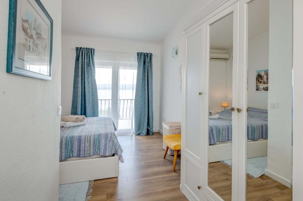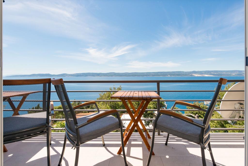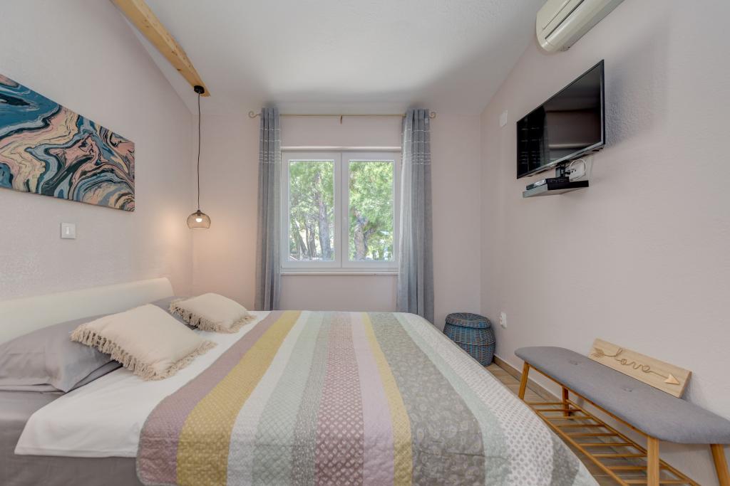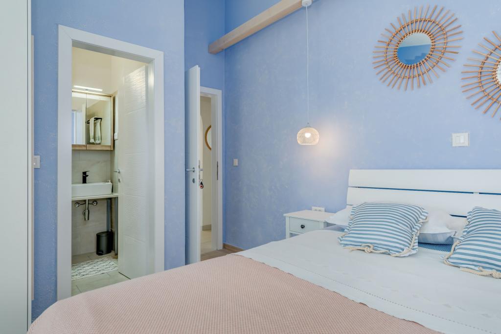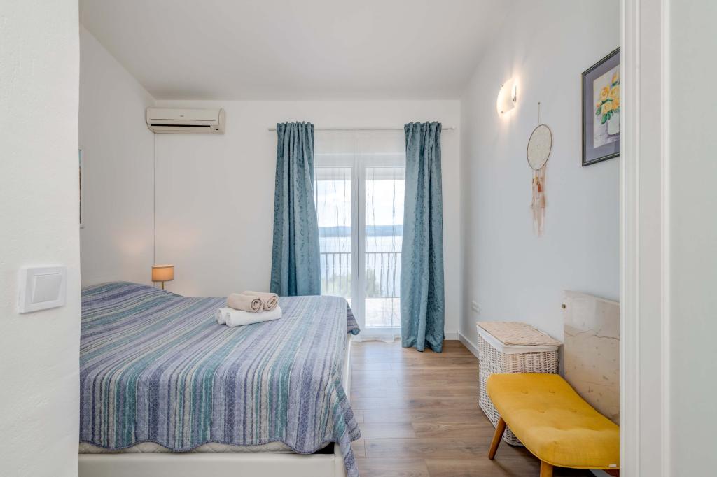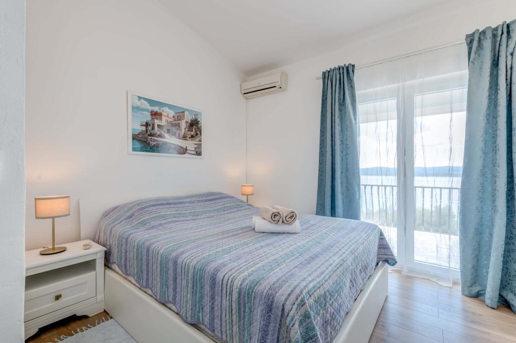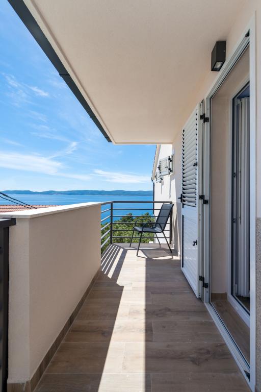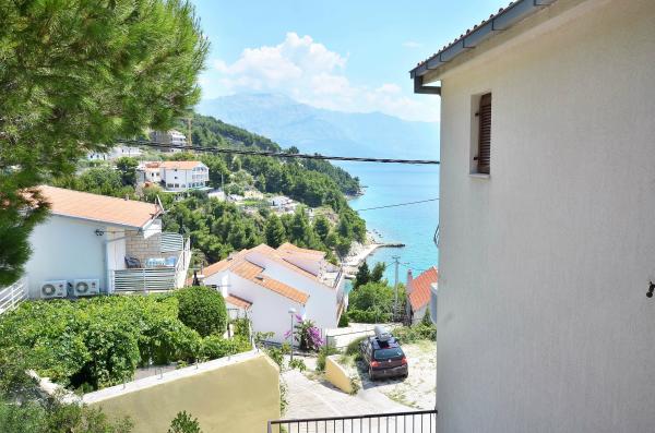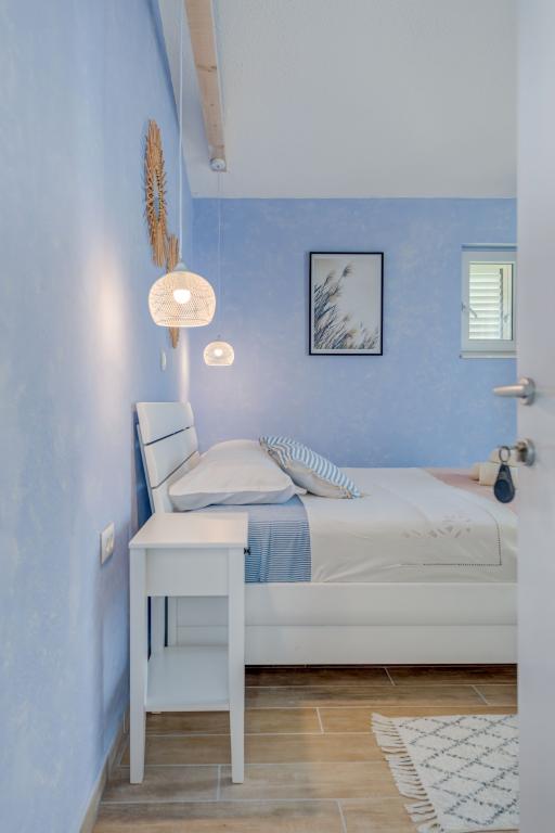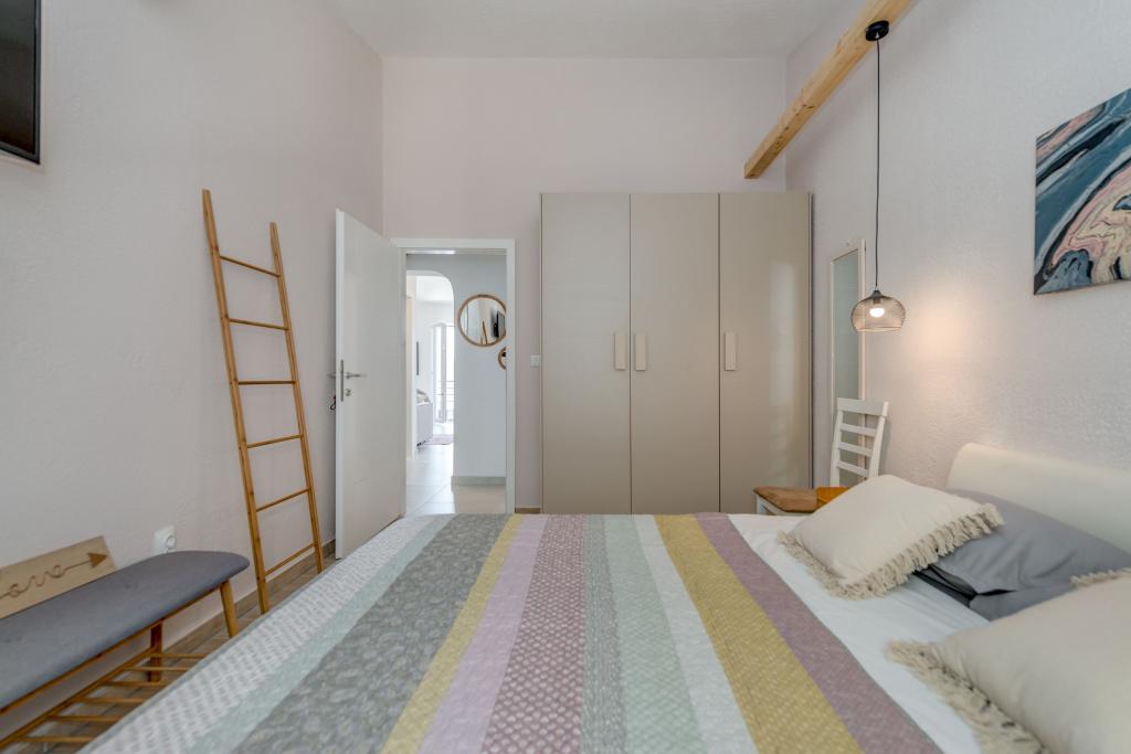 Apartma se nahaja v drugem nadstropju, s skupno površino 90 m2. Ima veliko teraso, ki se nahaja na jugozahodni strani v velikosti cca. 50m2. Apartma ima dve spalnici in dve kopalnici, popolnoma opremljeno kuhinjo in prostorno dnevno sobo. Ena soba ima zakonsko posteljo z dodatnim ležiščem (2 +1), ločeno kopalnico in dostop do prostorno teraso s pogledom na jug. Druga spalnica je obrnjen proti severu je borov gozd zakonsko posteljo. Kuhinja in dnevna soba razteza od severa proti jugu v liniji. S popolnoma opremljeno kuhinjo (hladilnik, štedilnik - pečica, mikrovalovna pečica, pomivalni stroj, kavni avtomat, itd ...), je miza s šestimi stoli. Dnevna soba je opremljena z dvema zofe in fotelj, iz katerega čudovit pogled na morje. Ob izhodu iz dnevne sobe pridete na veliko teraso, ki je 4,5 metra širok in dolg 10 metrov, z veliko mizo za 6 oseb, udobno sedenje in kaminom.