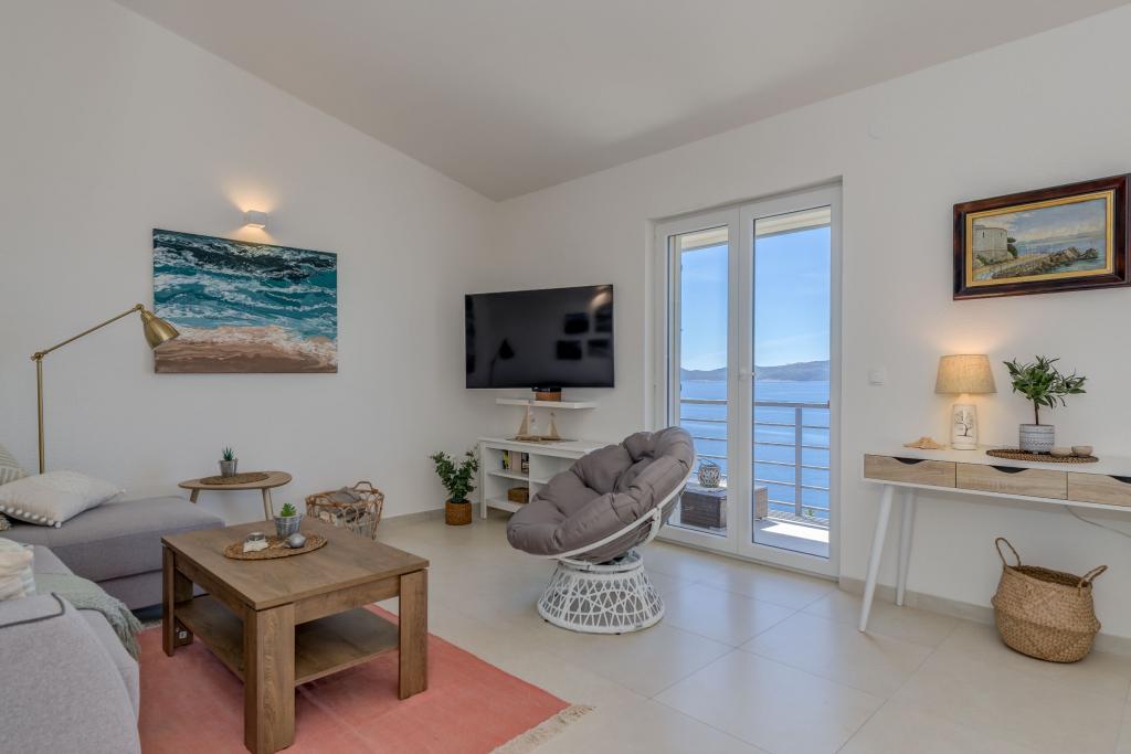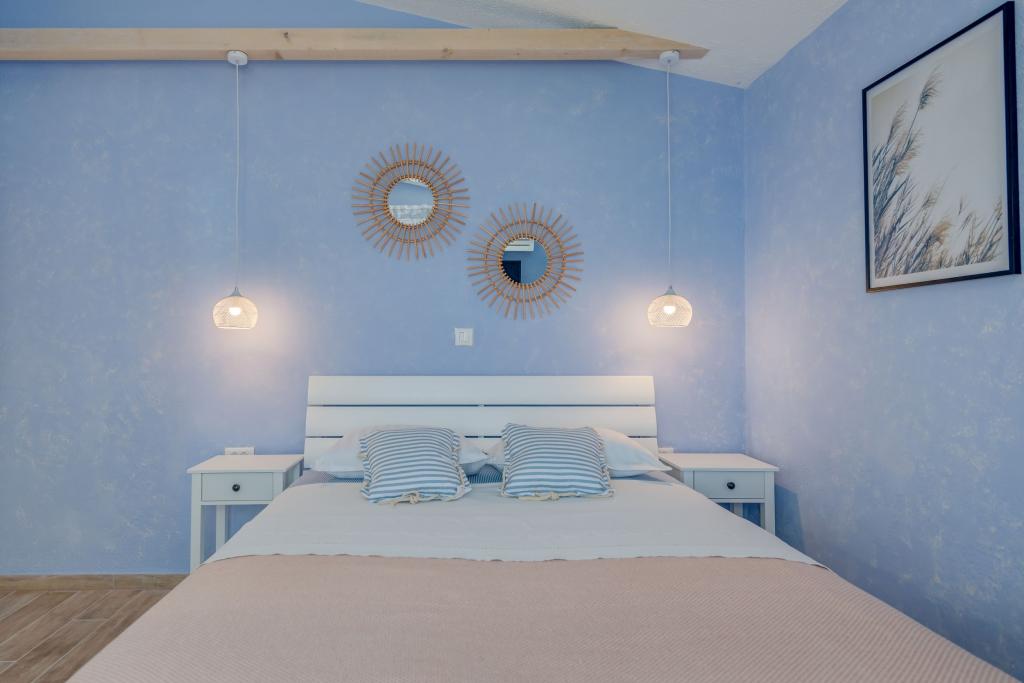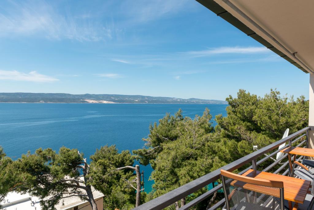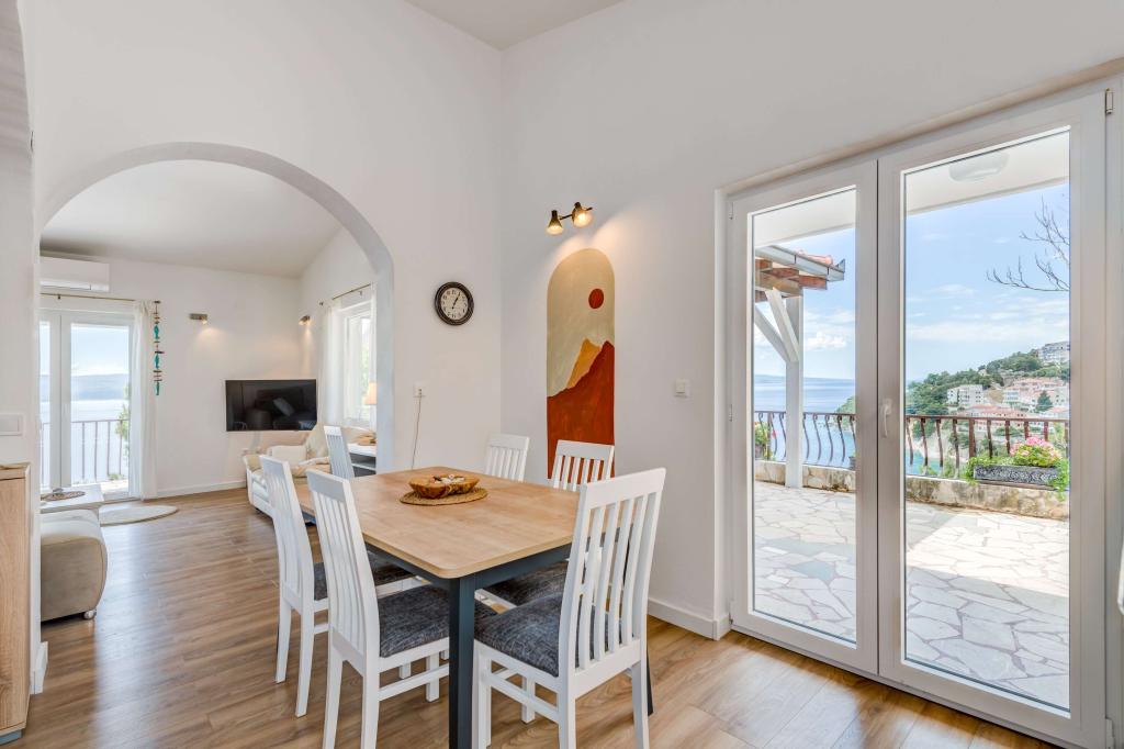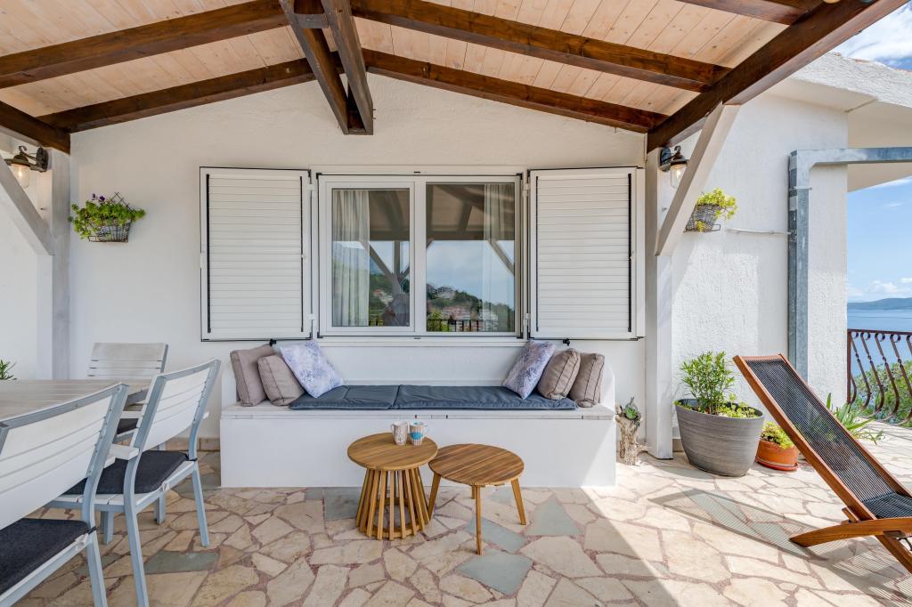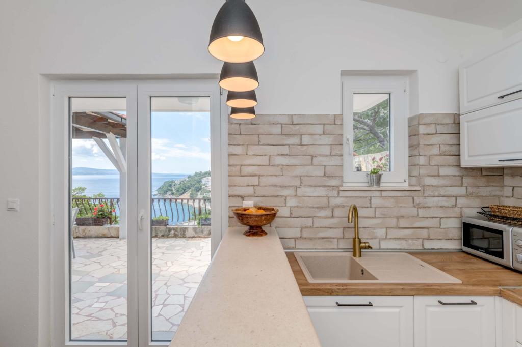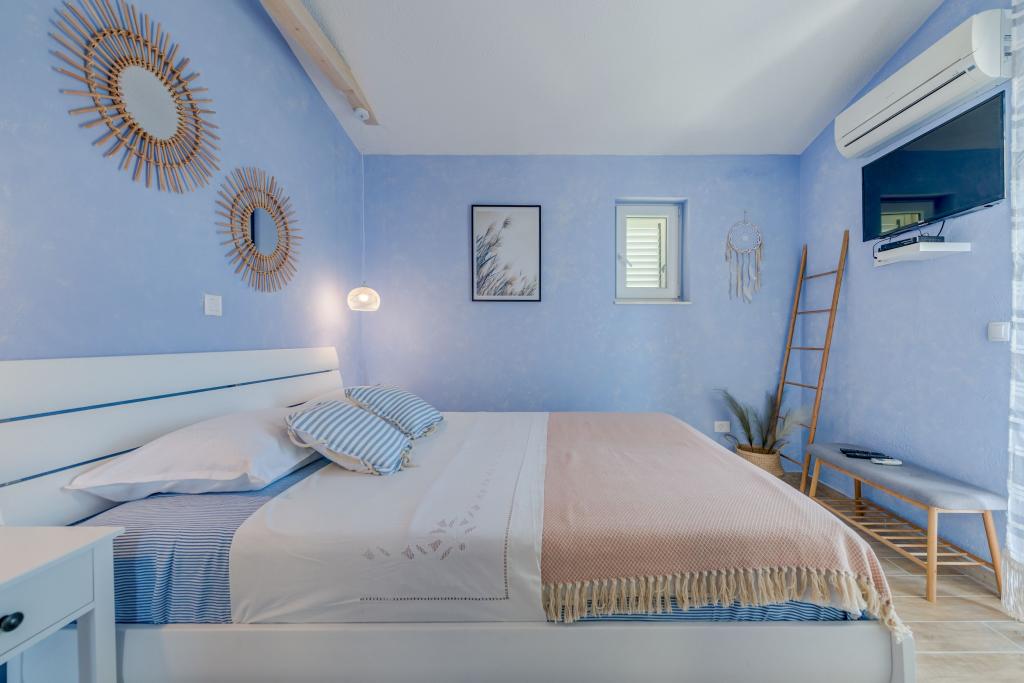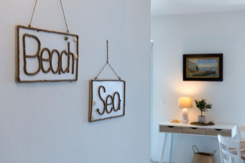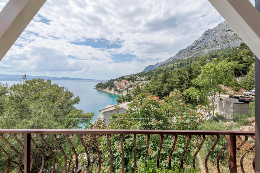 Apartma se nahaja v drugem nadstropju, s skupno površino 90 m2. Ima veliko teraso, ki se nahaja na jugozahodni strani v velikosti cca. 50m2. Apartma ima dve spalnici in dve kopalnici, popolnoma opremljeno kuhinjo in prostorno dnevno sobo. Ena soba ima zakonsko posteljo z dodatnim ležiščem (2 +1), ločeno kopalnico in dostop do prostorno teraso s pogledom na jug. Druga spalnica je obrnjen proti severu je borov gozd zakonsko posteljo. Kuhinja in dnevna soba razteza od severa proti jugu v liniji. S popolnoma opremljeno kuhinjo (hladilnik, štedilnik - pečica, mikrovalovna pečica, pomivalni stroj, kavni avtomat, itd ...), je miza s šestimi stoli. Dnevna soba je opremljena z dvema zofe in fotelj, iz katerega čudovit pogled na morje. Ob izhodu iz dnevne sobe pridete na veliko teraso, ki je 4,5 metra širok in dolg 10 metrov, z veliko mizo za 6 oseb, udobno sedenje in kaminom.