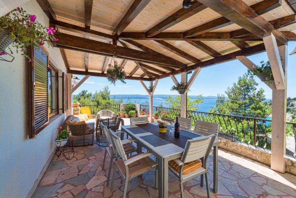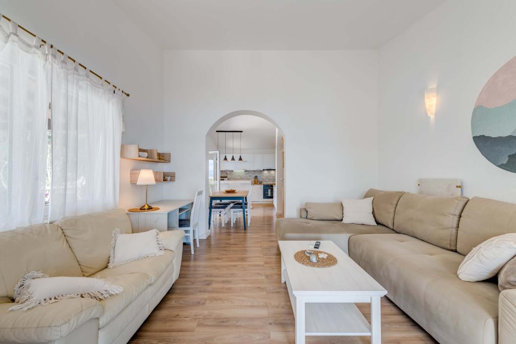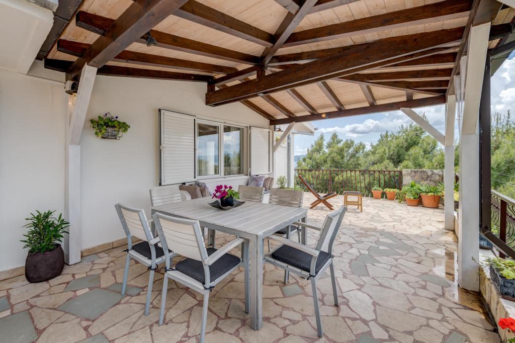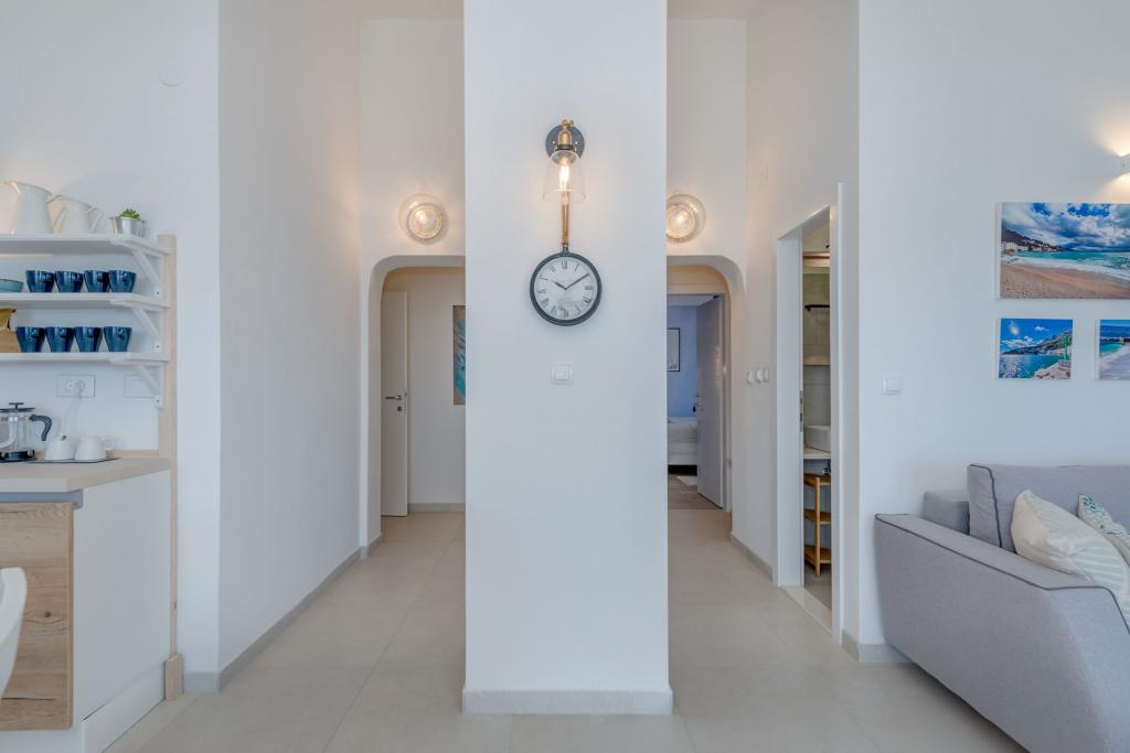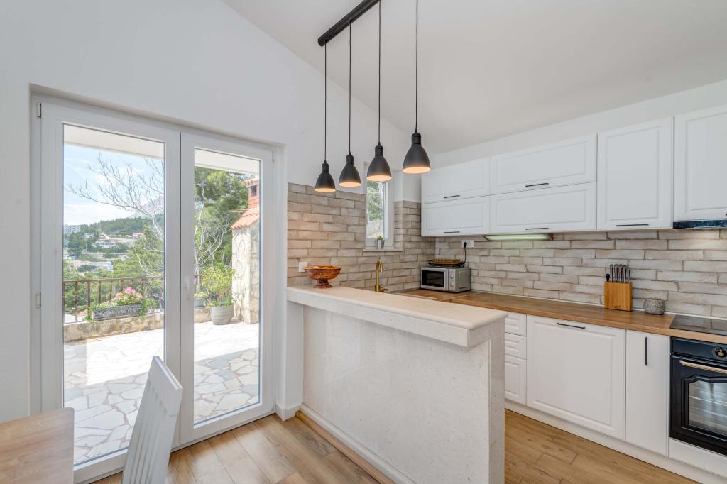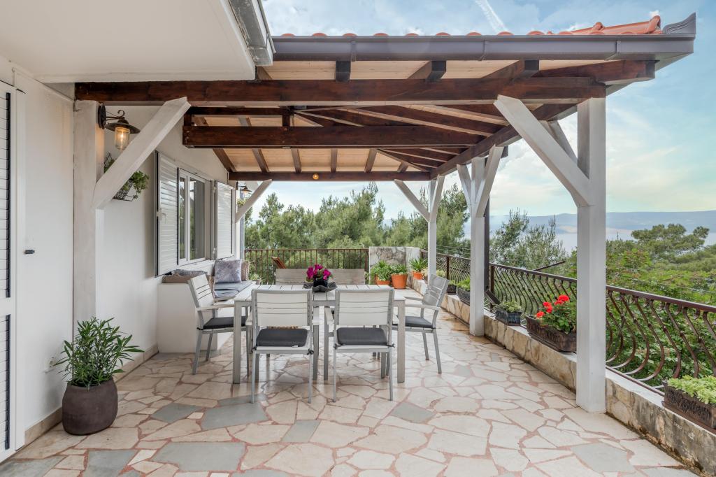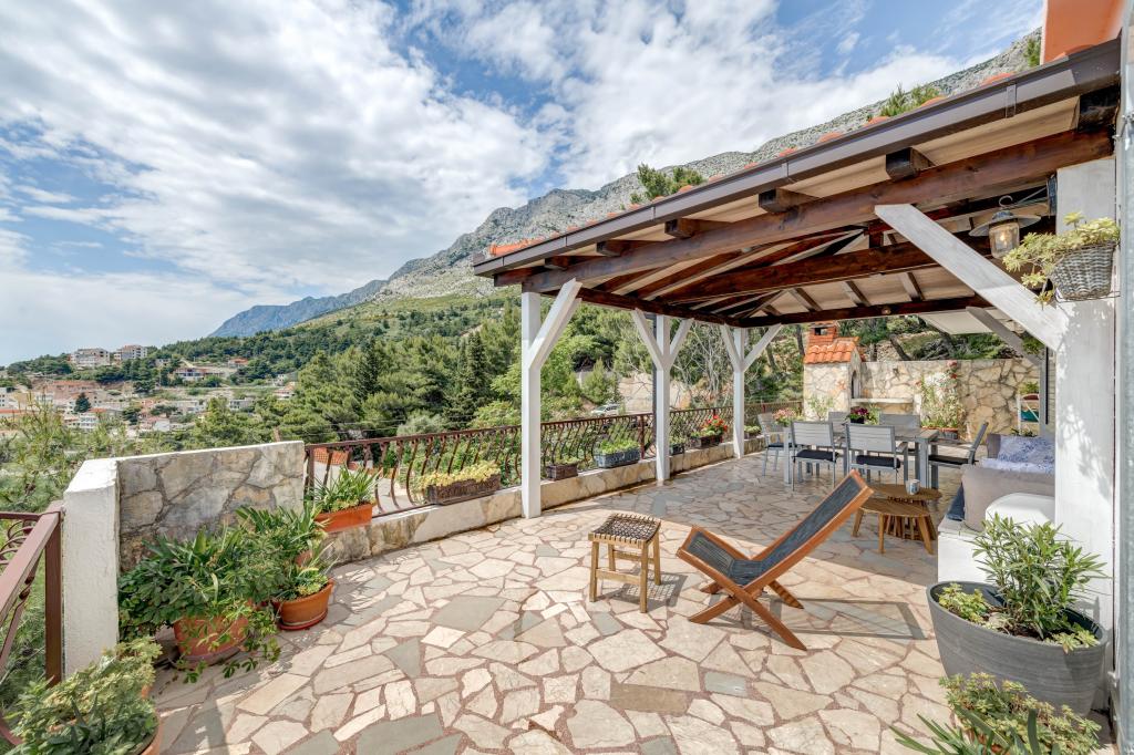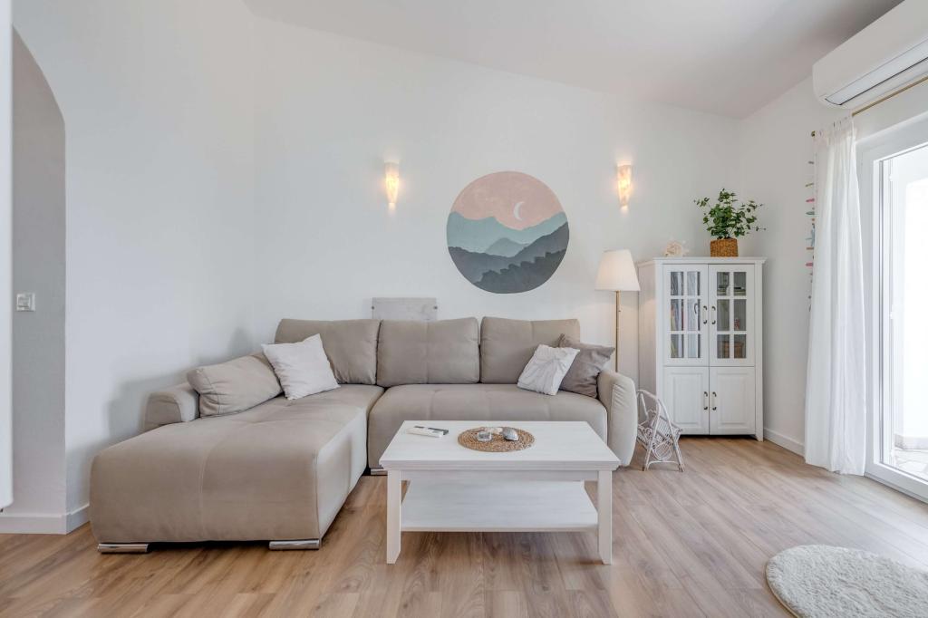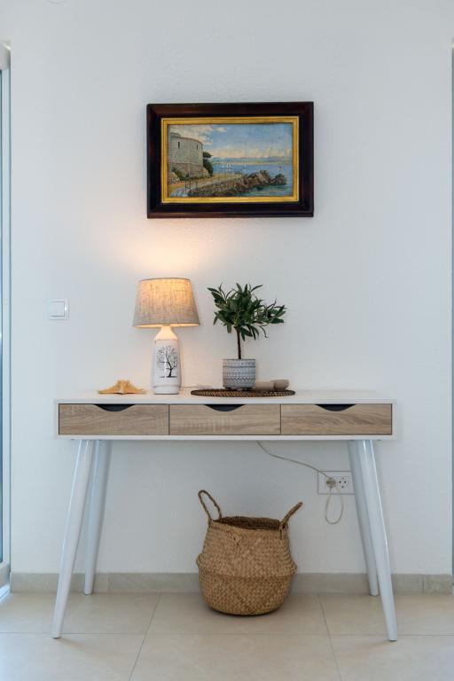 Apartma se nahaja v drugem nadstropju, s skupno površino 90 m2. Ima veliko teraso, ki se nahaja na jugozahodni strani v velikosti cca. 50m2. Apartma ima dve spalnici in dve kopalnici, popolnoma opremljeno kuhinjo in prostorno dnevno sobo. Ena soba ima zakonsko posteljo z dodatnim ležiščem (2 +1), ločeno kopalnico in dostop do prostorno teraso s pogledom na jug. Druga spalnica je obrnjen proti severu je borov gozd zakonsko posteljo. Kuhinja in dnevna soba razteza od severa proti jugu v liniji. S popolnoma opremljeno kuhinjo (hladilnik, štedilnik - pečica, mikrovalovna pečica, pomivalni stroj, kavni avtomat, itd ...), je miza s šestimi stoli. Dnevna soba je opremljena z dvema zofe in fotelj, iz katerega čudovit pogled na morje. Ob izhodu iz dnevne sobe pridete na veliko teraso, ki je 4,5 metra širok in dolg 10 metrov, z veliko mizo za 6 oseb, udobno sedenje in kaminom.