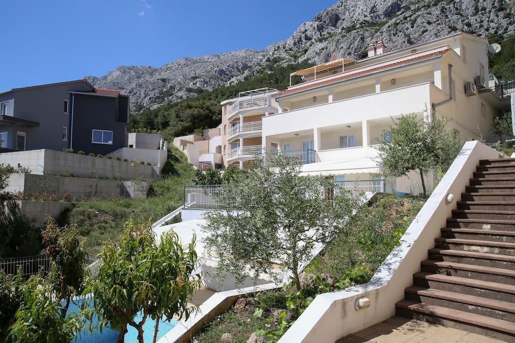 Hiša se nahaja na čudoviti in mirni lokaciji, približno 15 minut hoje do plaže ali 2 minuti vožnje, parkirate pa lahko neposredno na plaži brezplačno. Imamo dva bazena, veliko parkirišče, sobo s pralnimi stroji, žar ... hišni ljubljenčki so dobrodošli, kajenje pa je dovoljeno le zunaj, vsi apartmaji so dobro opremljeni in imajo balkone s pogledom na morje.