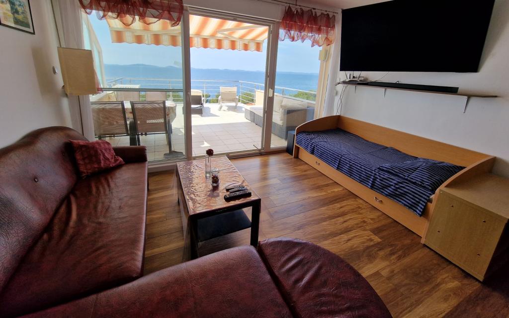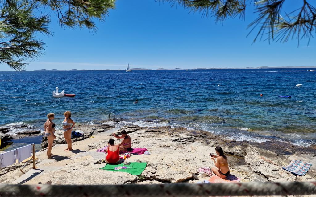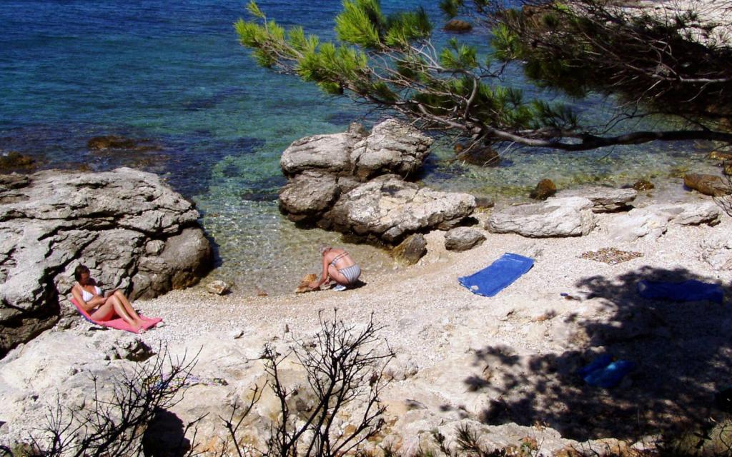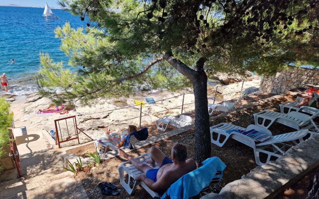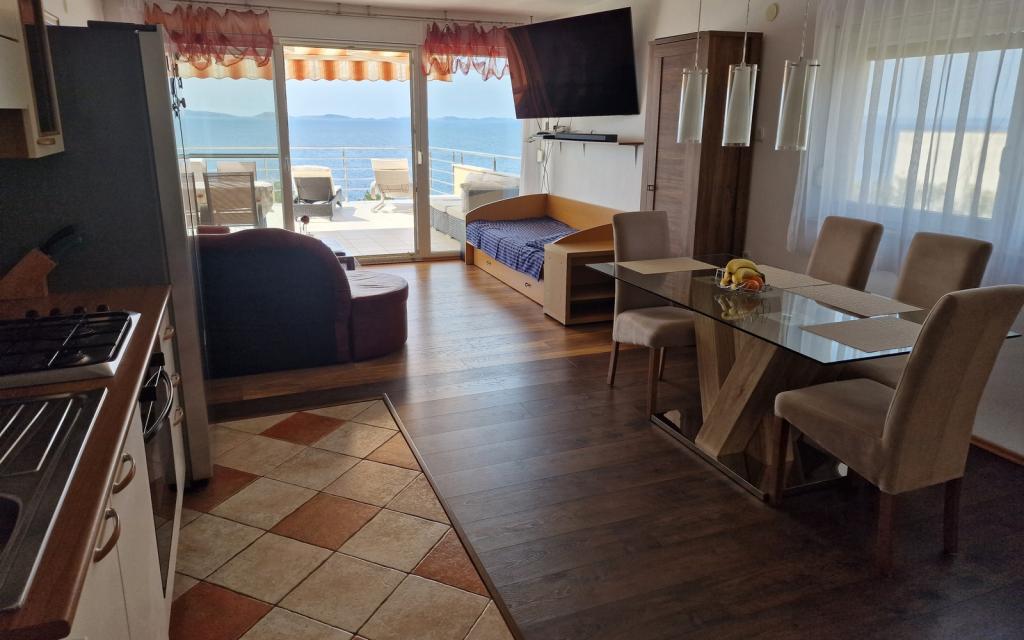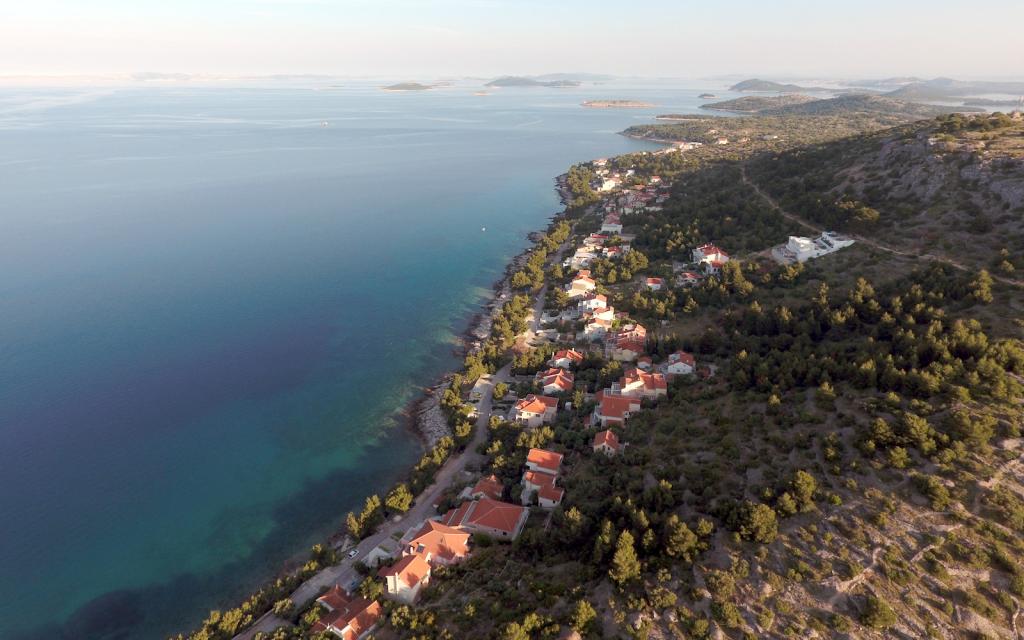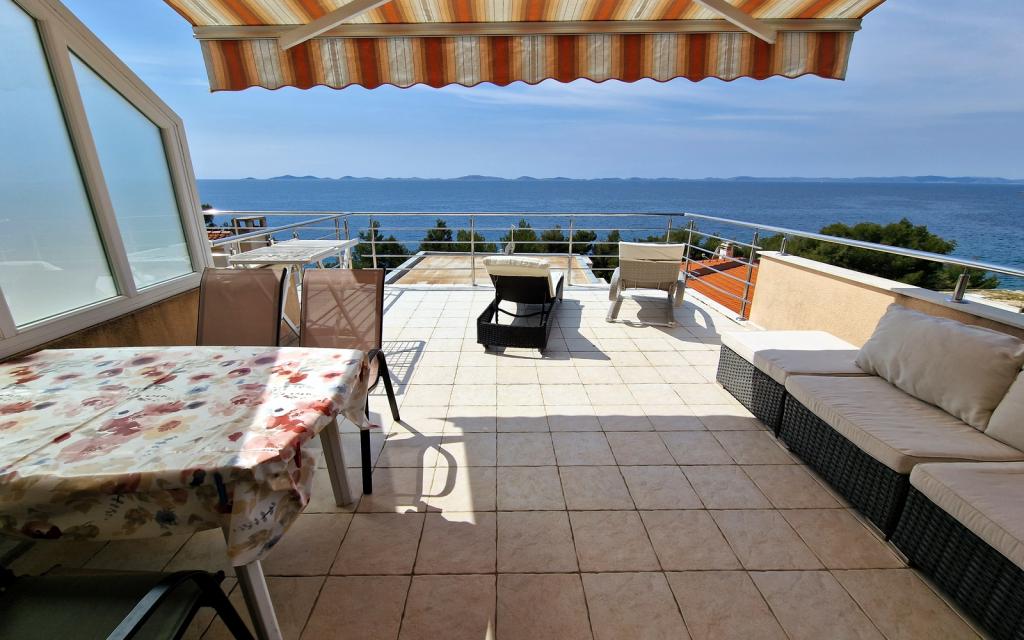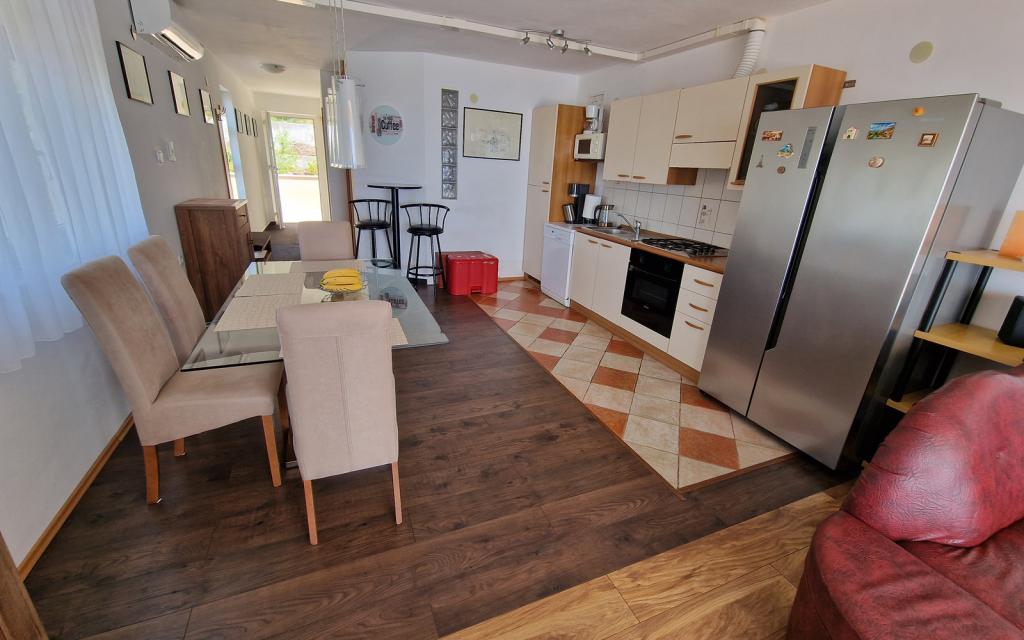 Stanovanje G1 se nahaja na vrhu zgornje hiše na zahodni strani. Ima 50 m2 površine s še 20 m2 terase. Namenjena je udobnemu bivanju 2 do 3 oseb z veliko teraso in panoramskim pogledom na Kornate in odprto morje med Kornati in Murterjem. Stanovanje ima eno spalnico in kopalnico z wc-jem ter en velik skupni prostor vizualno popolnoma odprt na teraso in panoramski pogled na morje. V tem skupnem prostoru je kuhinja z jedilnico in dnevna soba. Stanovanje je opremljeno z zmogljivo klimatsko napravo, WiFi internetom, satelitskimi programi in storitvijo pretakanja (netflix). Poleg apartmaja je na voljo eno parkirno mesto in senčni prostor ob plaži z ležalniki.