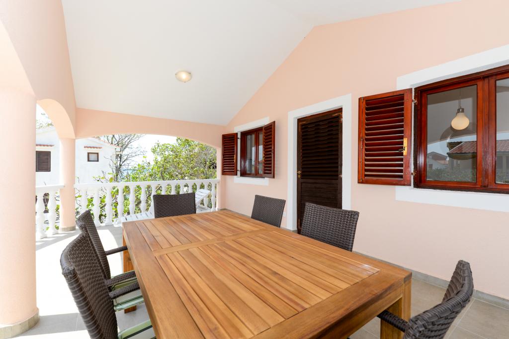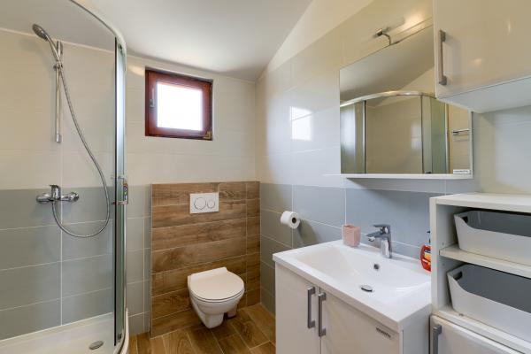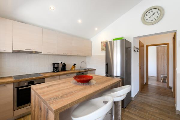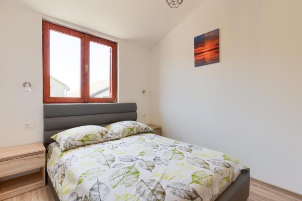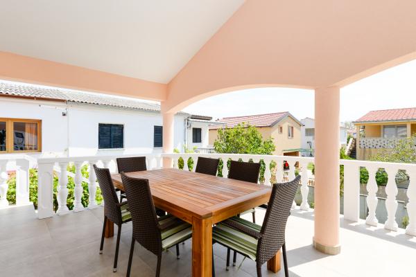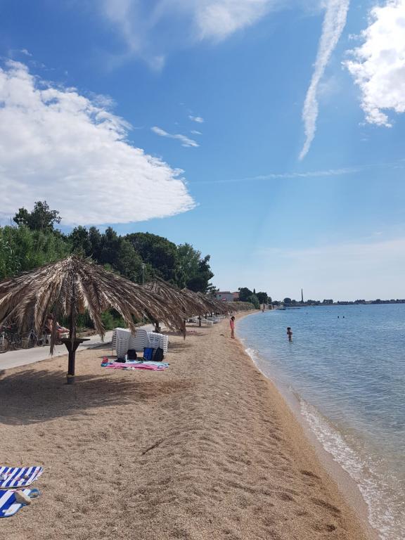 Apartma Ruža je popolnoma in moderno opremljen in se nahaja le 30m od morja, s pogledom na morje. Veliko ograjeno dvorišče, prostorne terase in bližina morja naredijo to mesto idealno za družinske počitnice, predvsem z otroki, pa tudi za vse ostale, ki si želijo mirnih počitnic. Imamo lastno bojo (privez v morju), če imate gliser ali čoln do 7 metrov dolžine tik pod kočo. Za tiste, ki si še vedno želite zabave, je Nin oddaljen le 2 km, otok Vir 15 km, Zadar 20 km. Stanovanje se nahaja v 1. nadstropju s skupno površino 50 m2 s teraso 23 m2. Sodobno opremljen (pomivalni stroj, pralni stroj, klima, kavni aparat), TV, SAT, internet. Parkirišče imate na vrtu stanovanja obdanem z ograjo in zidanim žarom.