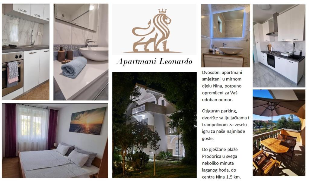 Apartmaji Leonardo se nahajajo v družinski hiši s skupno 3 apartmaji. Hiša se nahaja v mirnem delu mesta, v bližini peščene plaže Prodorica, ki je odlična izbira za družine z otroki. Središče Nina je oddaljeno 15 minut lahke hoje ali 5 minut vožnje z avtomobilom. Apartmaji obsegajo dve spalnici z zakonsko posteljo in dvema ločenima posteljama, kopalnico s kadjo/tušem, popolnoma opremljeno kuhinjo in jedilnico ter zunanjo pokrito teraso. Gostom so na voljo: klima, TV, mikrovalovna pečica, kuhalnik vode, pralni stroj, sušilnik za lase, likalnik, otroška posteljica in krmilnica. Za vsako stanovanje je zagotovljeno parkirišče na dvorišču stavbe.