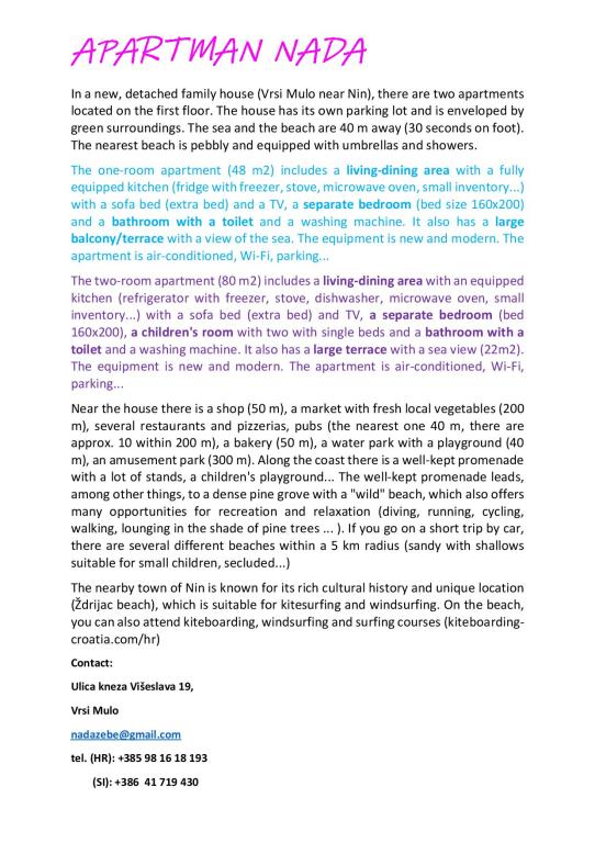 Apartma Nada vam toplo priporočamo. Lep nov, čist, dobro opremljen apartma, blizu morja, lep vrt. Čista plaža in morje. V bližini so trgovine, pekarna in restavracije. Zelo prijetni, prijazni, ustrežljivi lastniki. Dobra lokacija za izlete v okolico Nina, Vira, Zadra, okoliških plaž. V neposredni bližini apartmaja je borov gozd, primeren za sprehod. Hvala za lep podaljšan vikend.