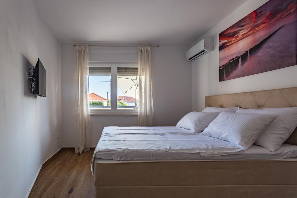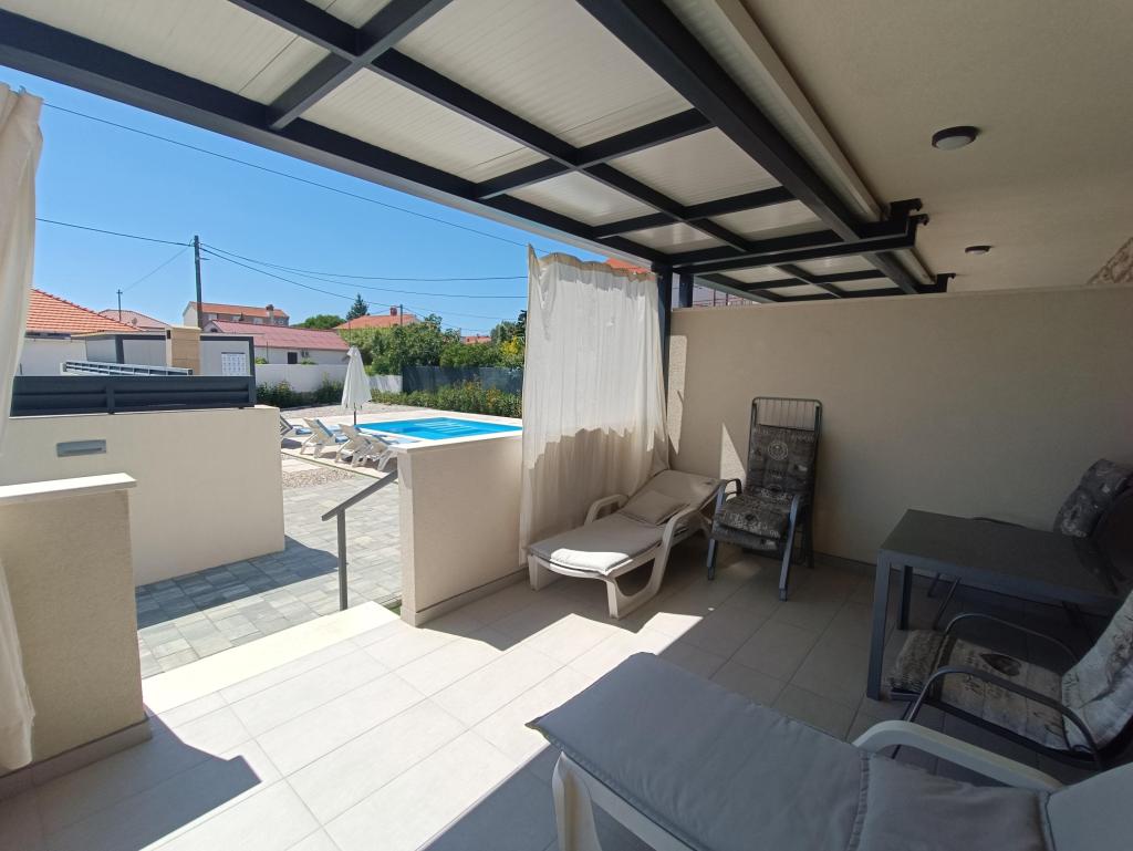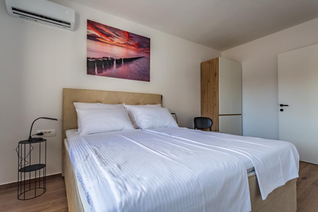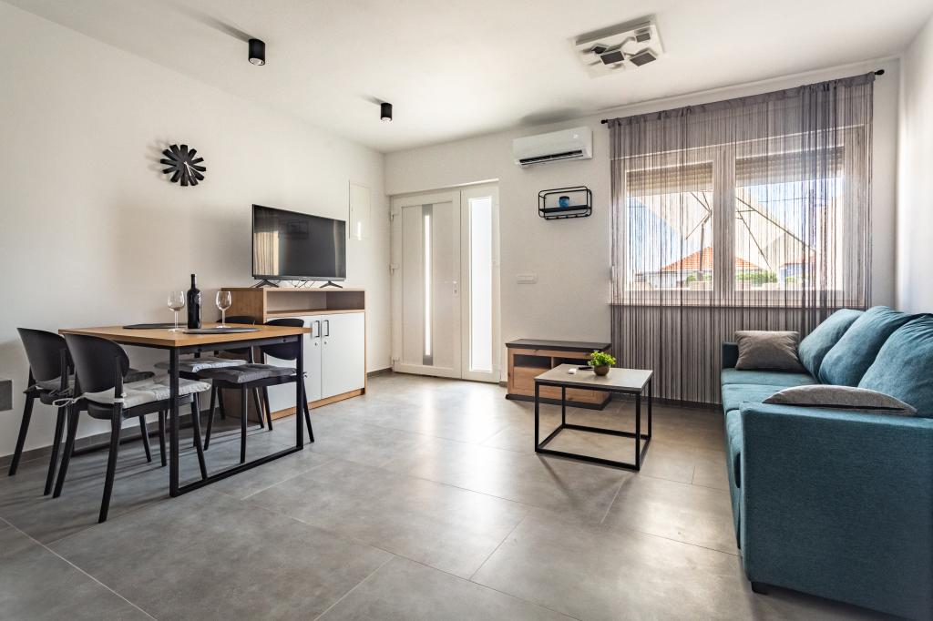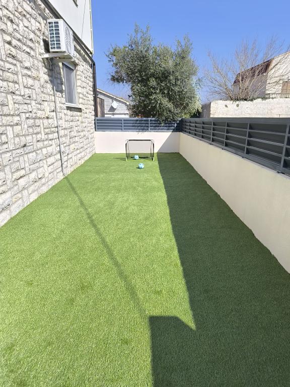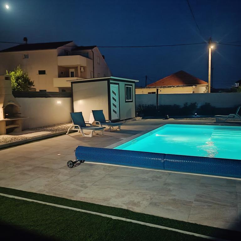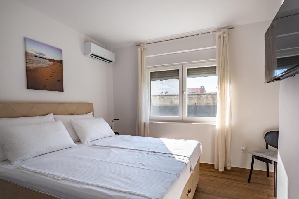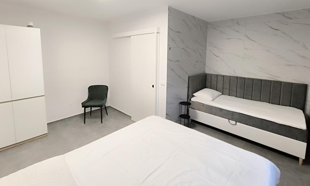 Ogrevan bazen (zaprt 15.10. 2025 - 1.5. 2026) Dobrodošli v apartmajih Royal Place, ki se nahajajo v očarljivem kraljevem mestu Nin, le 16 km od zgodovinskega mesta Zadar. Ponujamo vam dva luksuzna apartmaja. Enosobni (družinska soba, zakonska postelja + enojna postelja) in dvosobni apartmaj v pritličju na mirni lokaciji, le 200 metrov od slikovite obmorske promenade, lokalnih restavracij in centra mesta. Plaža je oddaljena 700 metrov. Veliko nadstropje stavbe vključuje mirno, ograjeno dvorišče, polno bujnega sredozemskega rastlinja. Poleg tega je na voljo ogrevan bazen s slano vodo, prostor za sončenje z ležalniki in senčniki, zunanji tuš, žar. Zgornje nadstropje stavbe nima dostopa.