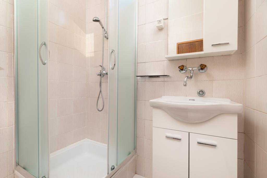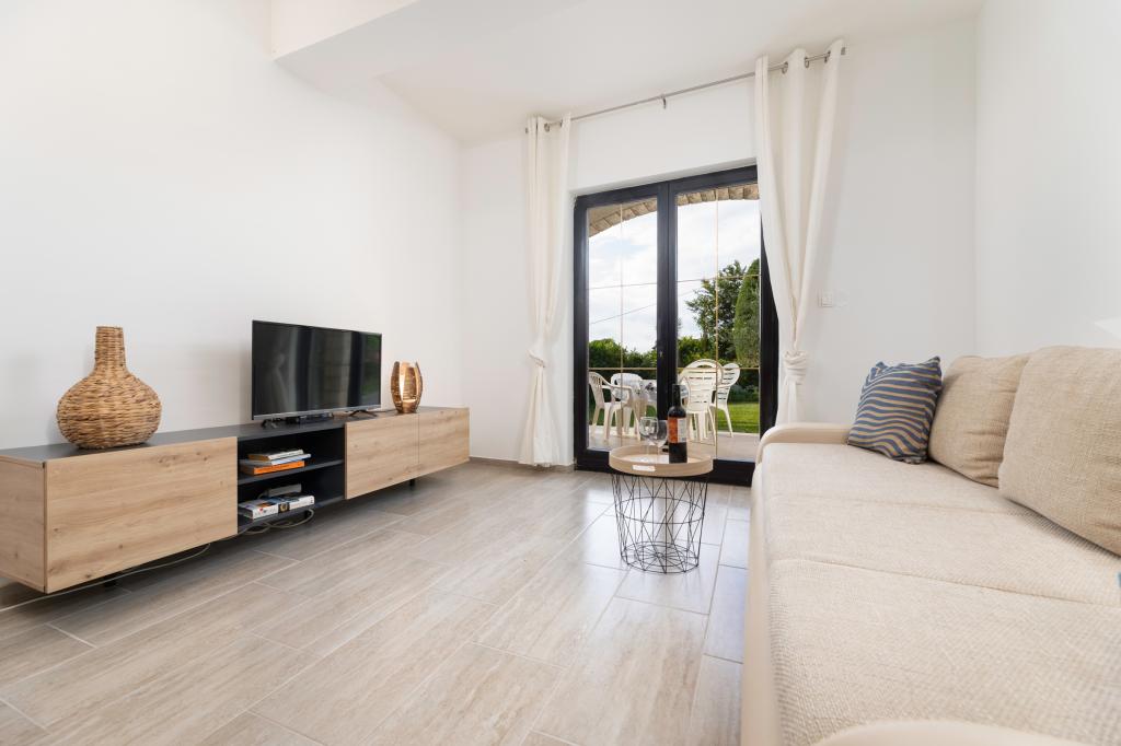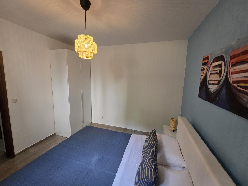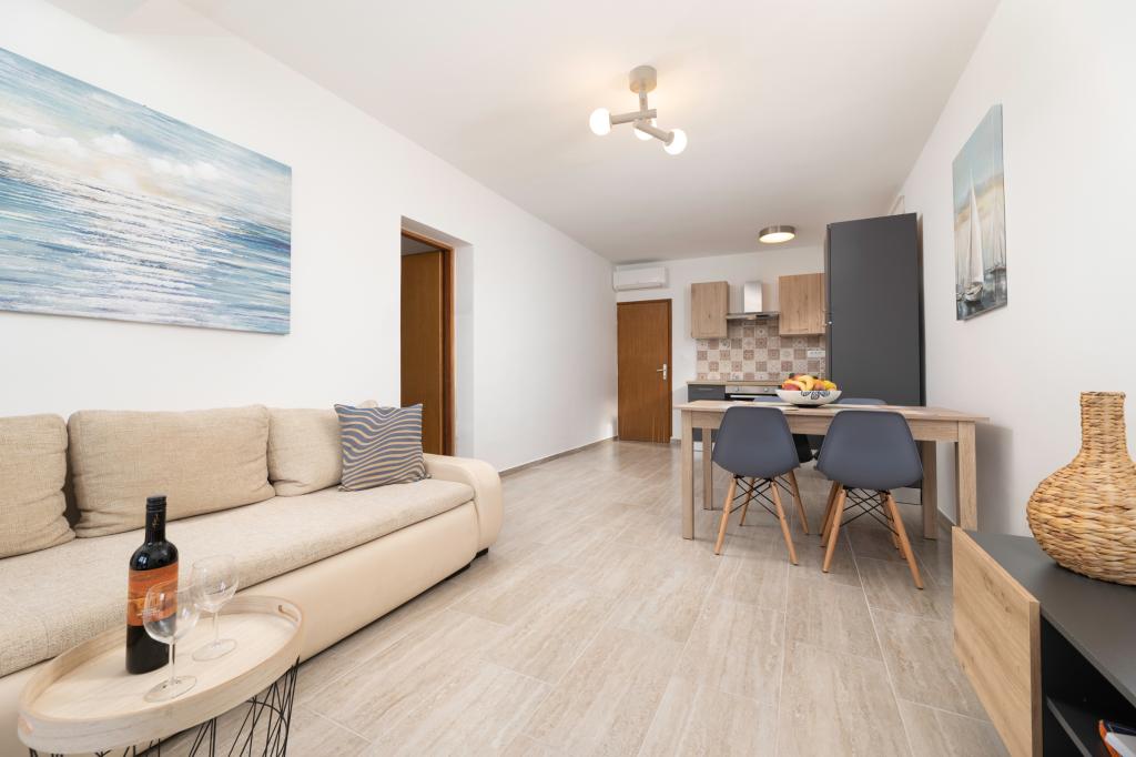 Apartma se nahaja 200 m od morja. Leta 2025 je bil popolnoma prenovljen in opremljen z novim pohištvom. Apartma ima dva zasebna vhoda, dve spalnici, dve kopalnici, dnevno sobo s kuhinjo in jedilnico, pokrito in nepokrito teraso. Dodatno ležišče za otroke do 18 let. Skupna površina je 64 m2. Parkirišče za tri avtomobile se nahaja znotraj stavbe in je brezplačno. Hišni ljubljenčki so dovoljeni po predhodnem dogovoru in pod stalnim nadzorom lastnika. Možni so dodatni stroški.