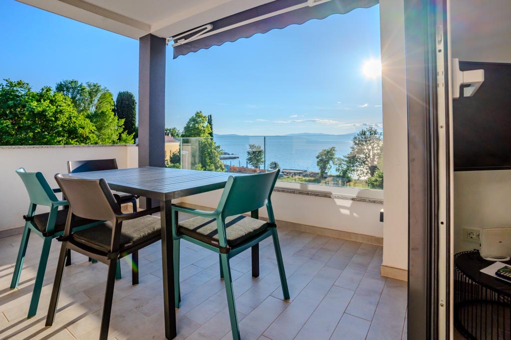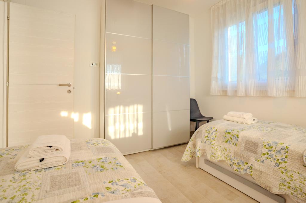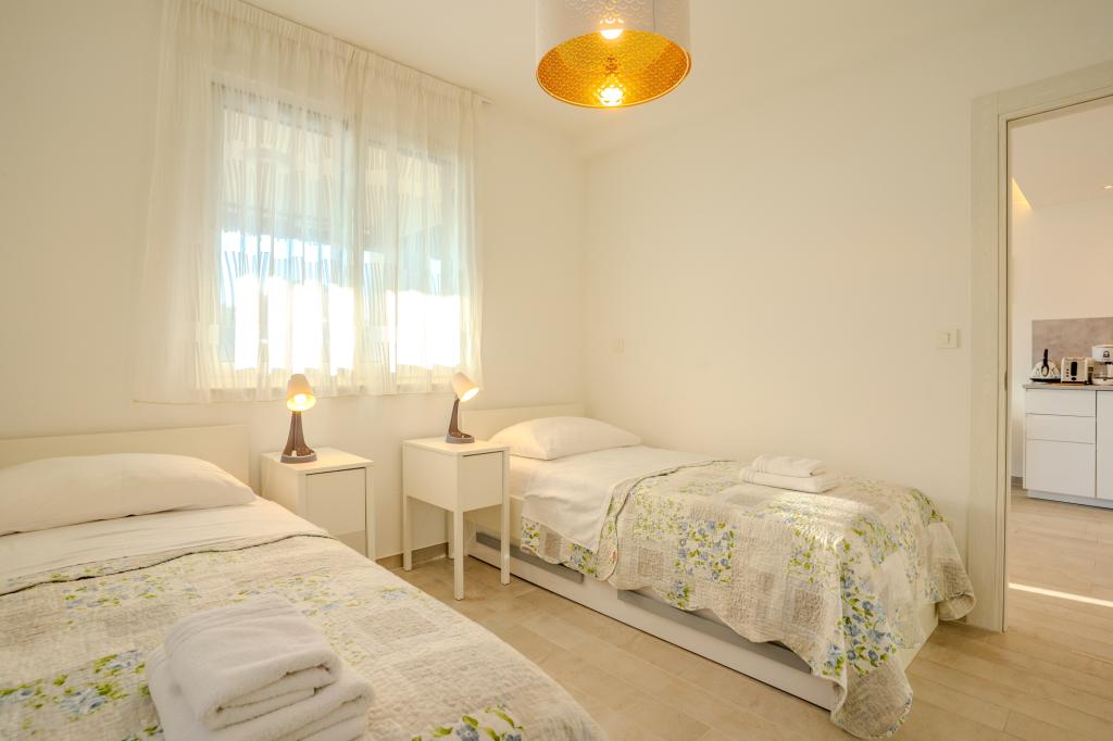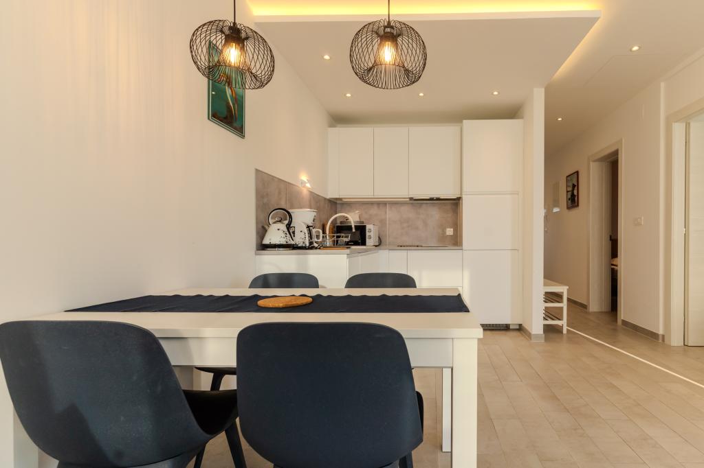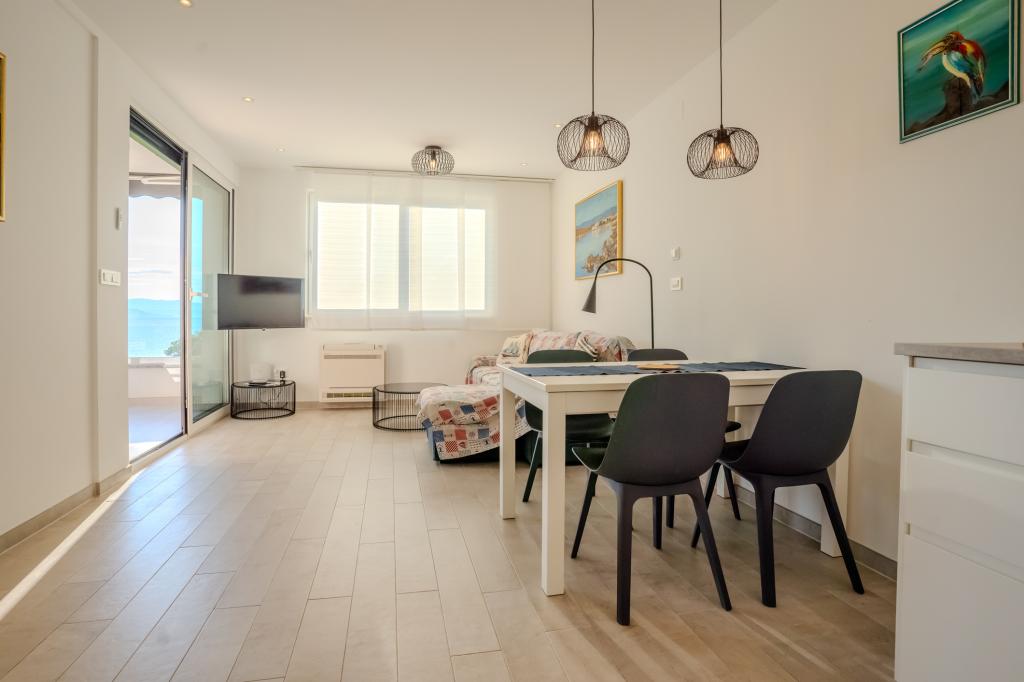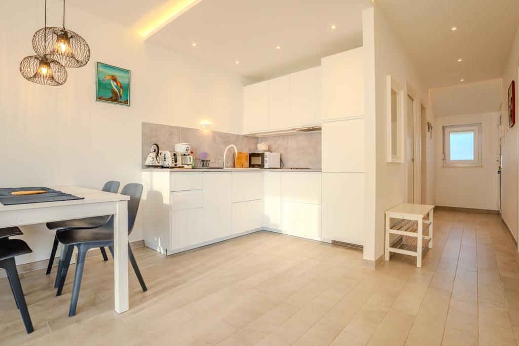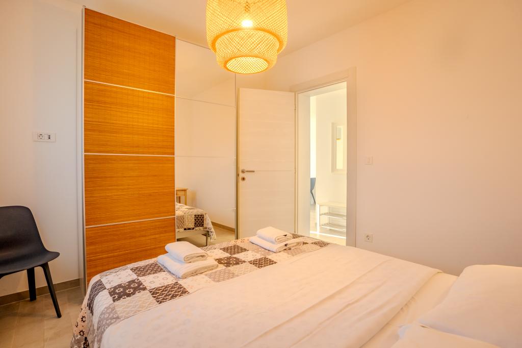 Moderno opremljen apartma v mirnem predelu, v prvi vrsti ob morju. Nepremičnina se nahaja 2 minuti hoje od plaže, trgovin in centra. Apartma je nov in opremljen z novim pohištvom. Ima dve spalnici, kopalnico, dnevno sobo s kuhinjo in jedilnico ter pokrito teraso. Skupna površina je 68 m2. Parkirišče za tri avtomobile se nahaja na dvorišču nepremičnine in je brezplačno.