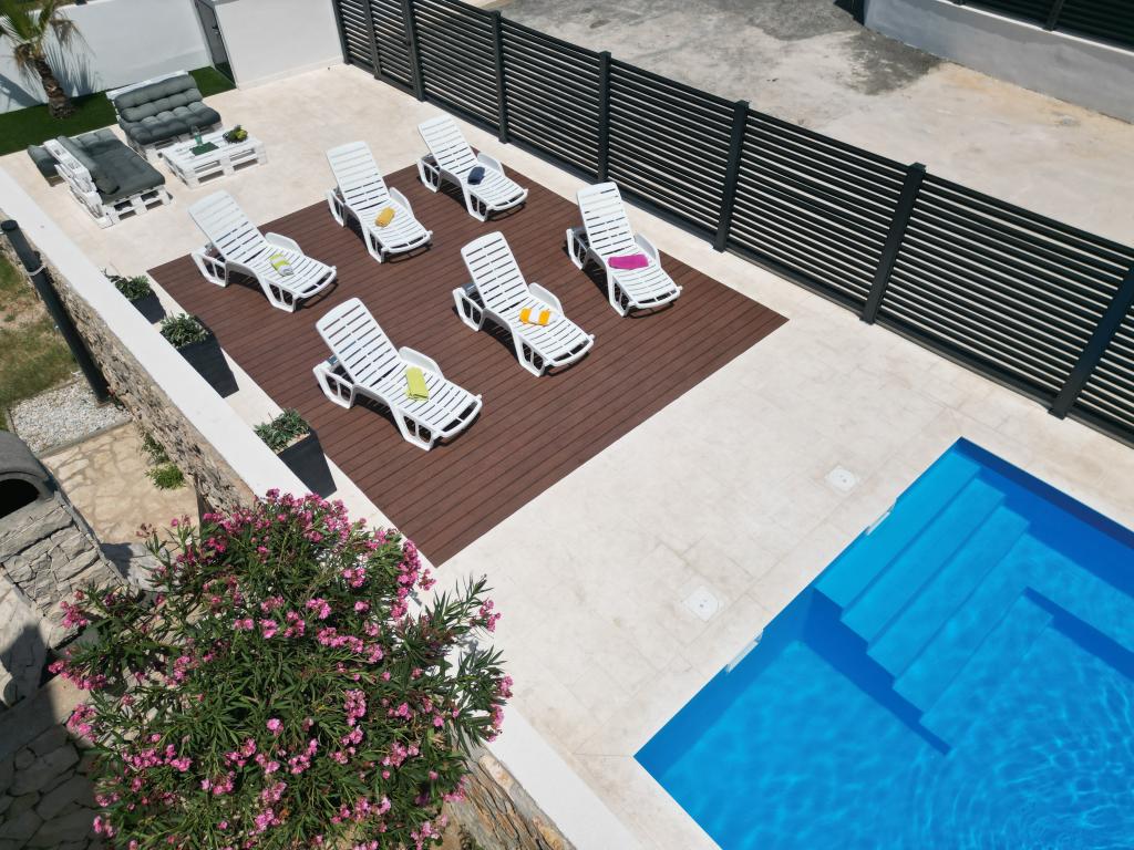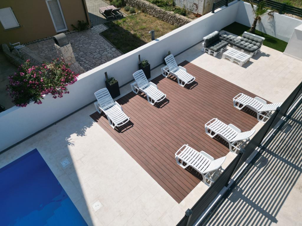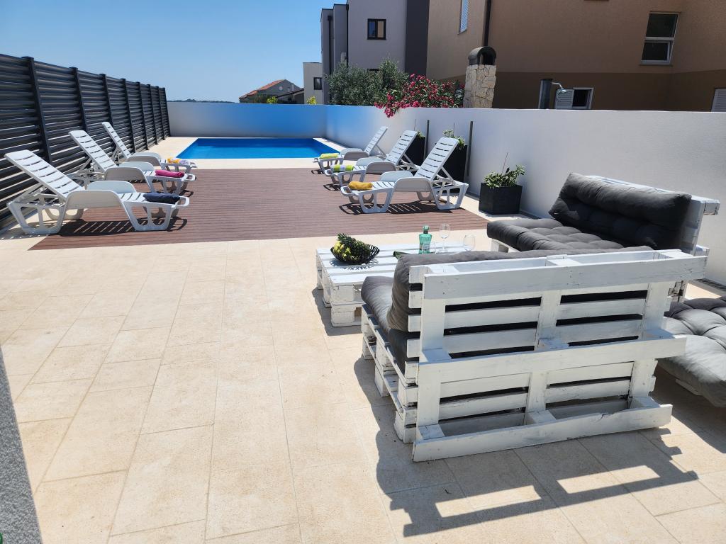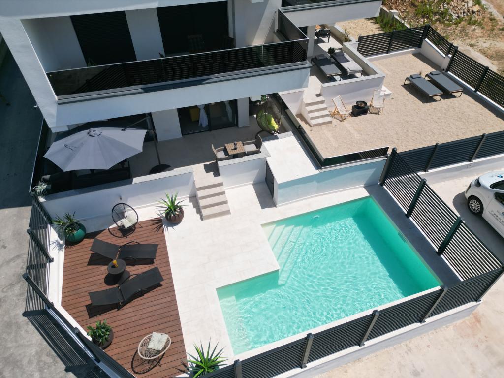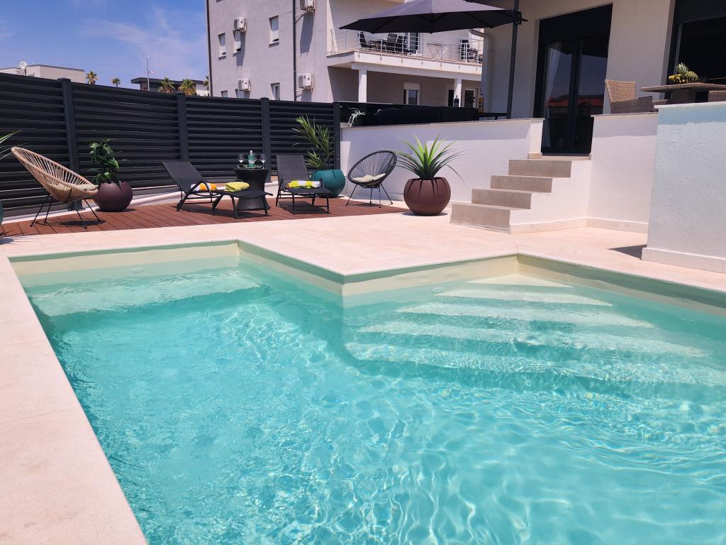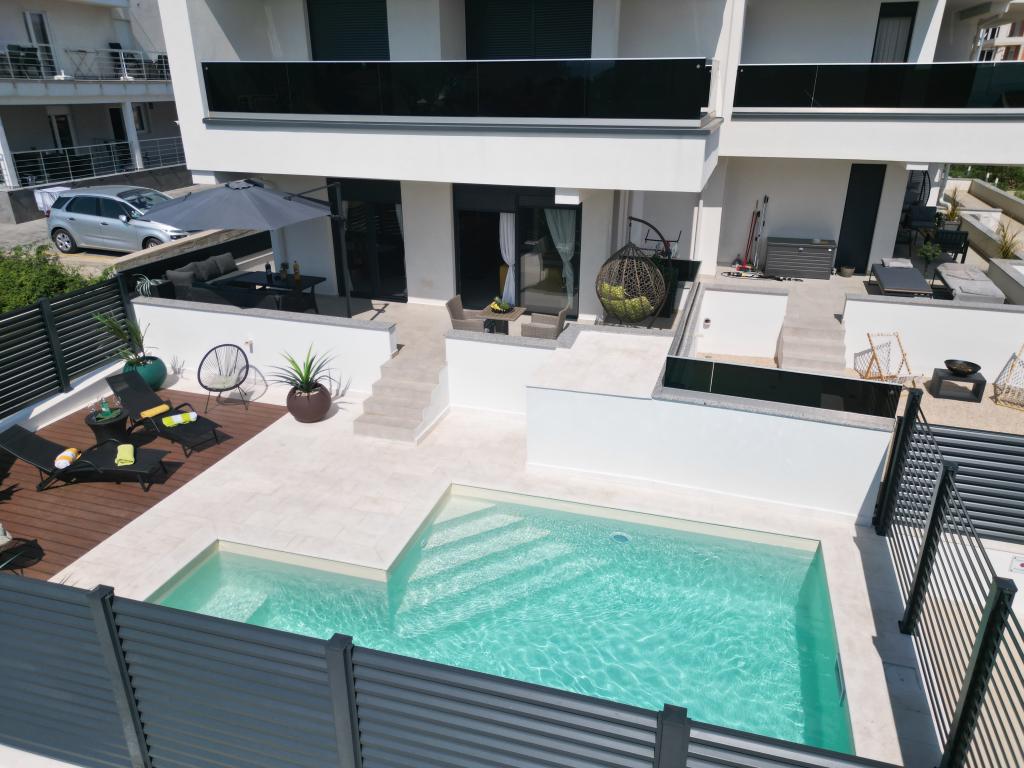 Apartmaji Calma se nahajajo na mirni lokaciji v Novalji in vsak apartma ima svoj zasebni bazen. Od centra so oddaljeni le 900 m, tako da lahko uživate v tišini in ste blizu vseh ugodnosti, ki jih to mesto ponuja. Manj kot 10 minut vožnje do festivala - 2,4 km od prizorišča. Na avtobusni postaji je avtobus, ki vozi neposredno do plaže Zrće. Apartmaji se nahajajo v novi moderni stavbi (z 8 apartmaji). Nudimo 2 apartmaja, od katerih je eden A4+2 in drugi A6+4, vsak od teh apartmajev ima svoj zasebni bazen. Vsak apartma je klimatiziran in ima brezplačen Wi-Fi, SAT/TV, opremljeno kuhinjo, dnevno sobo, spalnice in kopalnico. Tudi apartmaji za 6-10 oseb - plus še ena oseba, če je potrebno - imajo vse enake pogoje. Apartmaji imajo čudovite terase ali balkone s pogledom na morje in mesto, opremljeni s sedežno garnituro.