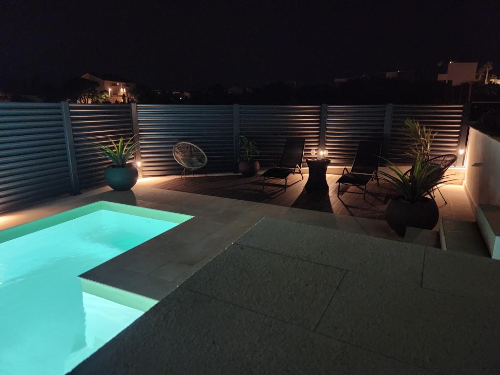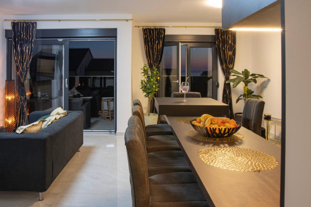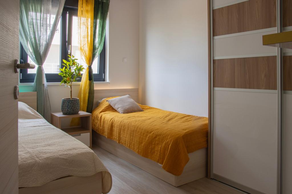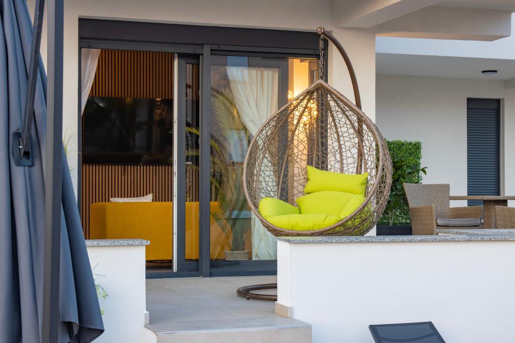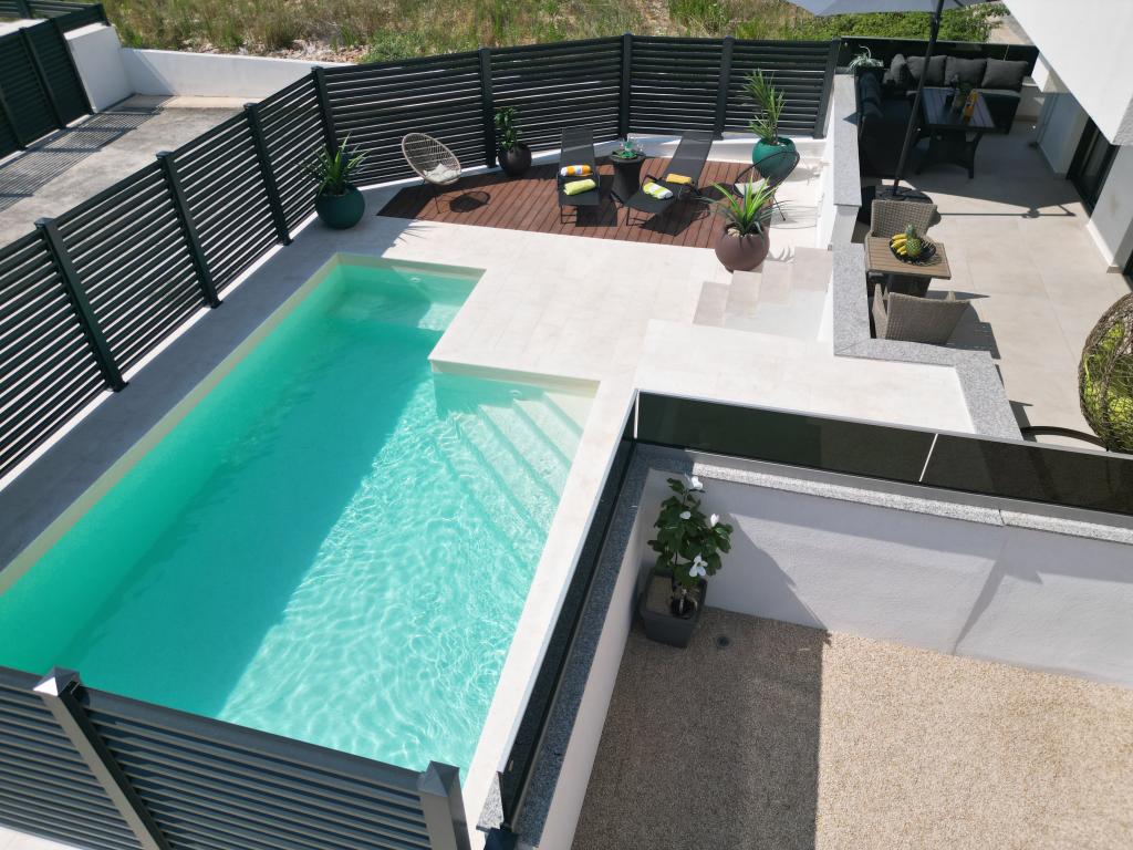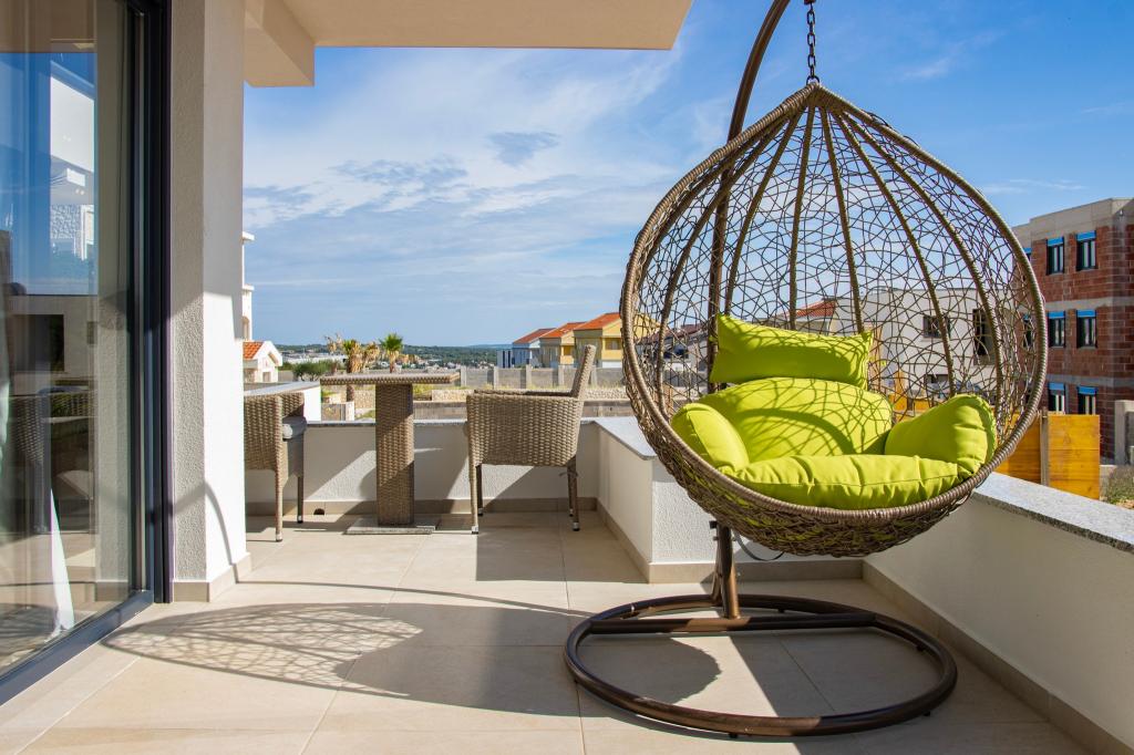 Apartmaji Calma se nahajajo na mirni lokaciji v Novalji in vsak apartma ima svoj zasebni bazen. Od centra so oddaljeni le 900 m, tako da lahko uživate v tišini in ste blizu vseh ugodnosti, ki jih to mesto ponuja. Manj kot 10 minut vožnje do festivala - 2,4 km od prizorišča. Na avtobusni postaji je avtobus, ki vozi neposredno do plaže Zrće. Apartmaji se nahajajo v novi moderni stavbi (z 8 apartmaji). Nudimo 2 apartmaja, od katerih je eden A4+2 in drugi A6+4, vsak od teh apartmajev ima svoj zasebni bazen. Vsak apartma je klimatiziran in ima brezplačen Wi-Fi, SAT/TV, opremljeno kuhinjo, dnevno sobo, spalnice in kopalnico. Tudi apartmaji za 6-10 oseb - plus še ena oseba, če je potrebno - imajo vse enake pogoje. Apartmaji imajo čudovite terase ali balkone s pogledom na morje in mesto, opremljeni s sedežno garnituro.