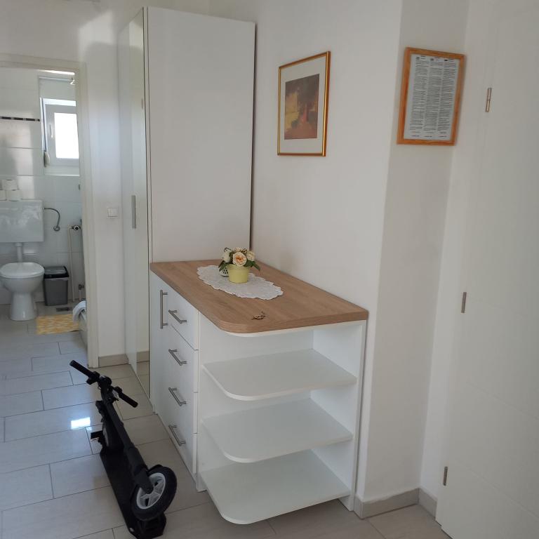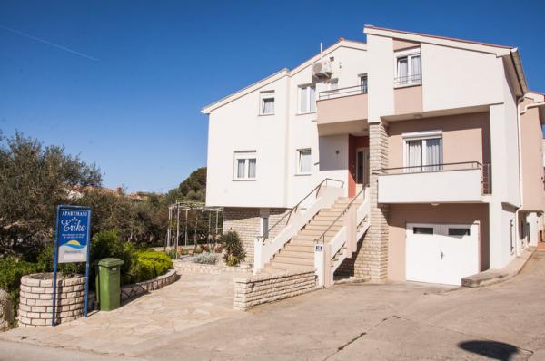 Obdani z zelenjem in sproščenim vzdušjem vas vabimo, da preživite nepozabne počitnice v apartmajih Erika skozi vse leto. Ponujamo možnost zajtrka in uživanja v lokalnih specialitetah: jagnjetini, ribah, rdečem in belem vinu, olivnem olju. Objekt se nahaja 10 minut hoje od centra in 5 minut od plaže. Iskreno upamo, da se boste odločili za počitnice v naših apartmajih, ki so vam na voljo skozi vse leto. Upamo, da boste naši gostje, mi pa vaši gostitelji. Družina Erika Škunca