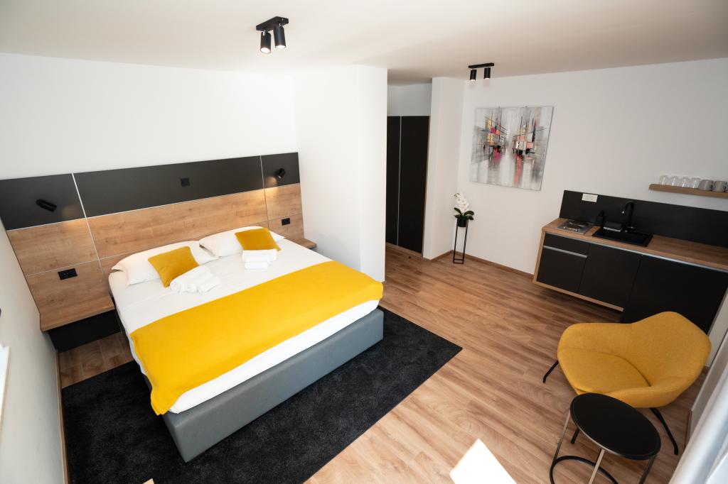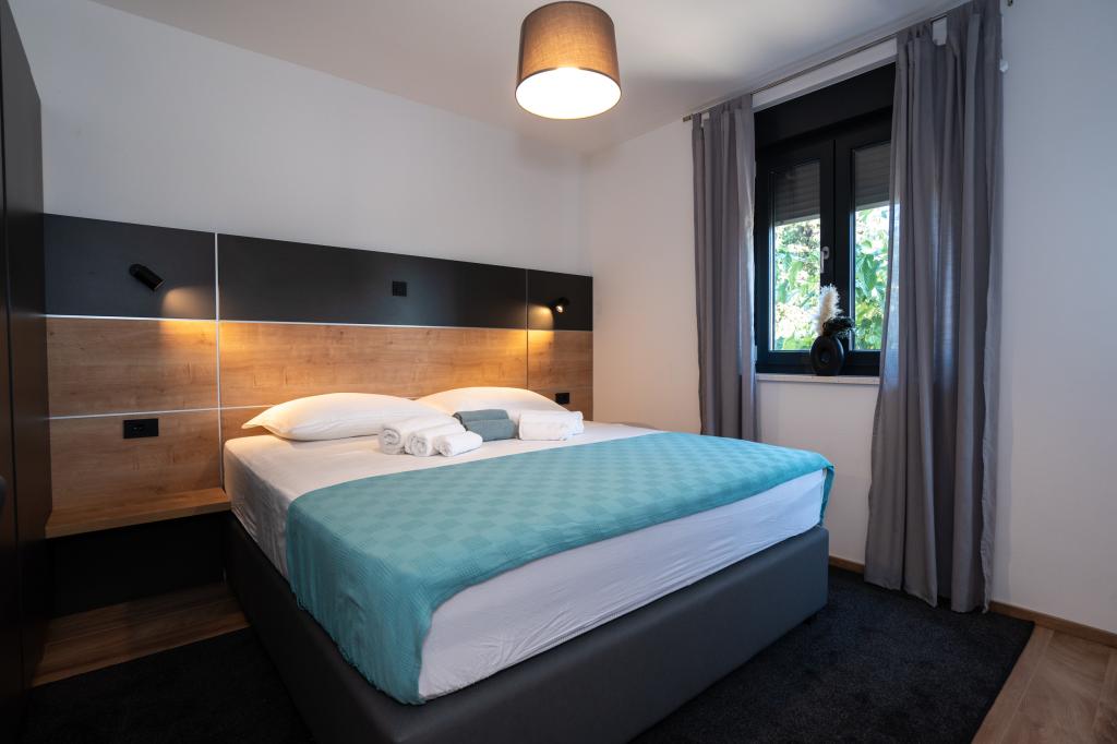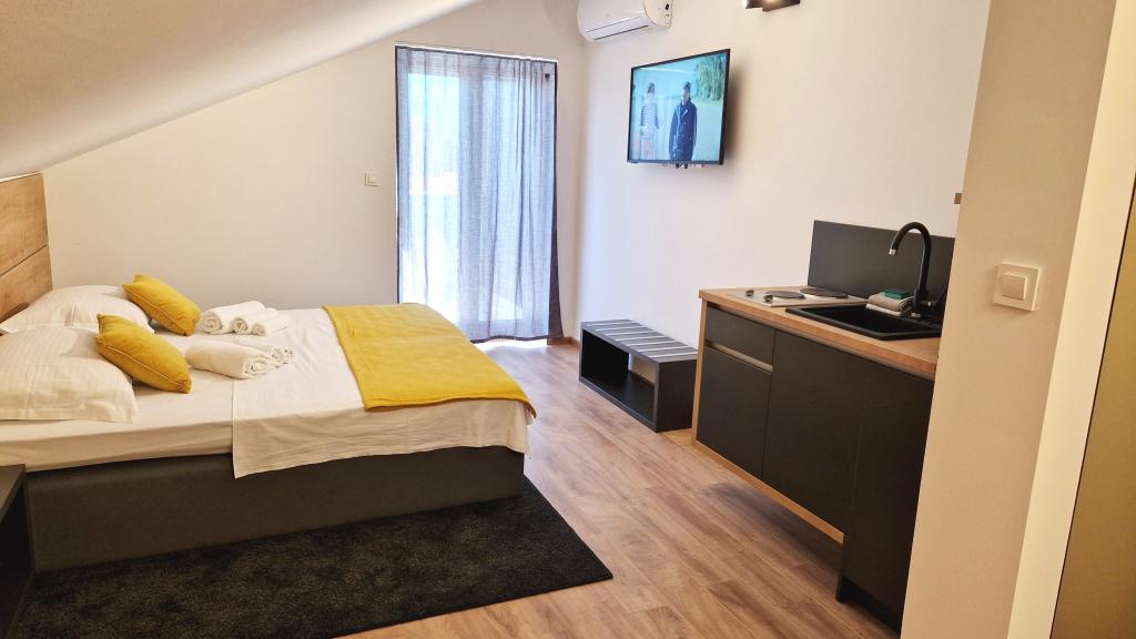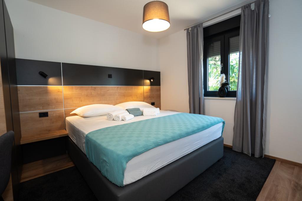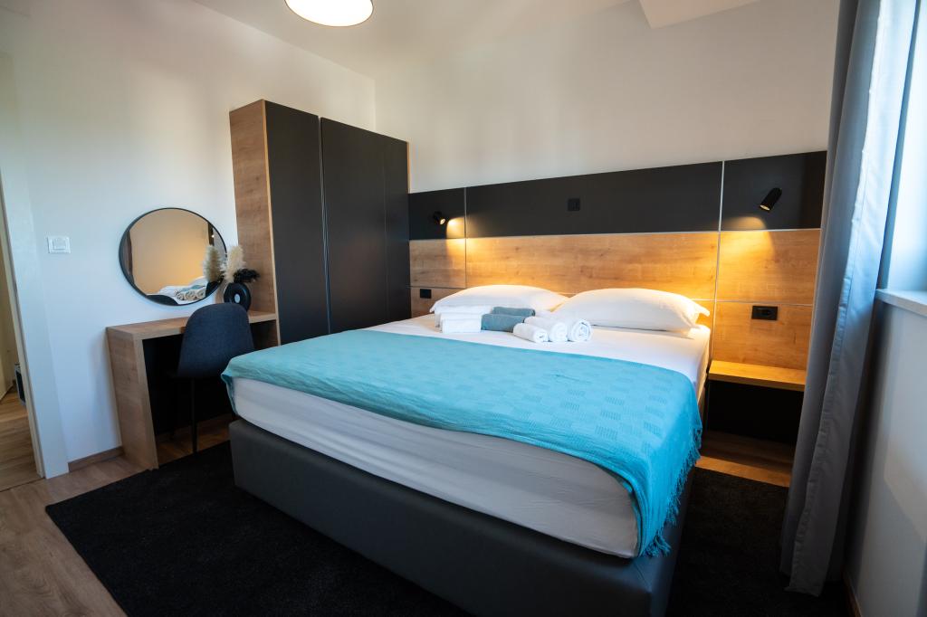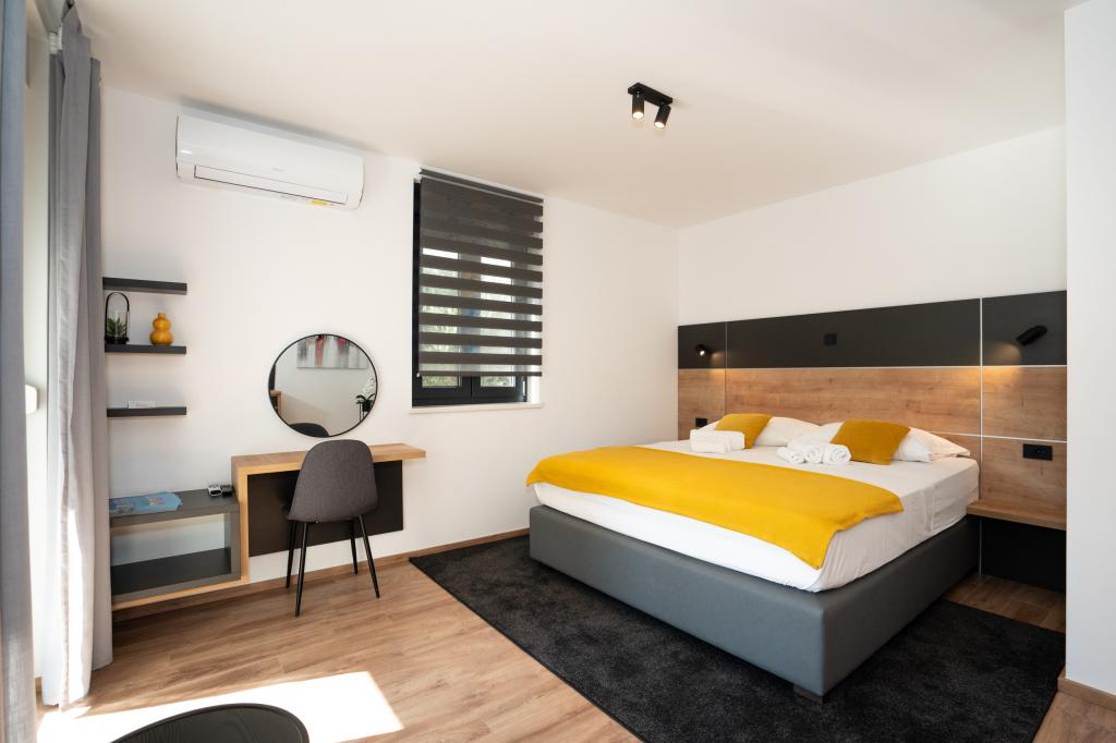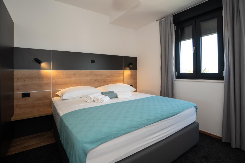 Uživajte v udobju in eleganci naših moderno opremljenih sob in apartmajev visokega razreda. Vsi namestitveni objekti so kategorizirani s 4 zvezdicami in opremljeni po hotelskih standardih s skrbno izbranim pohištvom in kakovostno opremo. Idealno za poslovna potovanja, družinske počitnice ali poletno sprostitev - vaše popolno bivanje v Novalji se začne tukaj! I 4 zvezdice - potrditev kakovosti I Sodobna oprema in dizajn I Apartmaji z eno spalnico I Dve dodatni ležišči v prostorni dnevni sobi I Brezplačen Wi-Fi I Zasebno parkirišče Rezervirajte zdaj in doživite vrhunsko udobje! OPOMBA: Dodatna ležišča v dnevni sobi lahko uporabljajo le otroci, mlajši od 12 let.