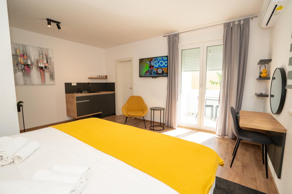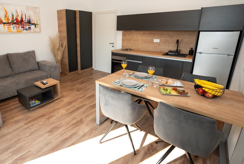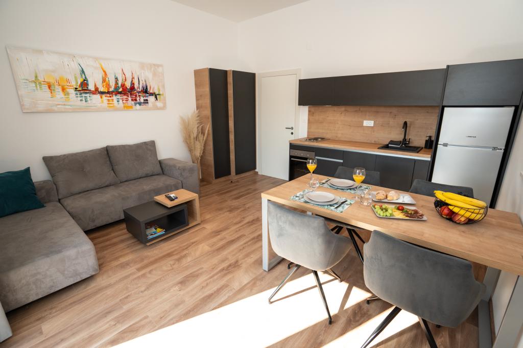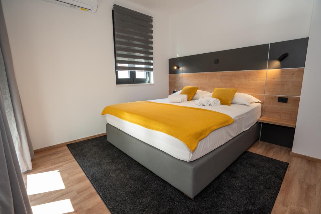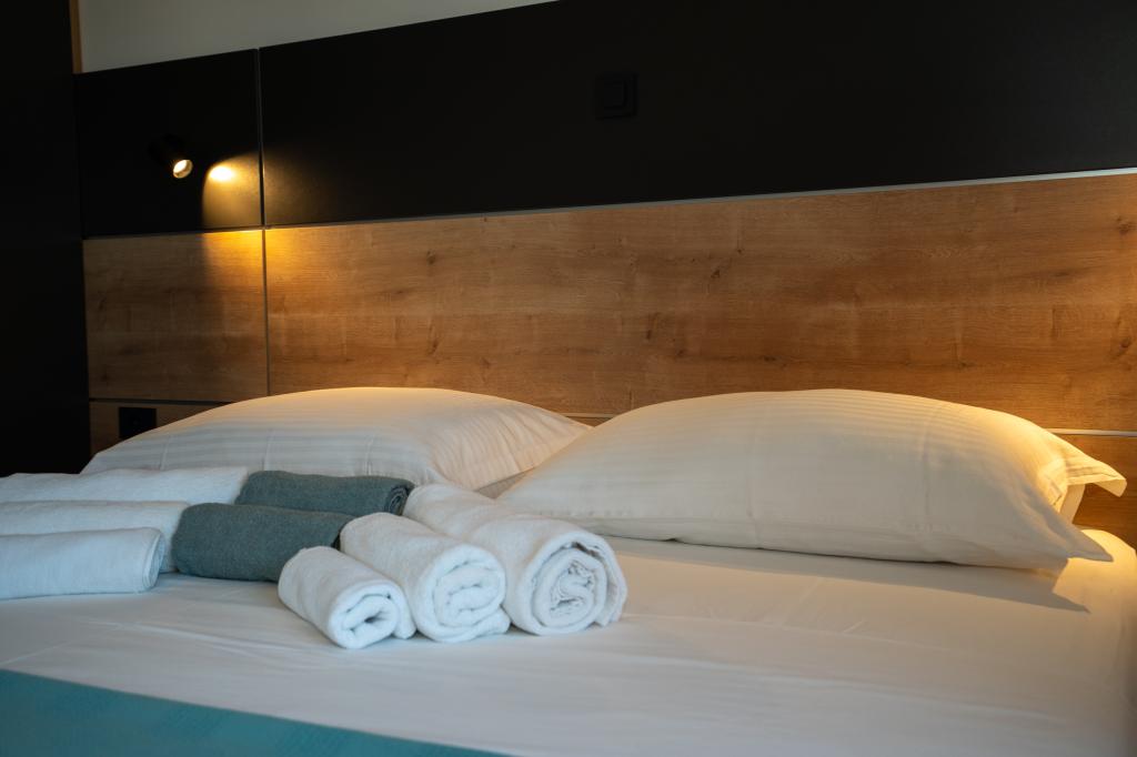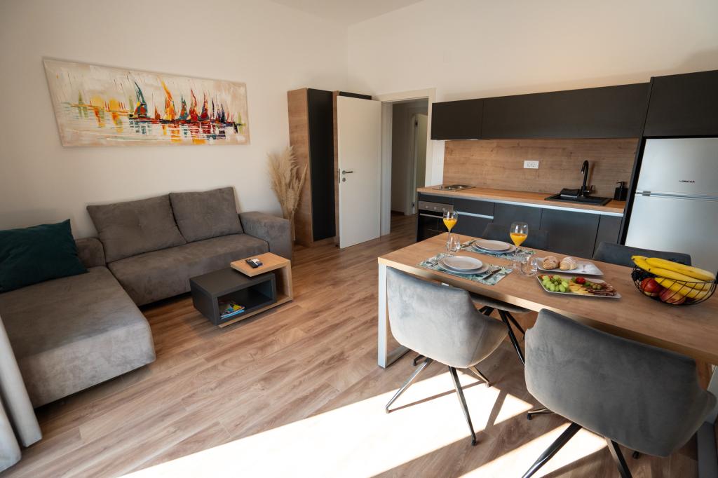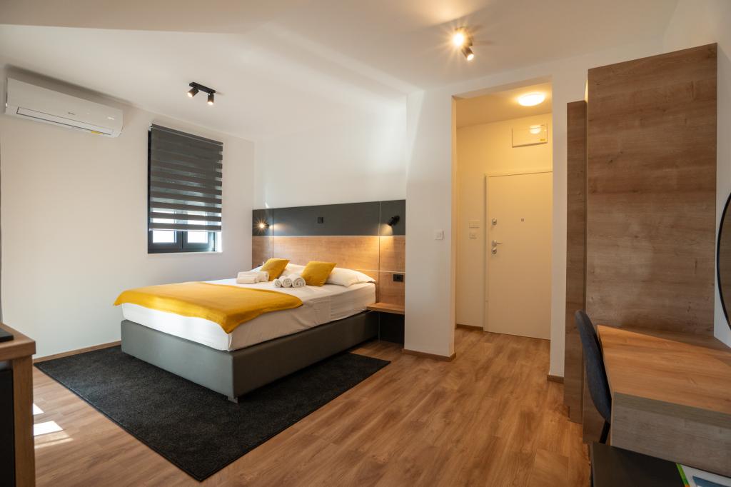 Uživajte v udobju in eleganci naših moderno opremljenih sob in apartmajev visokega razreda. Vsi namestitveni objekti so kategorizirani s 4 zvezdicami in opremljeni po hotelskih standardih s skrbno izbranim pohištvom in kakovostno opremo. Idealno za poslovna potovanja, družinske počitnice ali poletno sprostitev - vaše popolno bivanje v Novalji se začne tukaj! I 4 zvezdice - potrditev kakovosti I Sodobna oprema in dizajn I Apartmaji z eno spalnico I Dve dodatni ležišči v prostorni dnevni sobi I Brezplačen Wi-Fi I Zasebno parkirišče Rezervirajte zdaj in doživite vrhunsko udobje! OPOMBA: Dodatna ležišča v dnevni sobi lahko uporabljajo le otroci, mlajši od 12 let.
