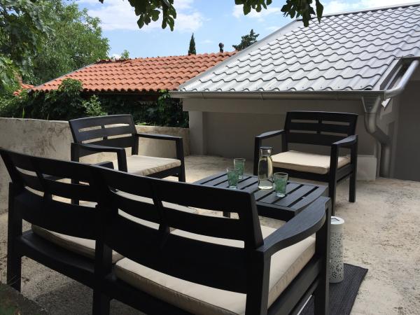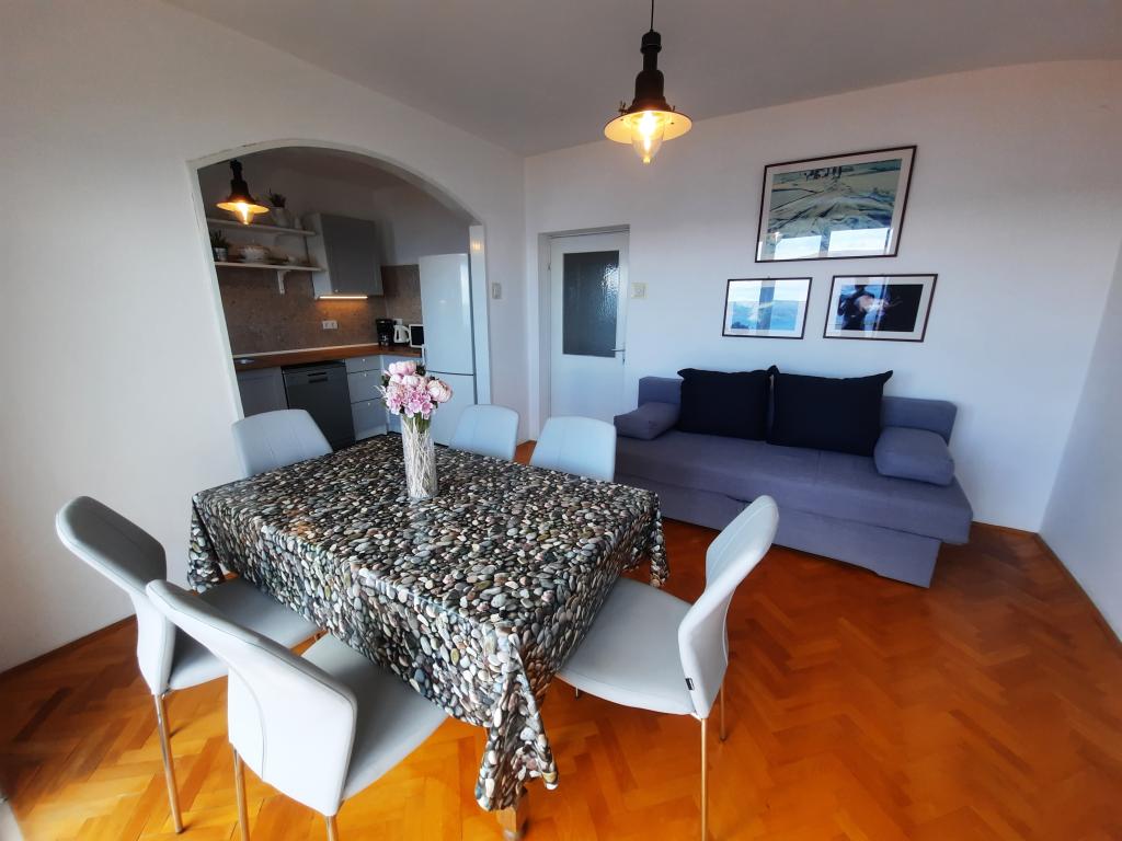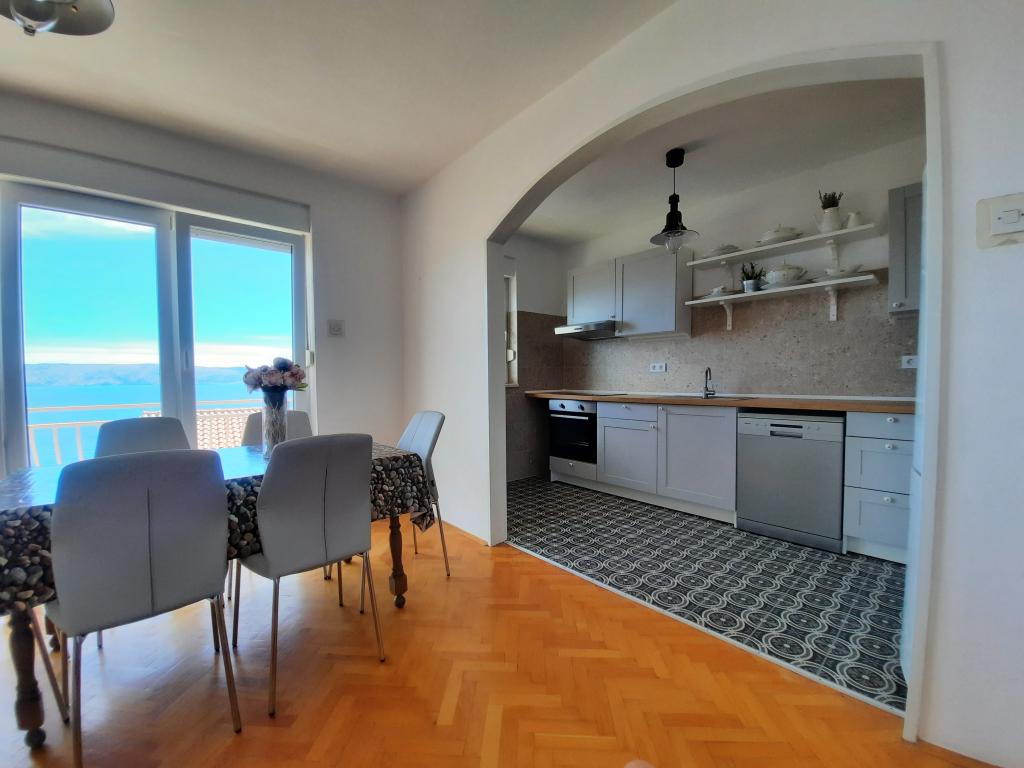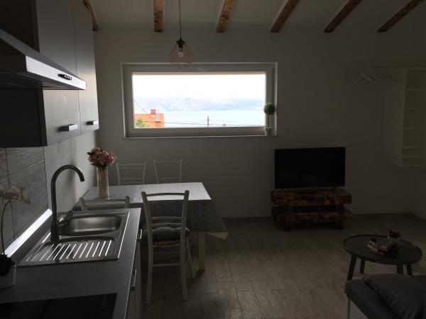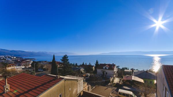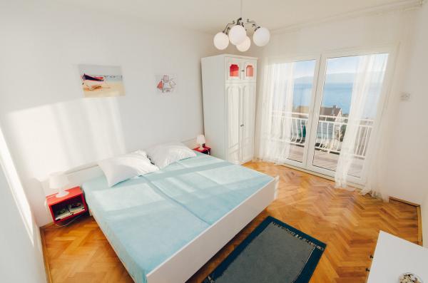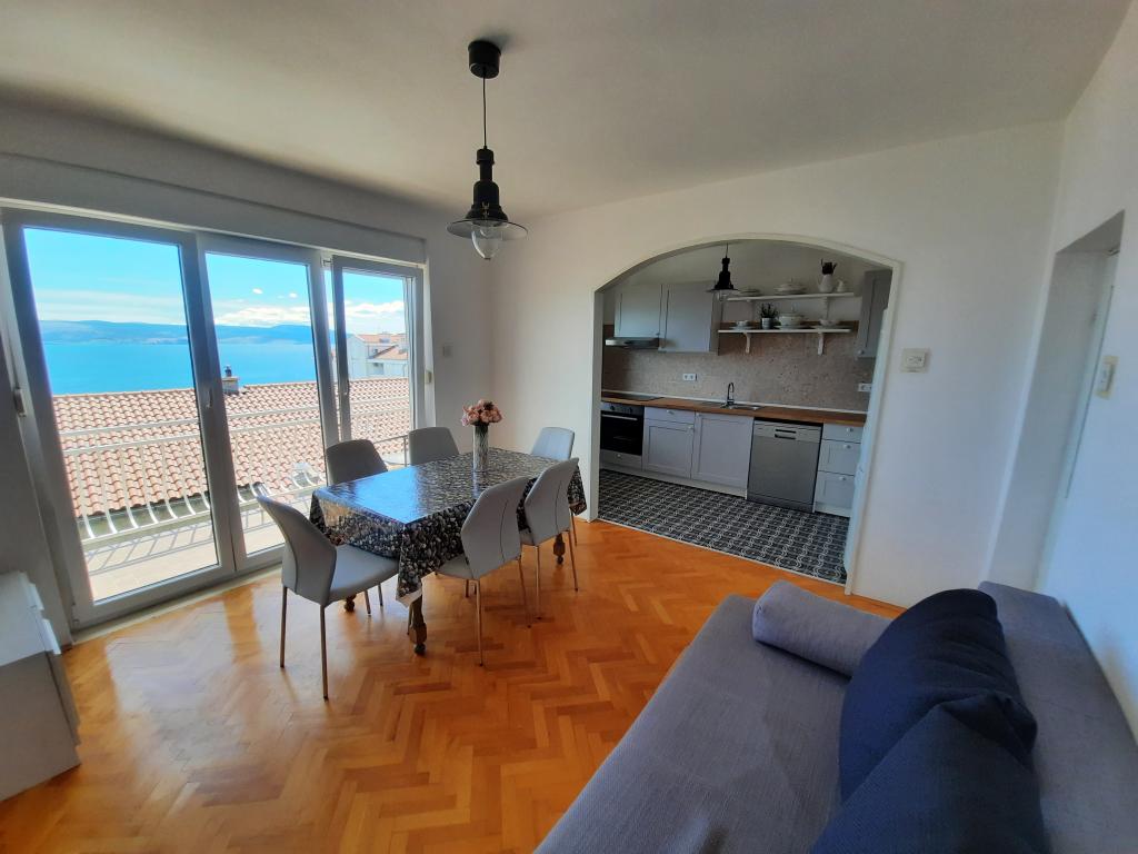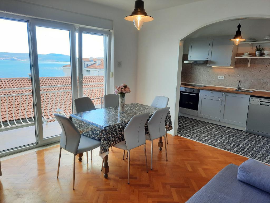 Apartma se nahaja v vzhodnem delu Novega Vinodolskega, mirnem in zelenem, približno 800 m od centra in 200 m od morja. Nahaja se v drugem nadstropju hiše, v celoti opremljeno, z velikim balkonom s pogledom na pobočju Velebita, Senj Senj in vrata, ter skoraj celotni vzhodni obali otoka. Notranjost je sestavljena iz kuhinje, dnevna soba s kavčem, velika kopalnica in tri udobne sobe s šestimi ležišči (skupaj 100 m2 balkon 15 m2). Turistom na voljo je popolna vrt z velikim parkirnim prostorom in dve terasi. Garaža, žar, internet na zahtevo. Hišni ljubljenčki pogajati. Možnost iskanju dodatnih enot v bližini. Veliki popusti v pred-sezoni.