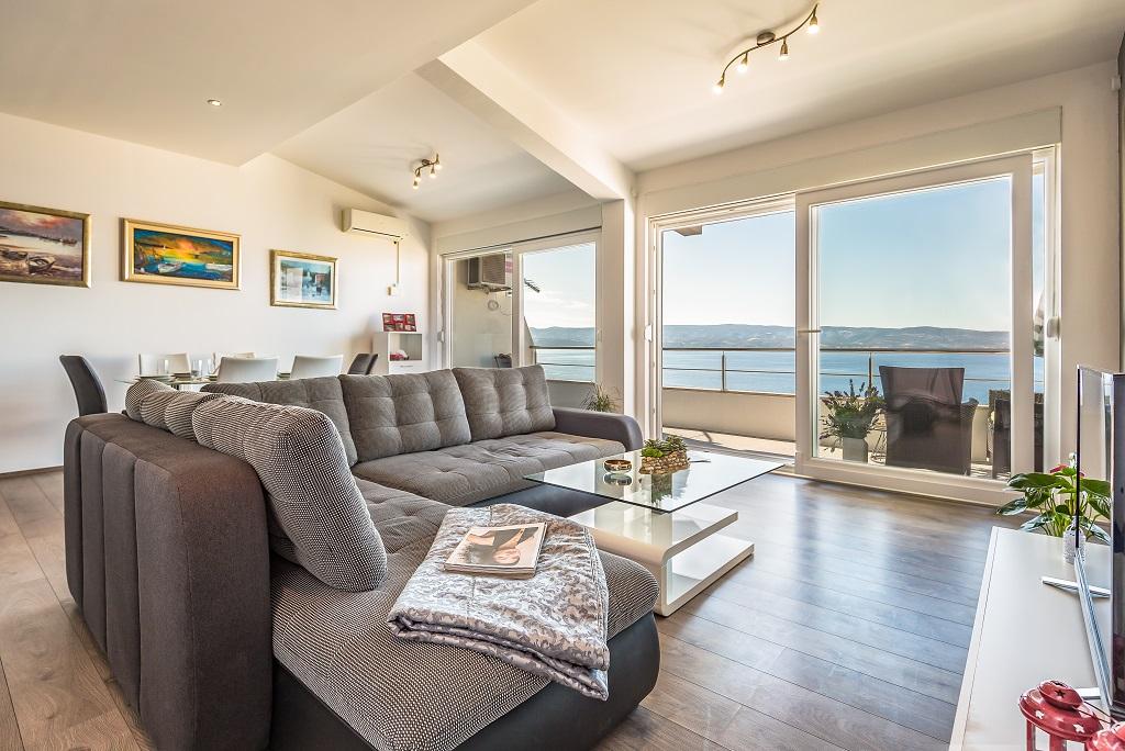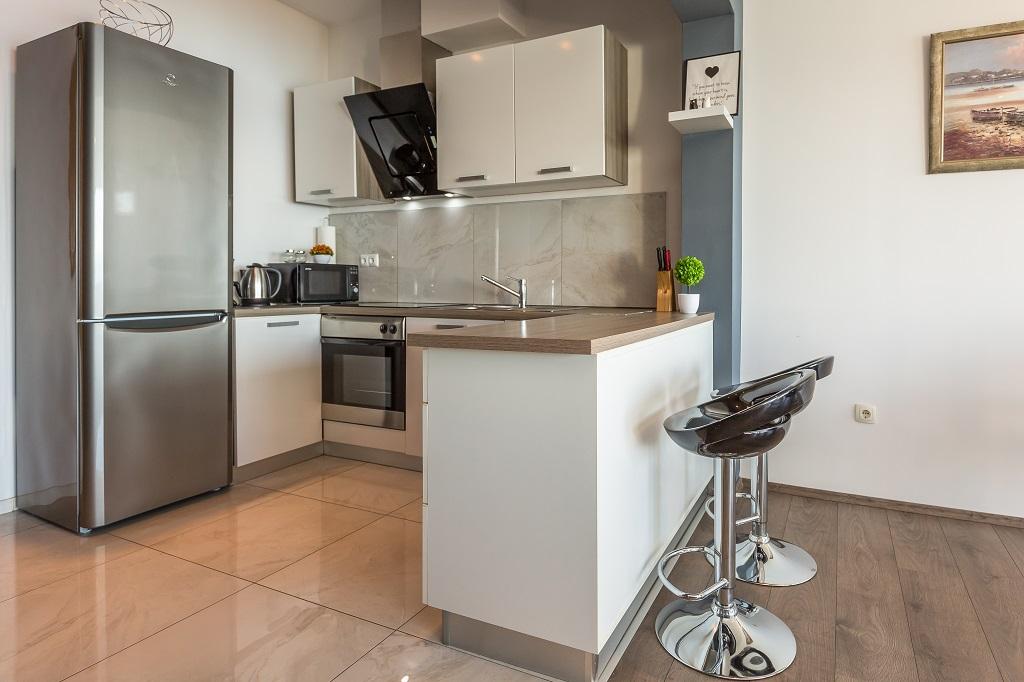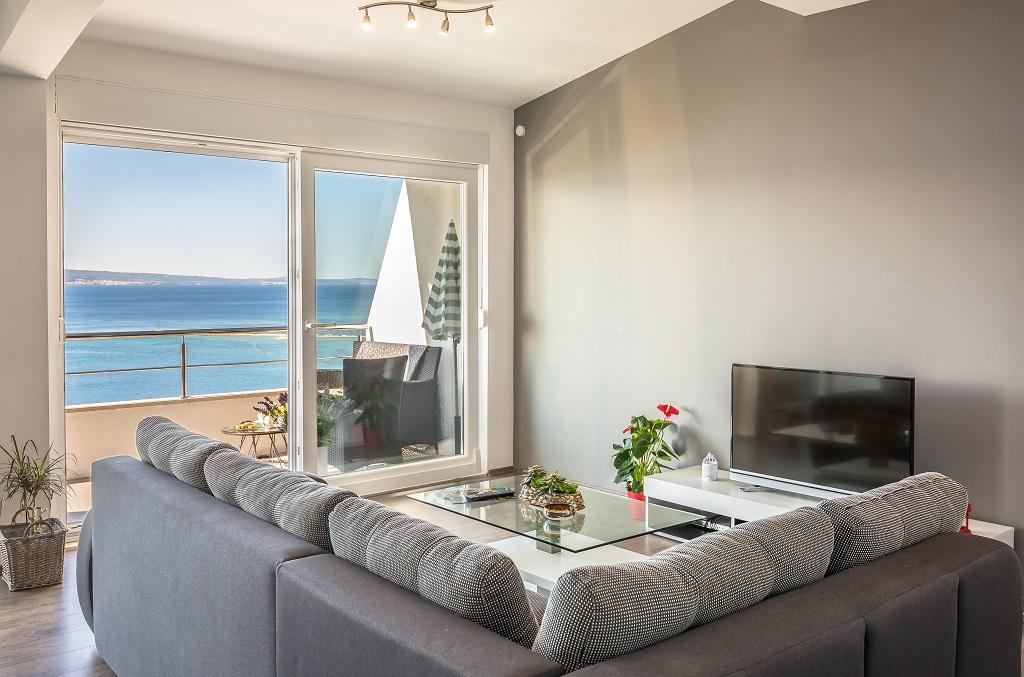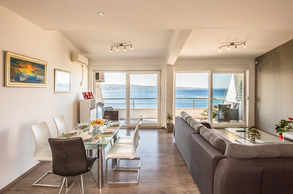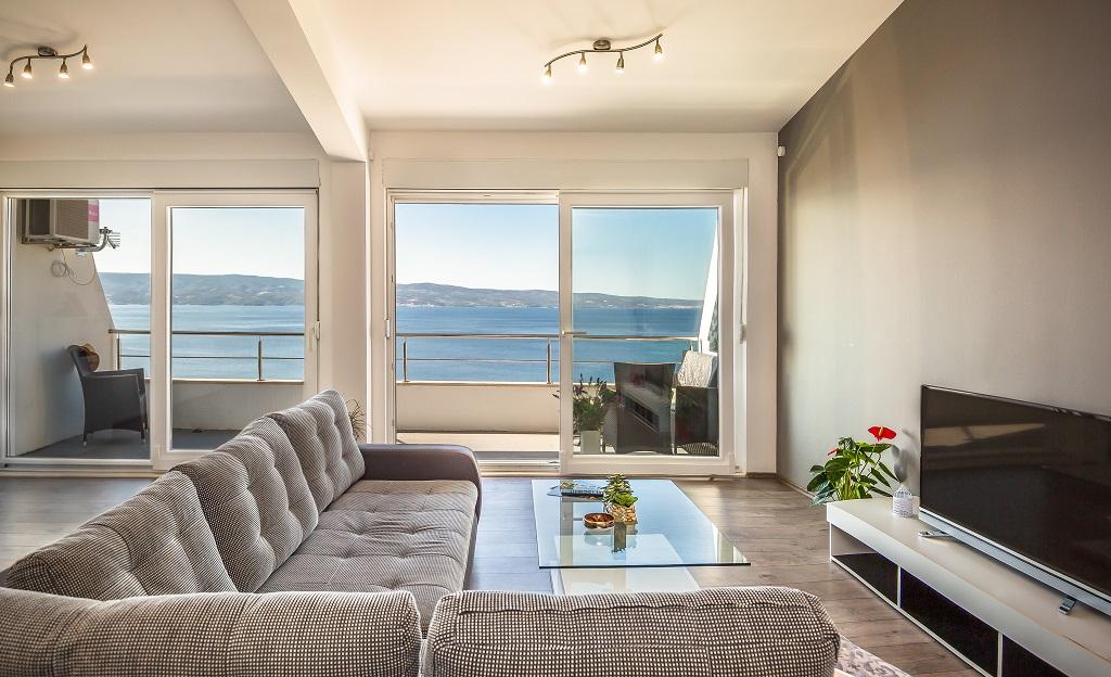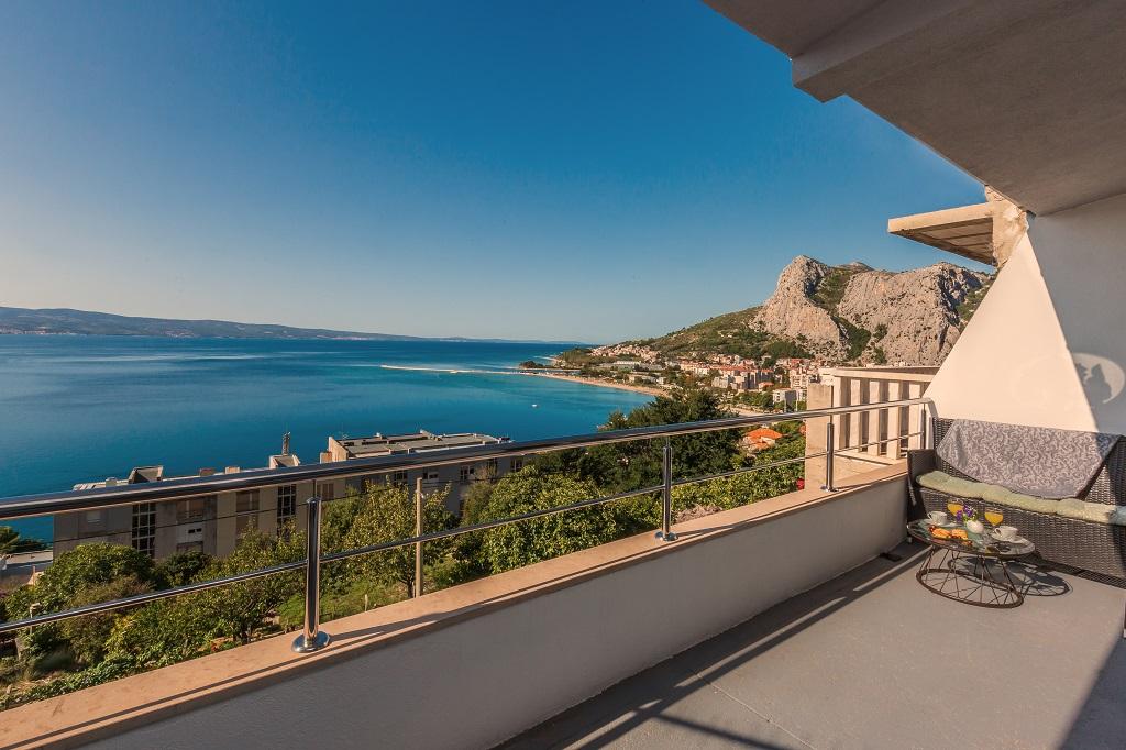 NOVO IN MODERNO MODERNO STANOVANJE. Apartma se nahaja v zasebni družinski hiši s pogledom na morje, otoke in lokalne plaže. Blizu centra Omiša, le 500m stran. Vse je čisto novo. Stanovanje ima 95 m2. Ima 3 spalnice, dnevno sobo, kuhinjo z jedilnico, WC in dodatno kopalnico, balkon in parkirno mesto v garaži. Spalnice: Ena soba ima veliko posteljo (180 x 190) za 2 osebi. V drugi sobi je francoska postelja (160 x 190) za 2 osebi. Tretja soba ima enojno posteljo (90 x 190) za 1 osebo. Kopalnica z umivalnikom in tušem. WC z umivalnikom in pralnim strojem. Kuhinja je popolnoma opremljena. Dnevna soba je prostorna. Velik balkon s sedežno garnituro.