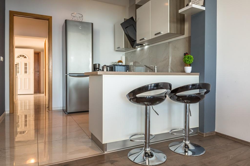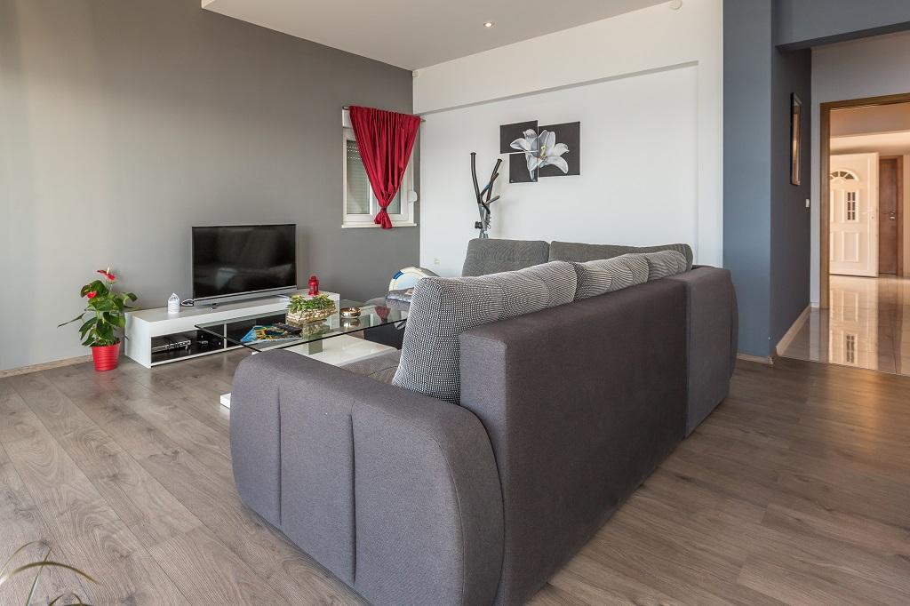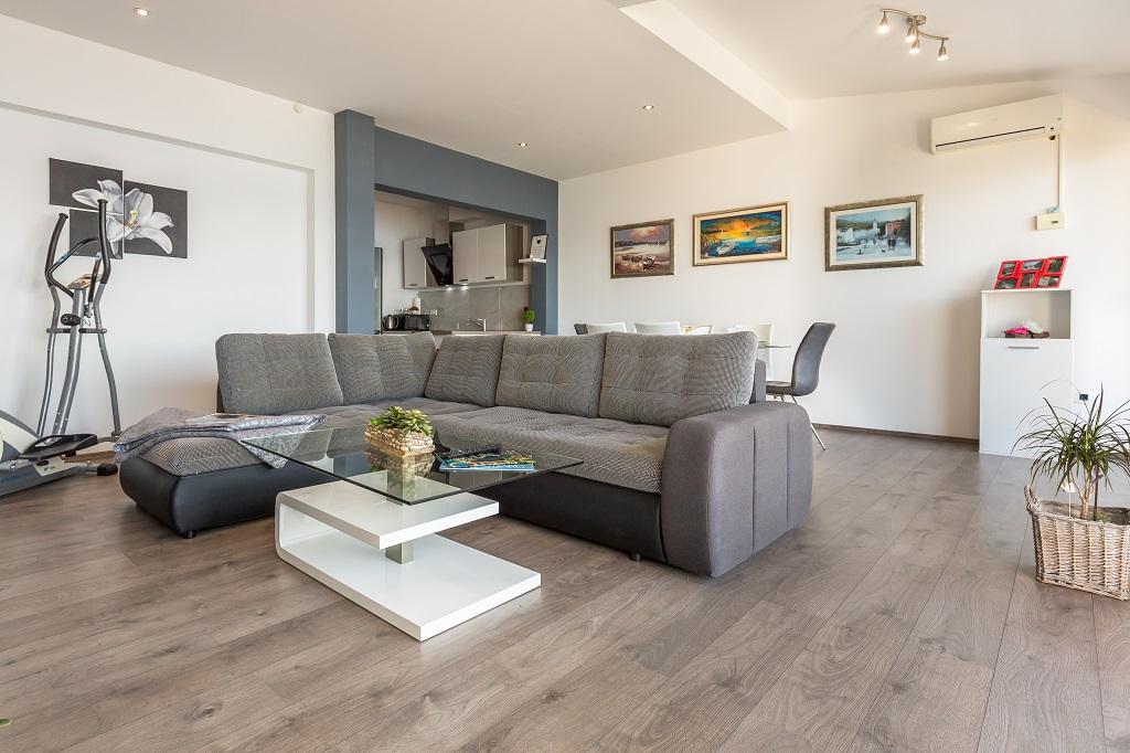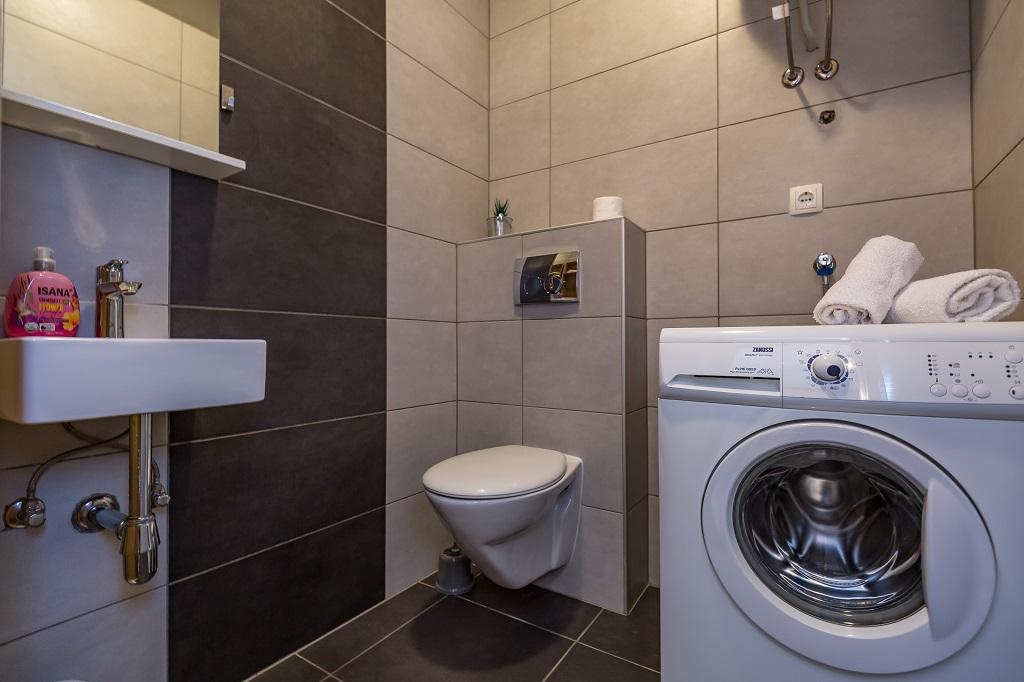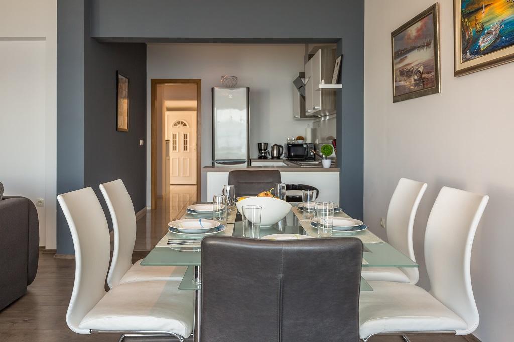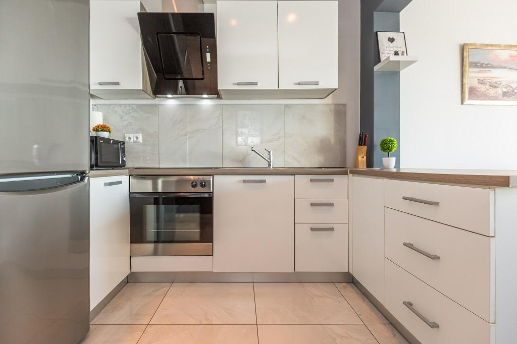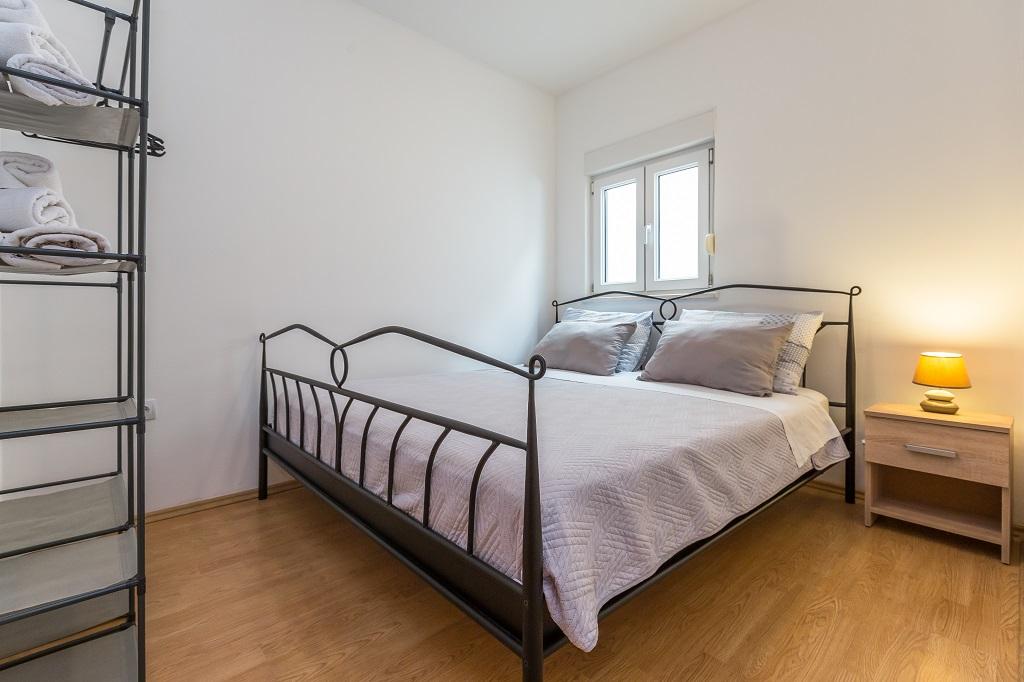 NOVO IN MODERNO MODERNO STANOVANJE. Apartma se nahaja v zasebni družinski hiši s pogledom na morje, otoke in lokalne plaže. Blizu centra Omiša, le 500m stran. Vse je čisto novo. Stanovanje ima 95 m2. Ima 3 spalnice, dnevno sobo, kuhinjo z jedilnico, WC in dodatno kopalnico, balkon in parkirno mesto v garaži. Spalnice: Ena soba ima veliko posteljo (180 x 190) za 2 osebi. V drugi sobi je francoska postelja (160 x 190) za 2 osebi. Tretja soba ima enojno posteljo (90 x 190) za 1 osebo. Kopalnica z umivalnikom in tušem. WC z umivalnikom in pralnim strojem. Kuhinja je popolnoma opremljena. Dnevna soba je prostorna. Velik balkon s sedežno garnituro.