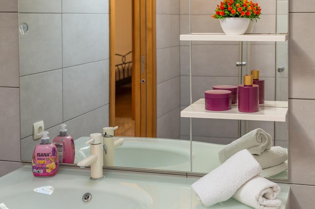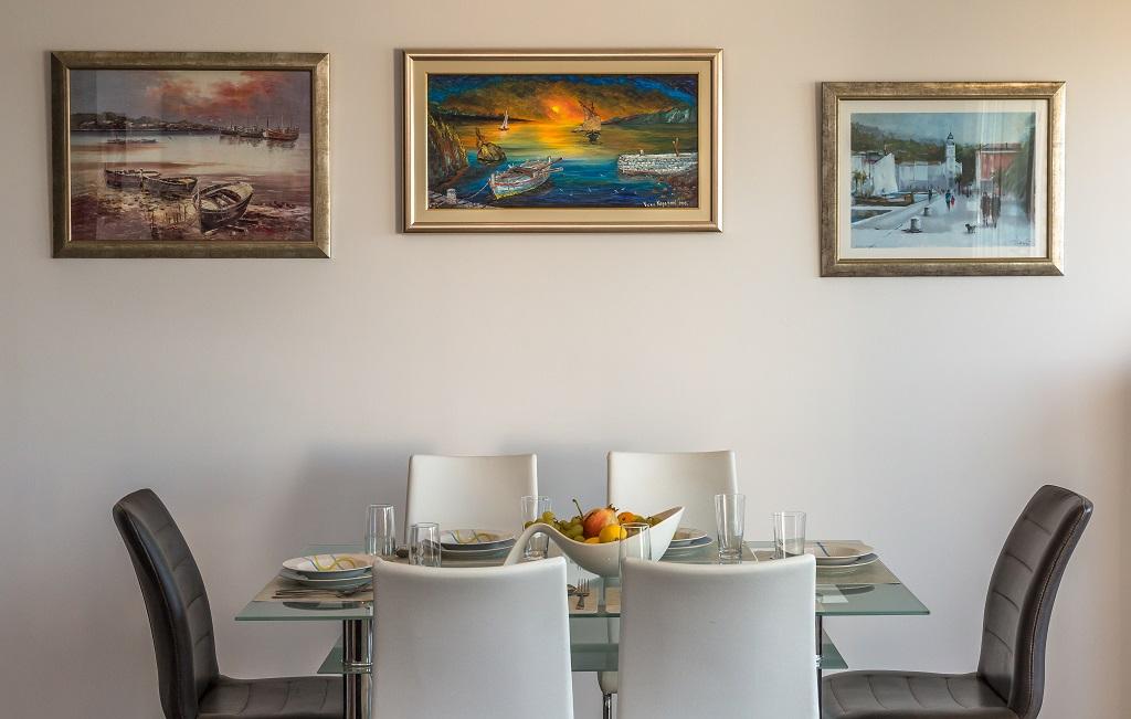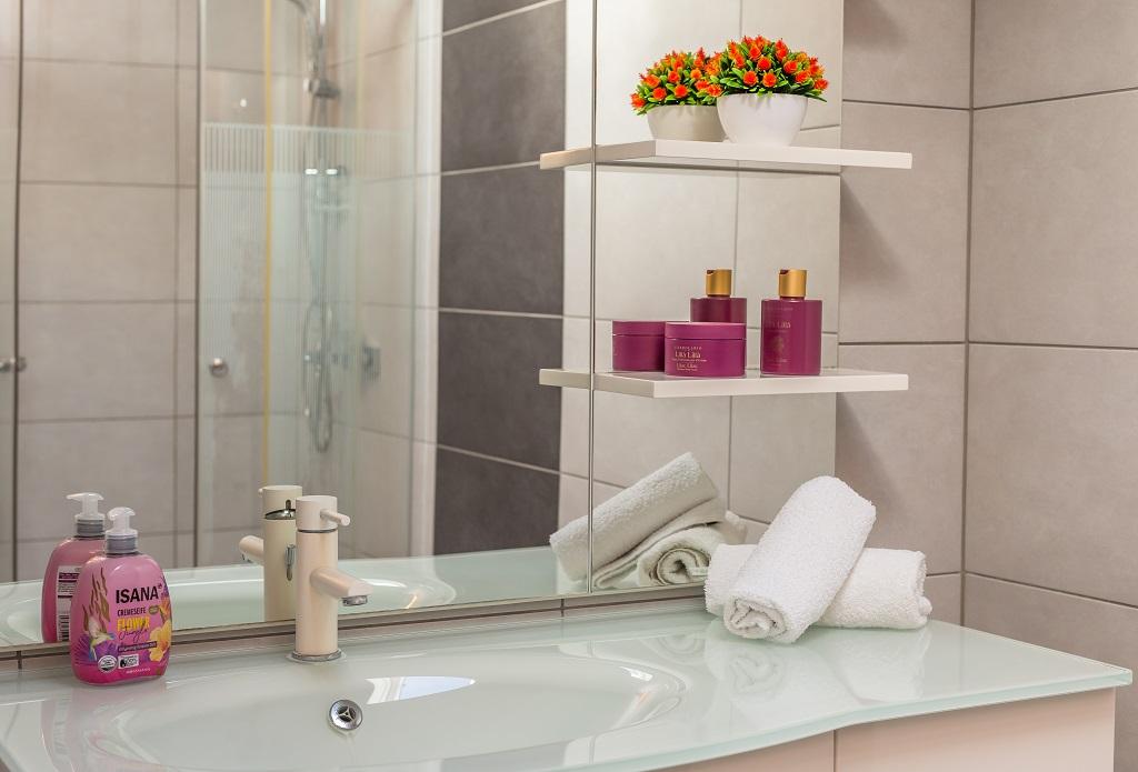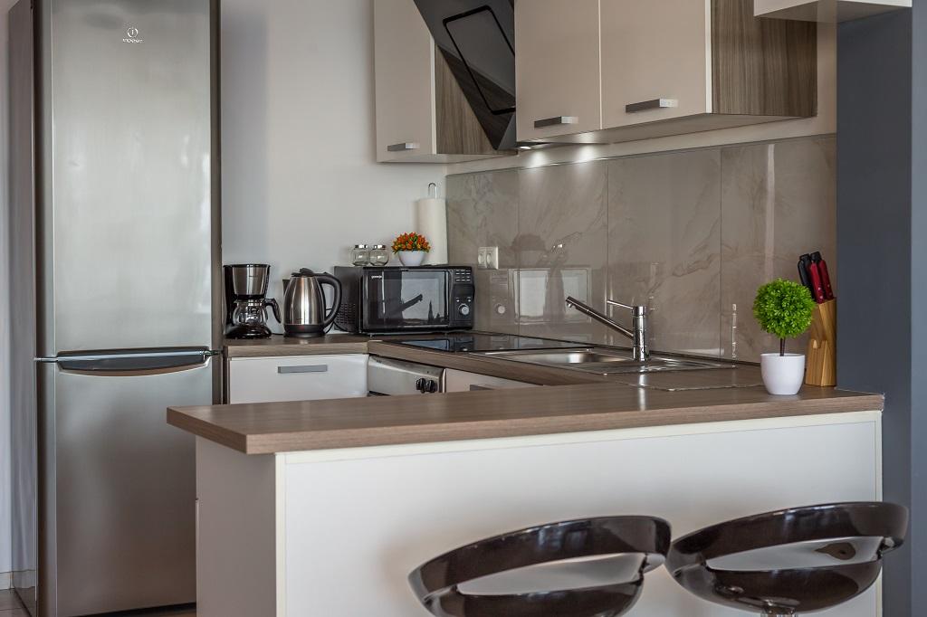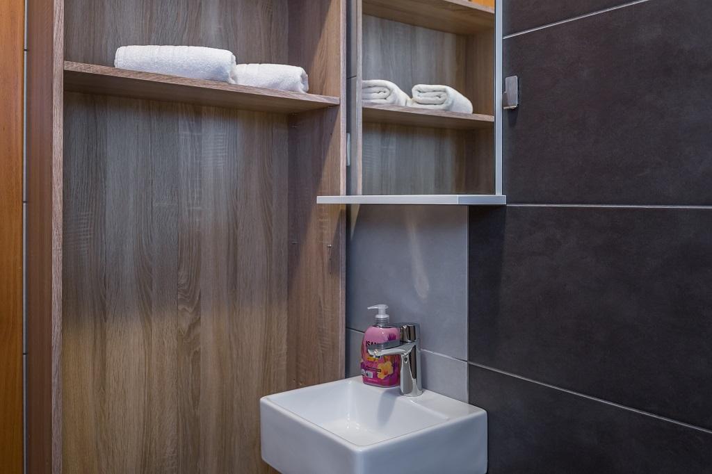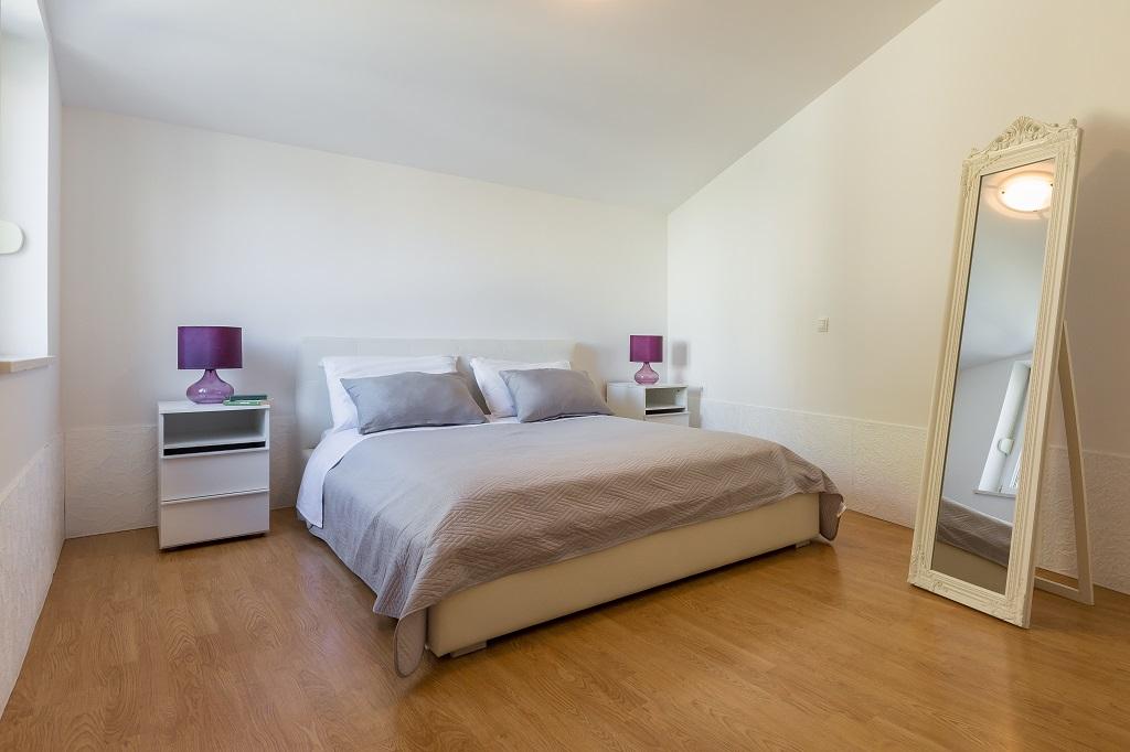 NOVO IN MODERNO MODERNO STANOVANJE. Apartma se nahaja v zasebni družinski hiši s pogledom na morje, otoke in lokalne plaže. Blizu centra Omiša, le 500m stran. Vse je čisto novo. Stanovanje ima 95 m2. Ima 3 spalnice, dnevno sobo, kuhinjo z jedilnico, WC in dodatno kopalnico, balkon in parkirno mesto v garaži. Spalnice: Ena soba ima veliko posteljo (180 x 190) za 2 osebi. V drugi sobi je francoska postelja (160 x 190) za 2 osebi. Tretja soba ima enojno posteljo (90 x 190) za 1 osebo. Kopalnica z umivalnikom in tušem. WC z umivalnikom in pralnim strojem. Kuhinja je popolnoma opremljena. Dnevna soba je prostorna. Velik balkon s sedežno garnituro.