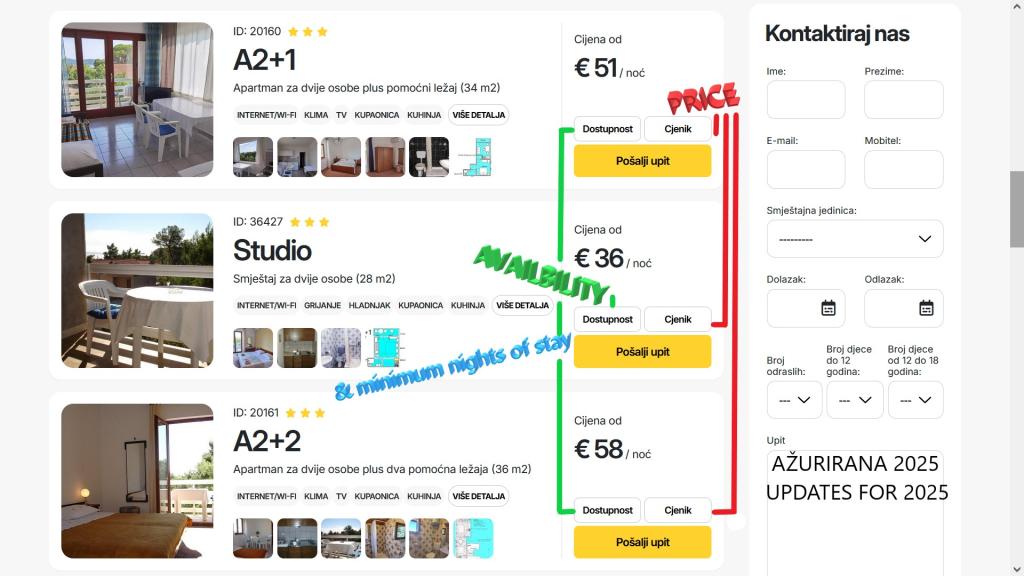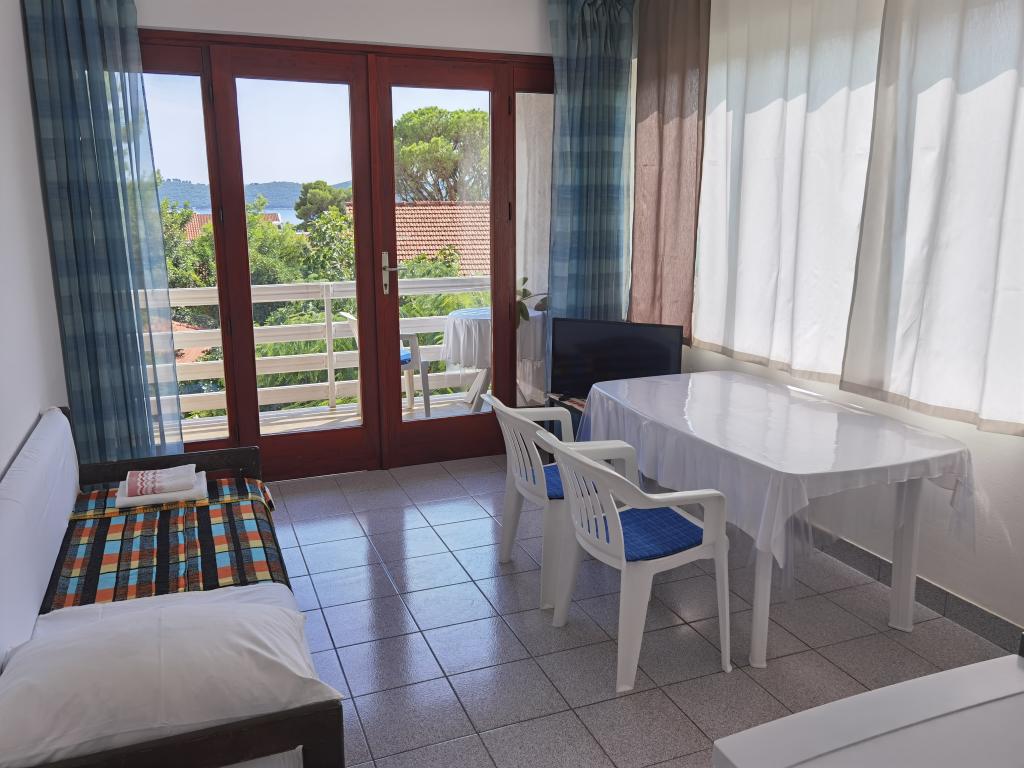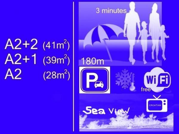 Namestitev se nahaja v zadnji ulici na zahodni strani Orebića. V bližini hotelskega kompleksa, tik ob borovem gozdu. Od morja in javnih plaž smo oddaljeni približno 2,5 min hoje. Obala s plažami je bogata s senco borovcev in črnike, na voljo pa so tudi bari in restavracije. Posebno privlačna je javna plaža pod hotelom Grand z zalivčkom in plitvim morjem s peskom na dnu. Vsi apartmaji imajo balkon - ložo, kjer v vročem vremenu in popolni tišini brez vetra zrak močno in prijetno kroži. Apartmaji z dodatnimi ležišči "2+2" in "2+1" so primerni za družine z dvema ali enim otrokom. Apartma "2+2" je opremljen z dvema, apartma "2+1" pa z eno klimatsko napravo. DOBRODOŠLI