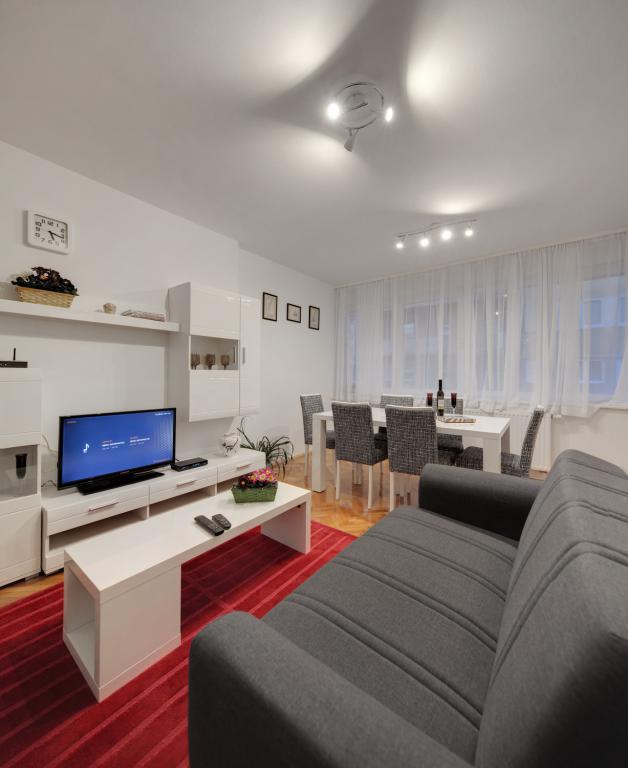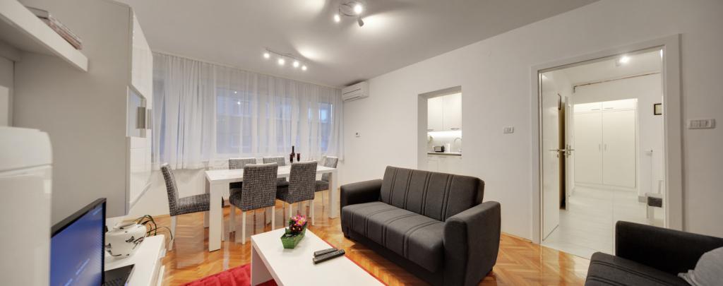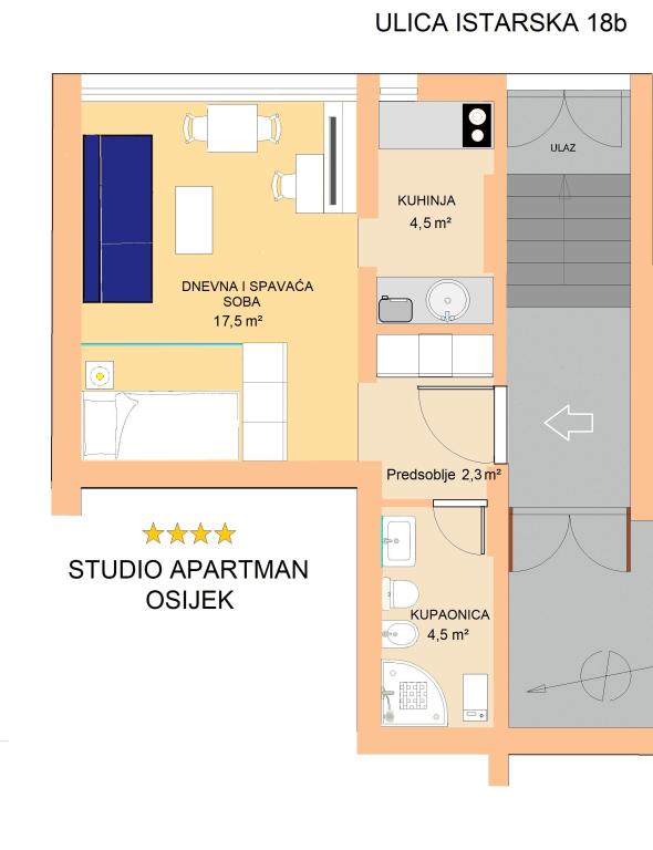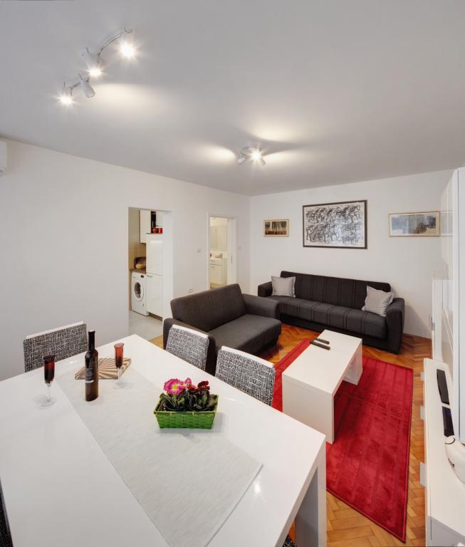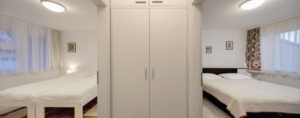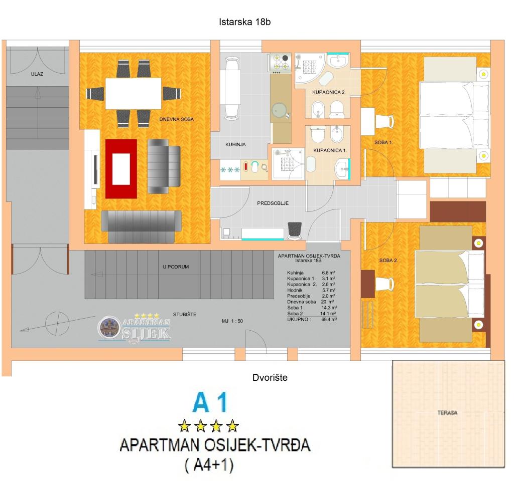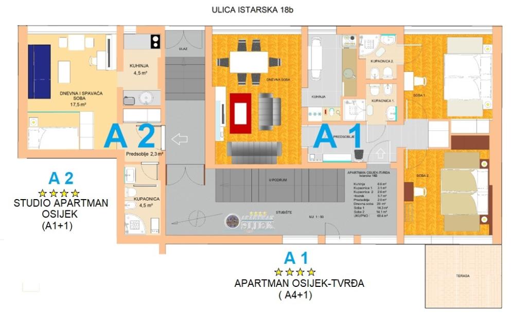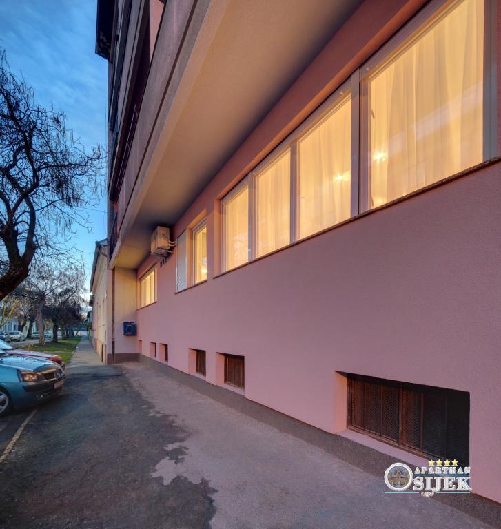 Apartma Tvrđa in Studio apartma Osijek se nahajata v visokem pritličju stavbe v Istarski ulici, v bližini Eurodoma, kjer so zagotovljena parkirna mesta. Apartmaji so blizu glavnih ulic in cest, ki povezujejo Osijek z okoliškimi mesti in avtocesto A5. V neposredni bližini apartmaja se nahajajo nogometni stadion in športna dvorana "City Garden", "City Pools", restavracije in zgodovinsko središče Osijeka - baročna trdnjava. Apartma Tvrđa je trisobno stanovanje s površino 68 m². Na voljo imate dve dvoposteljni sobi in dnevno sobo z raztegljivim kavčem, dve kopalnici, kuhinjo in teraso. Studio apartma Osijek je velik 30 m². Sestoji iz predsobe, dnevne sobe, spalnice, kuhinje in kopalnice. Spalnica, v kateri je postelja, je od dnevne sobe ločena z drsnimi vrati, prekritimi z ogledali. V dnevni sobi je raztegljiv kavč. Zagotovljeno je eno parkirno mesto v podzemni garaži Eurodoma, v neposredni bližini objekta.
