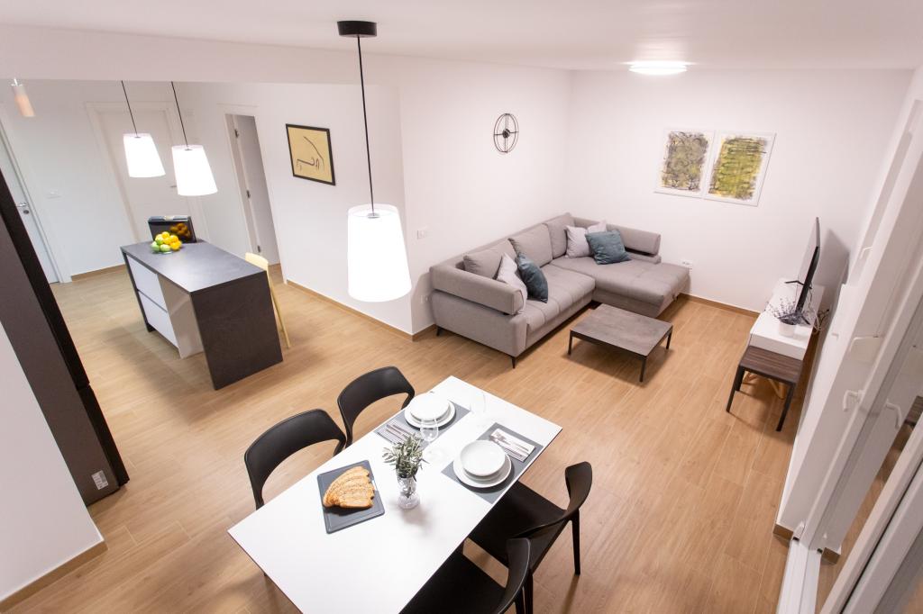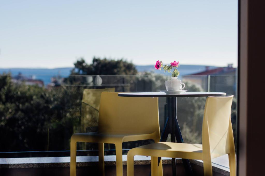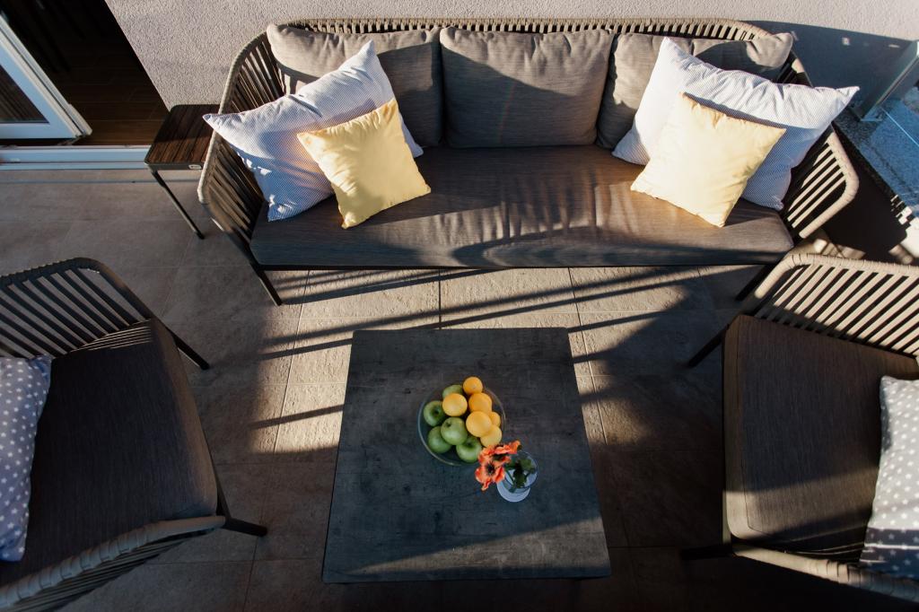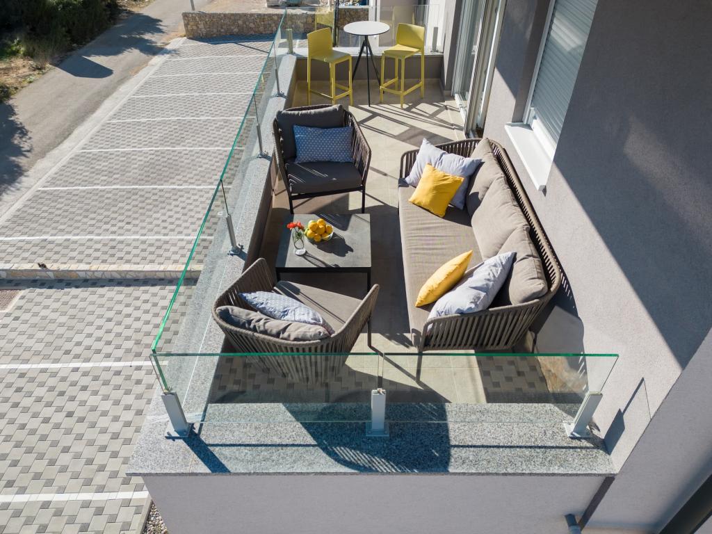 Apartma je udoben, prijeten, z zelo moderno opremljeno notranjostjo, zelo visokim nivojem gostiteljskih storitev: visoko kvalitetno pohištvo, aparati in naprave, udobne postelje za spanje z zelo kvalitetno posteljnino in vzglavniki, diskretna razsvetljava..... Sami smo si pripravljali obroke in uživali v zajtrku, kosilu in večerji v apartmaju in na balkonu. Čudovit pogled na morje s skrbno opremljenega velikega balkona. Zelo udobna sedežna garnitura za sedenje in ležanje na balkonu vas premami, da se nanjo uležete in se ne premaknete... nadihate se čistega morskega zraka in poslušate žvrgolenje ptic v gozdičku nasproti apartmaja... Zeleni pas vzdolž celotne ulice je poln oljk, lovorja, smreke, ciprese in drugih sredozemskih rastlin. Urejen vhod, marmorno stopnišče... V isti ulici (ob morju) je slaščičarna s teraso in slastnimi sladoledi in skodelicami, malo nižje po glavni ulici pa bistro s teraso na samem morskem klifu z odlično kavo in cocktailom. Ob morju je nekaj kilometrov dolga promenada, ki smo jo zjutraj in ob impresivnem sončnem zahodu maksimalno izkoristili. Kopalna sezona se je šele začela, zadovoljili smo se le z namakanjem nog v majhnem peščenem zalivu. Morje je čudovito modro, čisto, bistro. Plaža se razprostira vzdolž celotne promenade. če se zadrževanje v bližini zelenja ne da, je potreben senčnik. Ves čas bivanja v apartmaju smo se počutili zelo, zelo dobro..,, očitno oddaja "pozitivno energijo". Priporočamo!!!!!