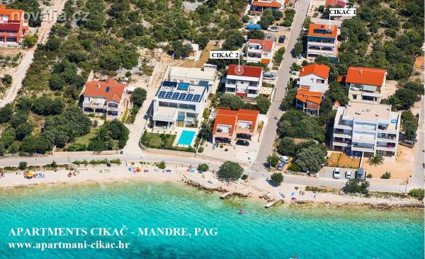 Apartmajska hiša Cikač in se nahaja le 50 metrov od morja. Sestavljen je iz štirih apartmajih za 4 osebe (2 +2 ležišči, 45 kvadratnih metrov), ki se nahajajo v prvem in drugem nadstropju in en apartma za 6 +1 oseb (80 kvadratnih metrov) v pritličju. Apartmaji so opremljeni s klimatsko napravo, TV z satelitskim in prizemnim sprejemom, hladilnikom in zamrzovalnikom in velikimi balkoni s pogledom na morje. V parkiranje dvorišču in kaminom. Lepa plaža tik pod stanovanju.