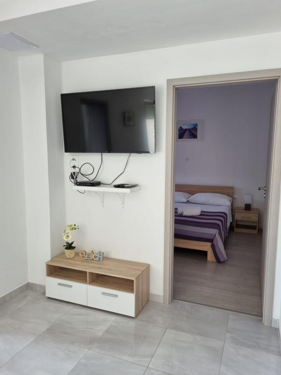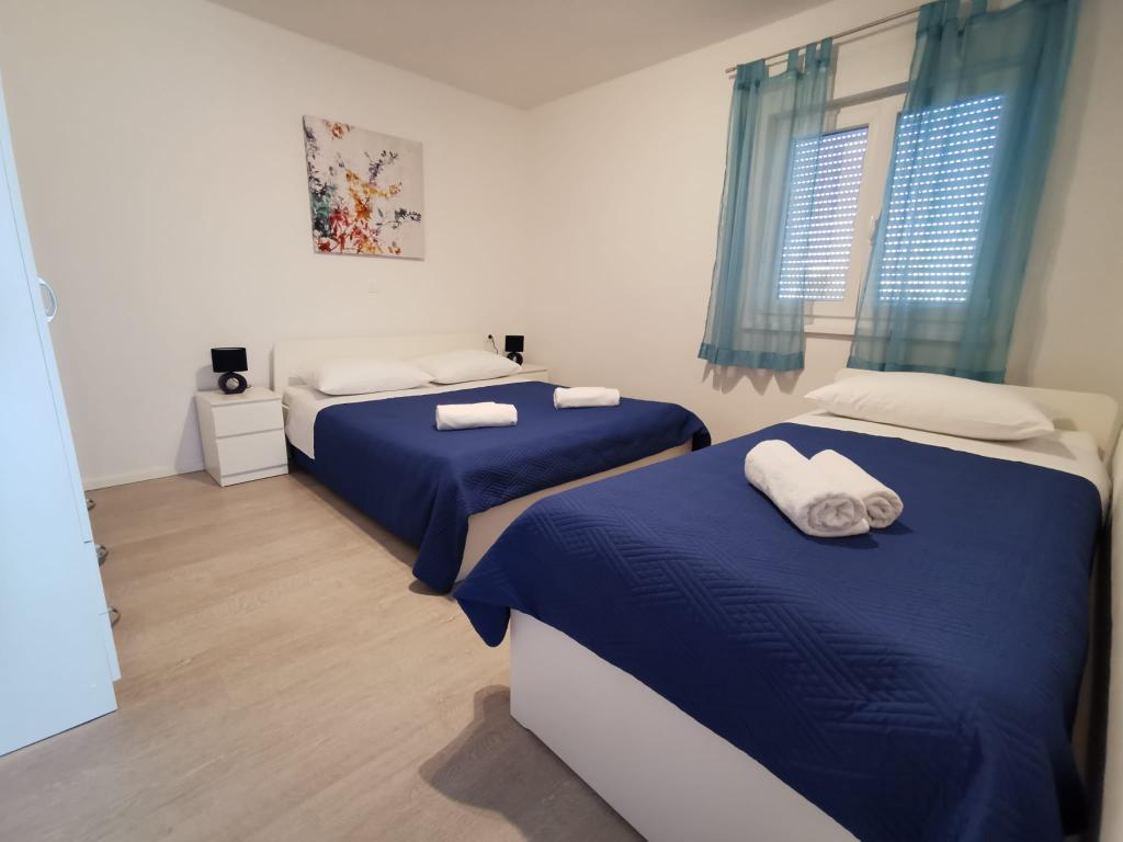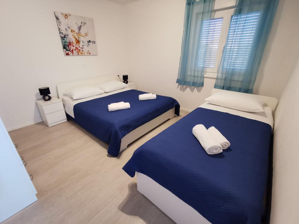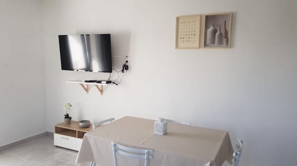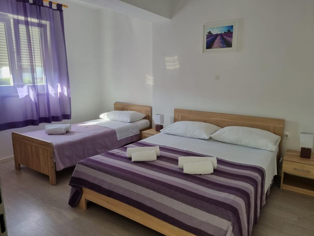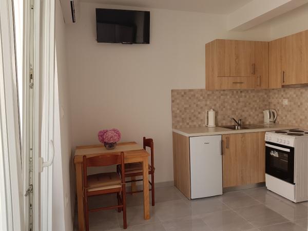Naši apartmaji se nahajajo ob morju, v centru mesta Mandri na otoku Pagu. Vsi apartmaji se nahajajo v 1. nadstropju naše družinske hiše, tako da ponujajo čudovit pogled na morje. Apartmaji so na novo prenovljeni in opremljeni z internetom, klimo, TV/SAT, popolnoma opremljeno kuhinjo, poleg tega pa lahko na vsa okna skupaj z žaluzijami namestite komarnike, kot zaščito pred komarji. Vsak apartma ima svoje parkirno mesto, vsi gostje pa lahko uporabljajo žar na vrtu. Skozi naše dvorišče greste neposredno na plažo, tako da za prijeten oddih na soncu potrebujete samo brisačo čez ramo! Zelo se veselimo vašega prihoda!