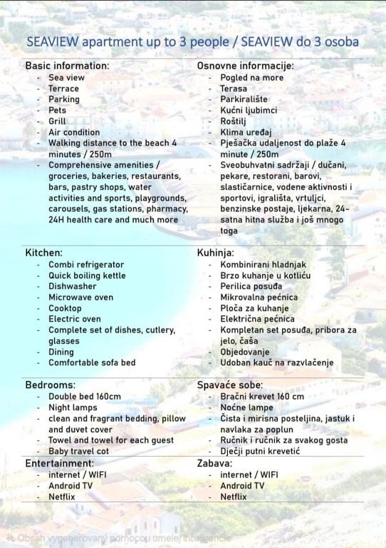 Pralni stroj na voljo v tehnični sobi – uporaba 2-krat v 7 dneh vključena, vsako dodatno pranje 5 €. Zgodnji prihod v apartma (6:00–12:00) – 20 €*. Pozen odhod iz apartmaja (11:00–19:00) – 20 €*. Majhni hišni ljubljenčki so dobrodošli – 5 € na noč. Druge storitve po dogovoru * Odvisno od razpoložljivosti.