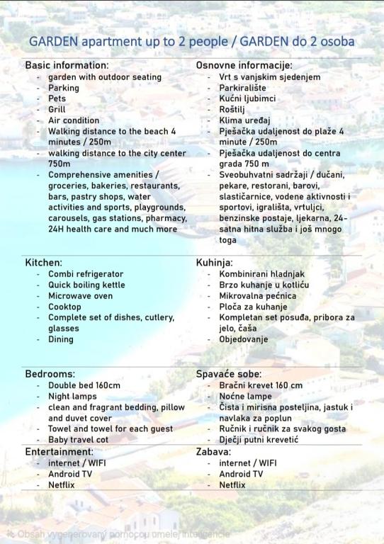 Dobrodošli v Apartmajih Harmonija – vašem idealnem kraju za počitnice na otoku Pagu v mestu Pag! Naša hiša se nahaja na odlični lokaciji: le 250 m od glavne mestne plaže Prosika in manj kot 10 minut hoje do centra, kjer vas čakajo restavracije, kavarne in očarljive ulice starega mestnega jedra. Ponujamo tri moderno opremljene apartmaje: - APP1 z balkonom in pogledom na morje - APP2 z zasebnim vrtom za mir in sprostitev - APP3 s panoramskim razgledom na morje, mesto in Velebit Vsi apartmaji imajo popolnoma opremljeno kuhinjo, Wi-Fi, TV z Netflixom, posteljnino in brisače. Gostje imajo dostop do dvorišča s plinskim žarom in varovanega parkirišča pred hišo. V bližini so številne skrite plaže – idealne za aktivne počitnice ali mirno uživanje. Zakaj izbrati Apartmaje Harmonija? - Odlična lokacija v bližini plaže in centra - Prijazni gostitelji in prijetno vzdušje - Popolnoma opremljeni za brezskrben oddih - Idealno za družine, pare in popotnike, ki iščejo mir