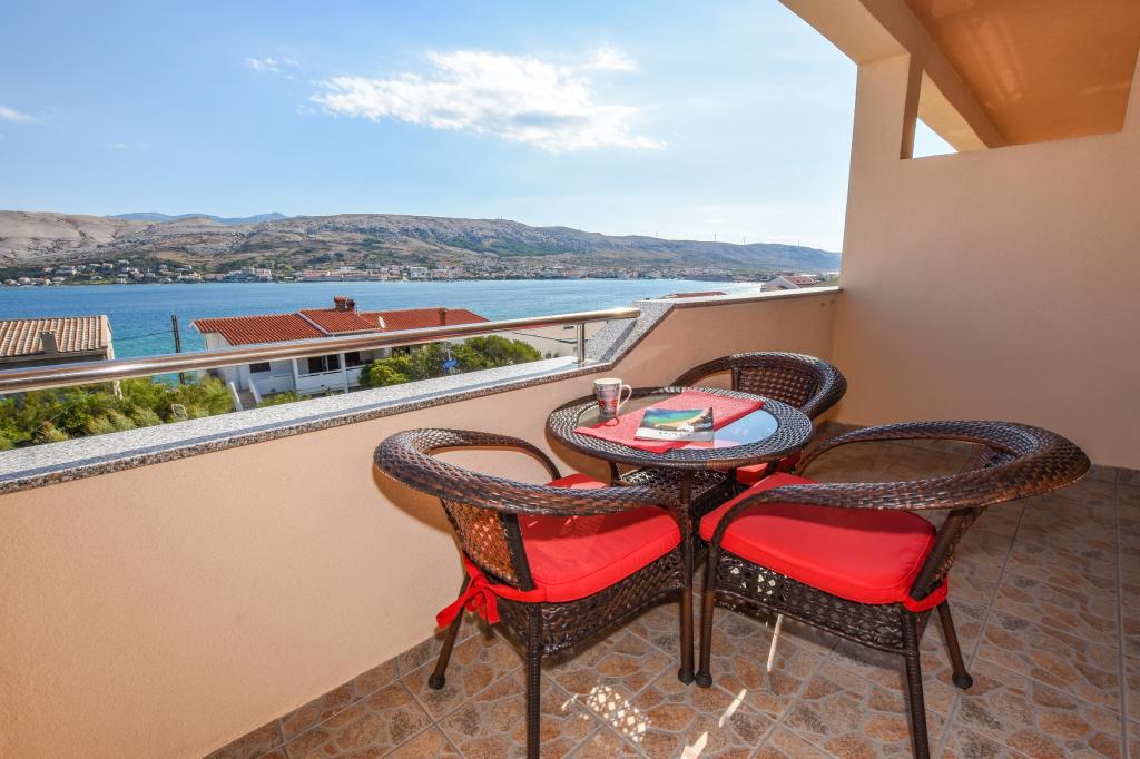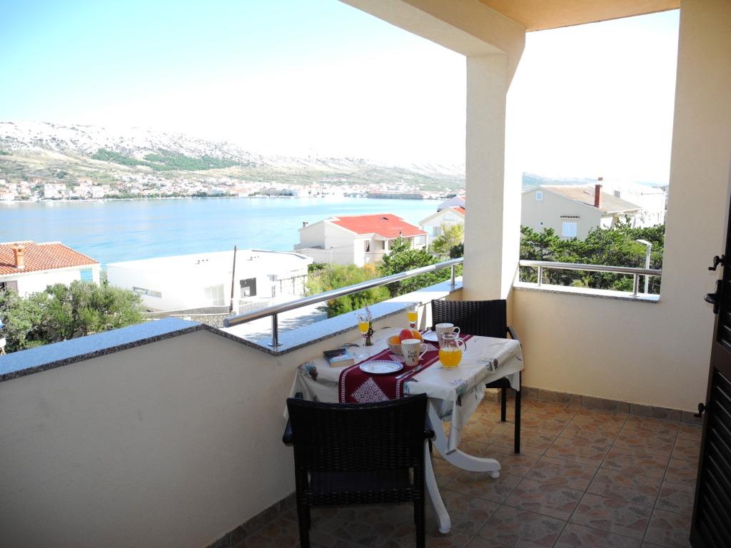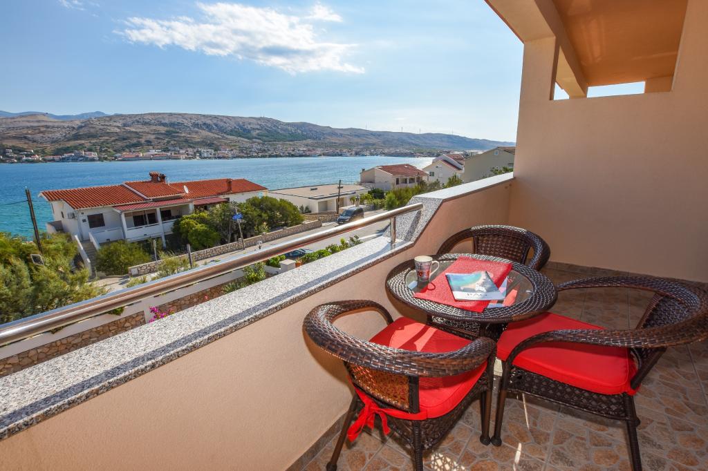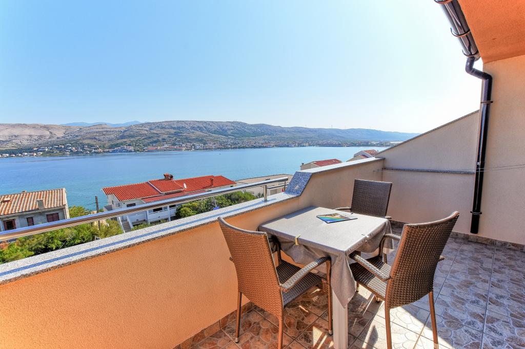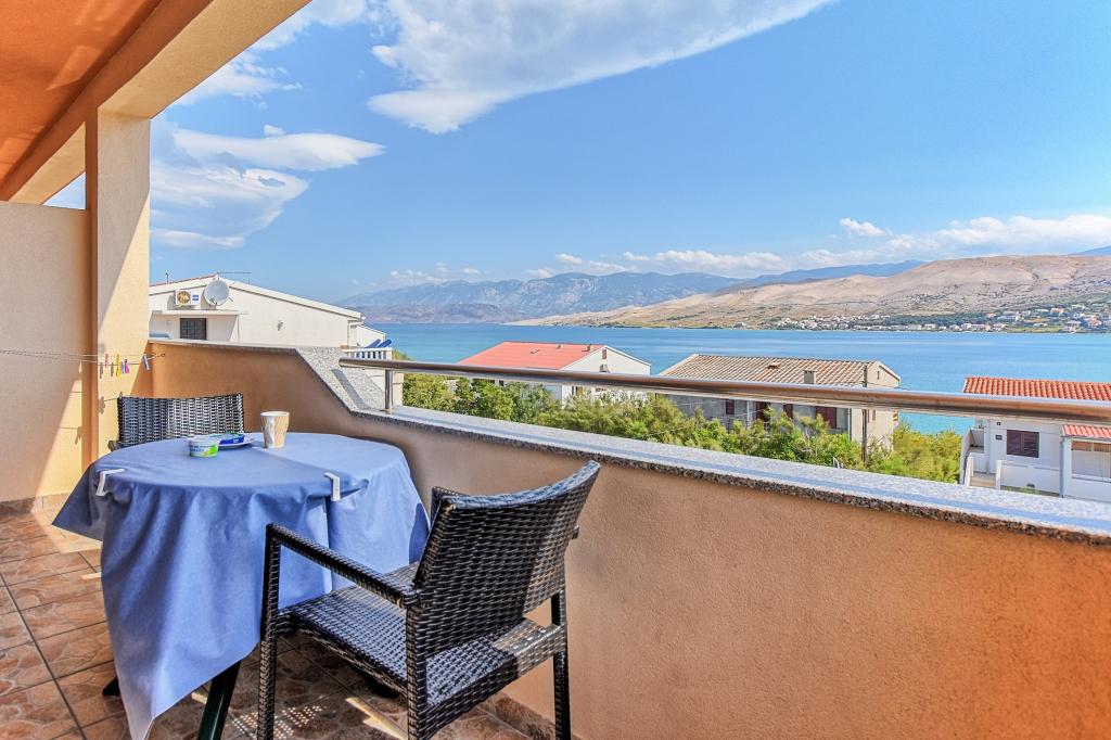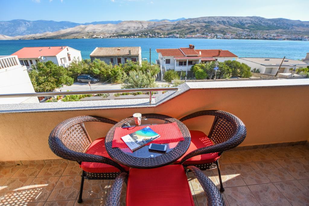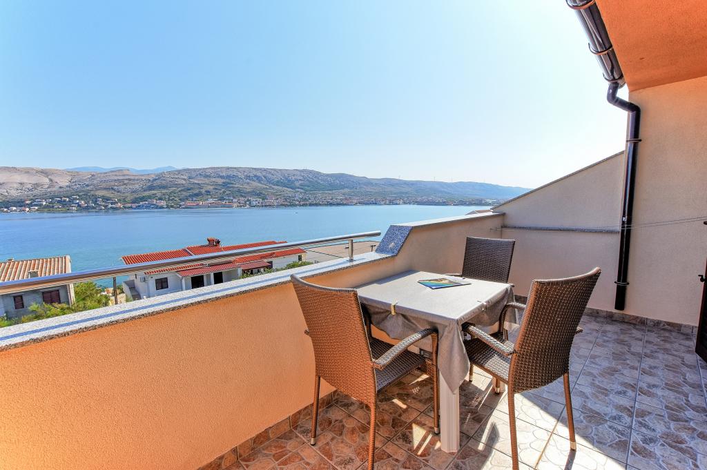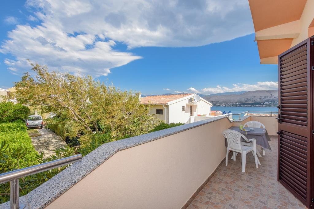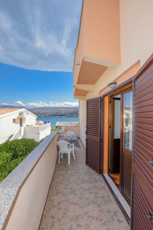 Prostoren apartma z 2 balkonoma, oba imata čudovit pogled na morje in mesto Pag. Primerno za družine z otroki, 5 min. peš od plaže Prosika. Odlično in prostorno parkirišče. Lastnik je prijazen in vedno na voljo.