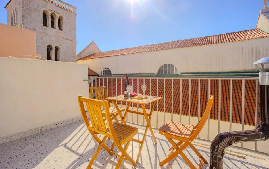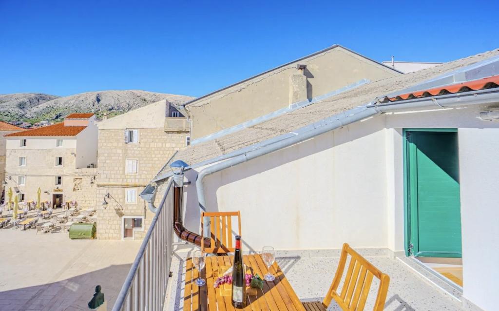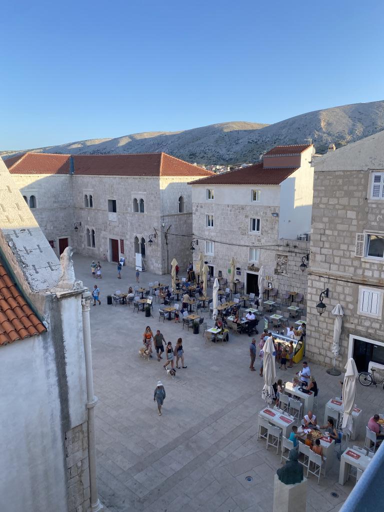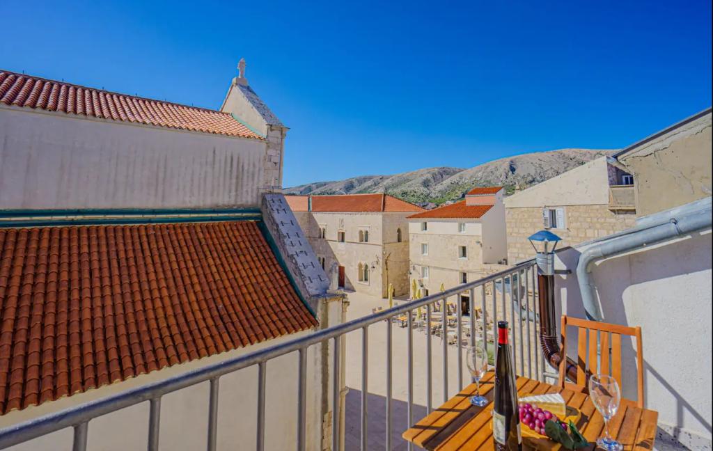 Počitniška hiša s pogledom na glavni mestni trg, ki se nahaja v središču Paga. Za 4 osebe. Vsebuje: mikrovalovno pečico, pametni TV, klimatsko napravo, grelnik vode, opekač kruha, hladilnik, pralni stroj, teraso s senčnikom. V radiju 50 metrov se nahajajo vse ugodnosti: restavracije, pekarna (10 m), trgovina, lekarna, kavarne, trgovine s spominki, parkirišče, cerkev, avtobusna postaja (300 m). Brezplačno parkiranje vključeno in zasebno parkirno mesto. Glavna mestna plaža je oddaljena 250 metrov od hiše. V bližini je tudi plaža hotela Pagus. Pogled na cerkev in Knežjo palačo.