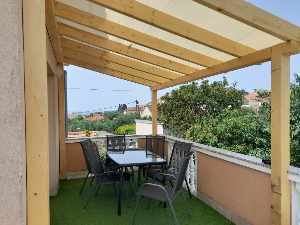Popolnoma opremljeno 3-sobno stanovanje v mirnem okolju. Velika terasa in balkon s pogledom na morje. Možnost uporabe žara na vrtu. Varovano parkirišče v senci.