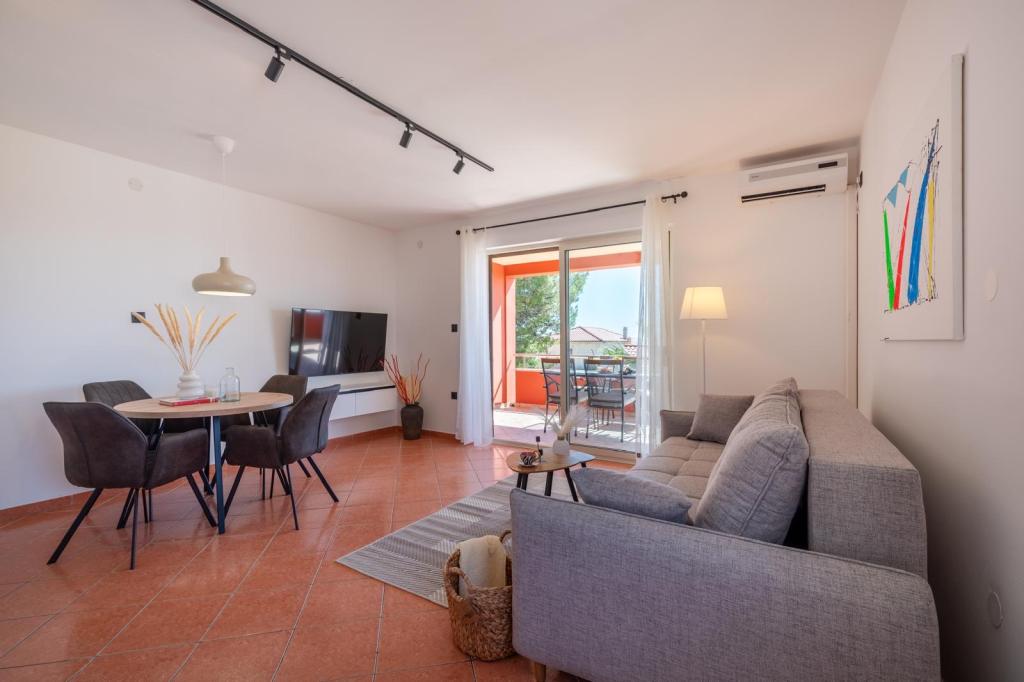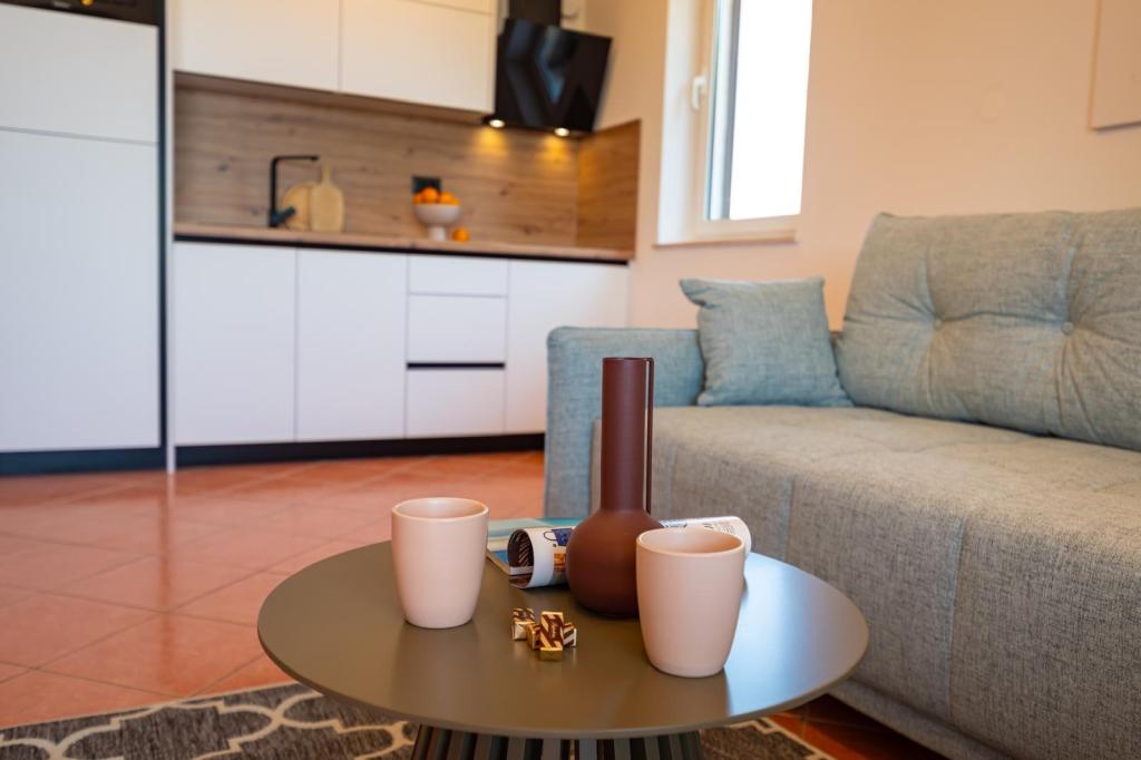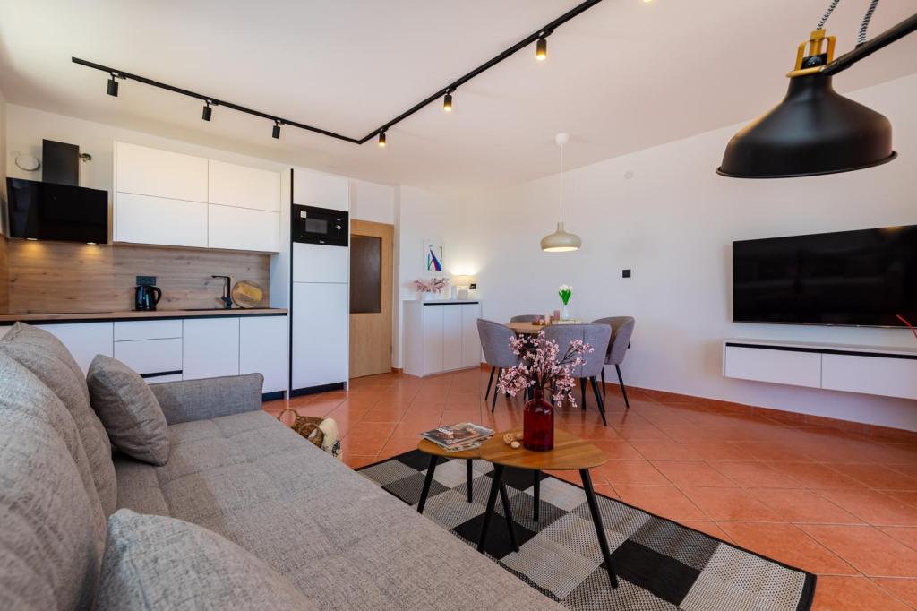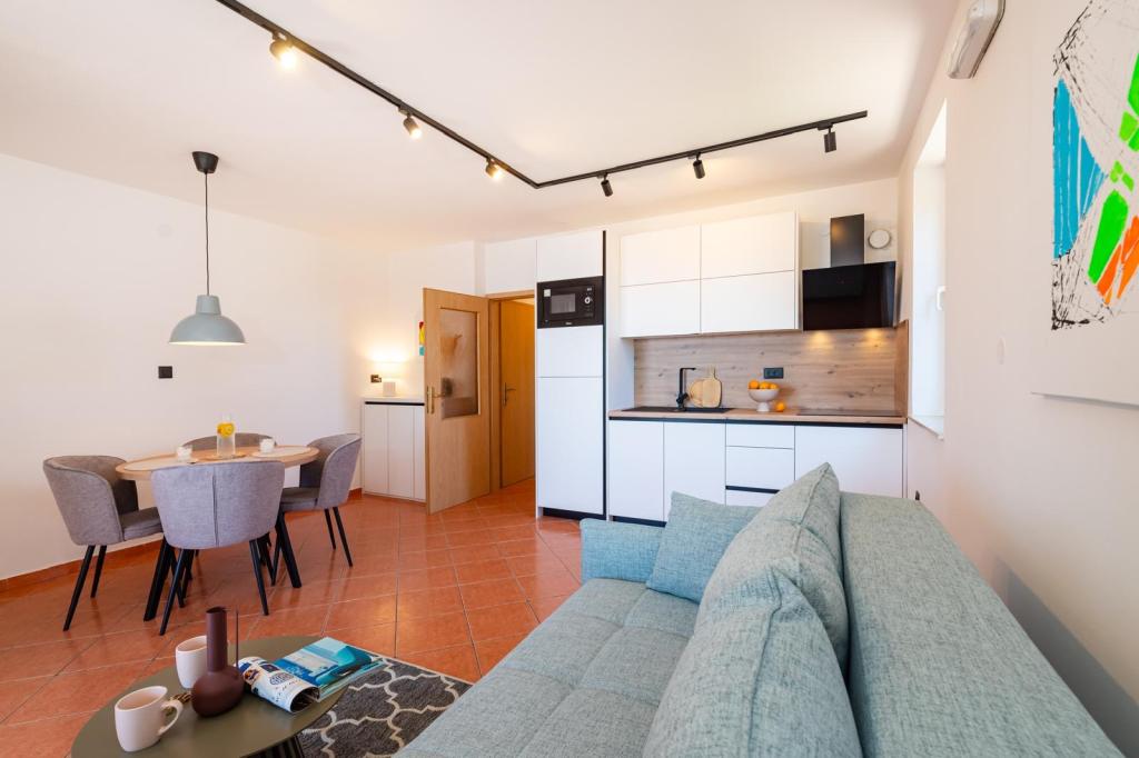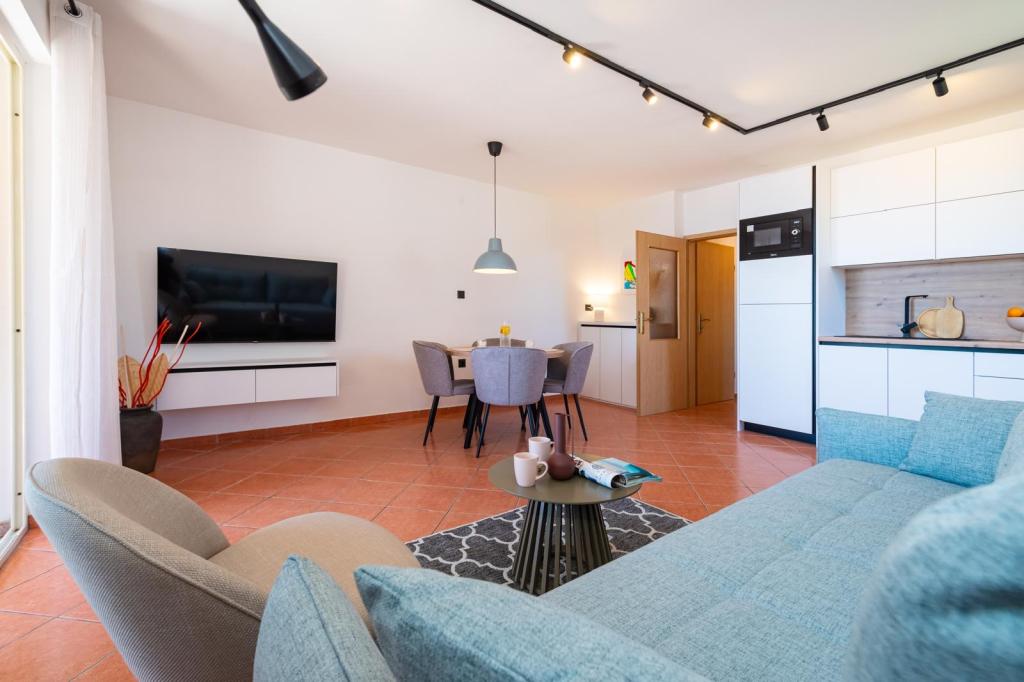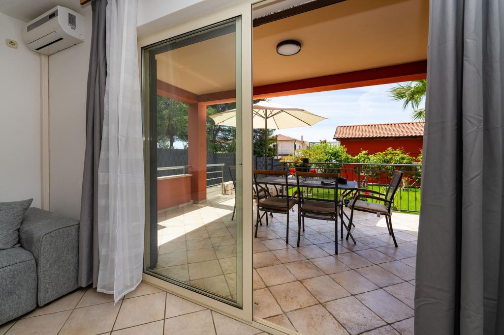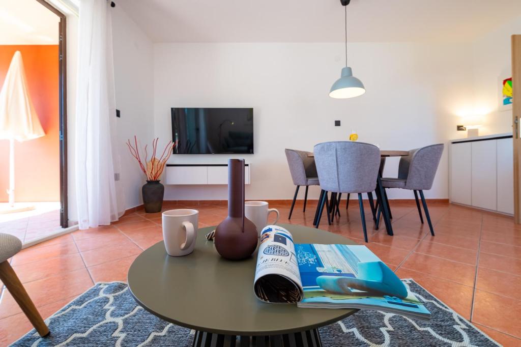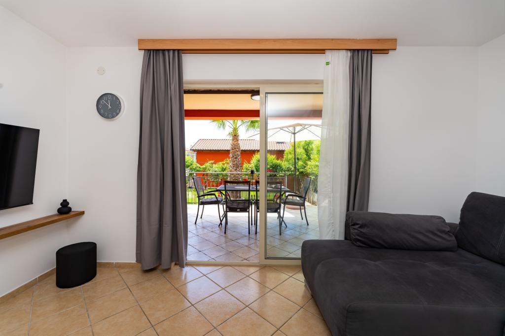 Vila San Marino ima osem enakih apartmajev, ki se nahajajo v treh nadstropjih. V vsakem nadstropju sta dva apartmaja. Apartmaji imajo skupno površino 55 m2 in vsebujejo dvoposteljno spalnico, dnevno sobo z raztegljivim ležiščem, kuhinjo, jedilnico in veliko teraso. Vsi apartmaji so v prvi vrsti ob morju in so obrnjeni proti morju. Opremljeni so s klimatsko napravo za hlajenje in ogrevanje. Kuhinje so opremljene s pripomočki za pripravo in serviranje hrane in pijače v ustreznih količinah, hladilnikom, zamrzovalnikom, električno kuhalno ploščo, plinskim štedilnikom in napo, kopalnice pa imajo tuše. Vsak apartma ima televizor z ravnim zaslonom s satelitsko televizijo in anteno ter dostop do interneta. Terase imajo sedežno garnituro.