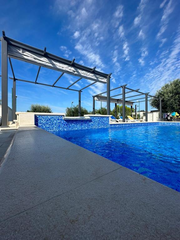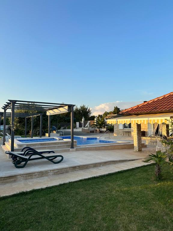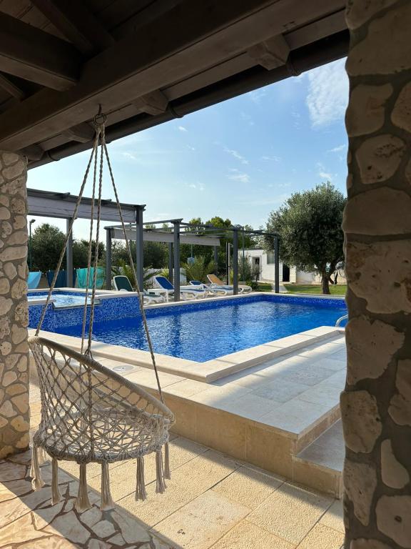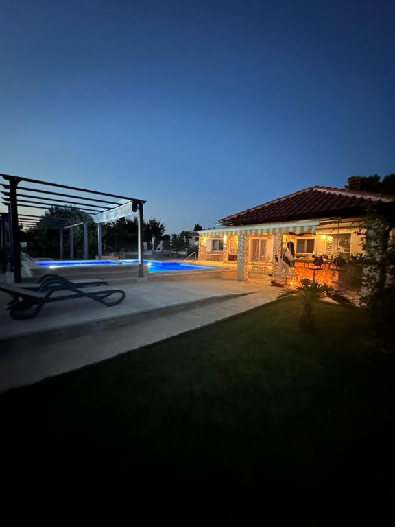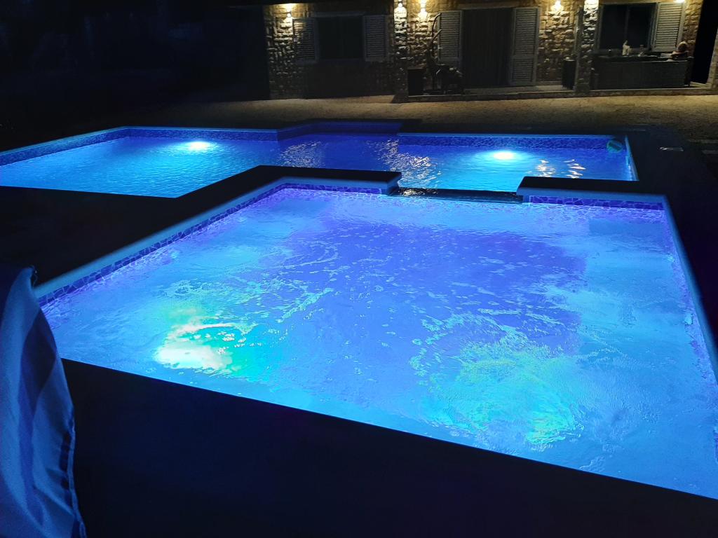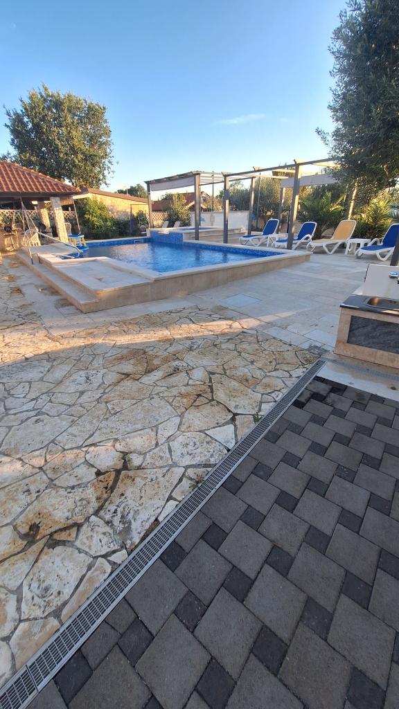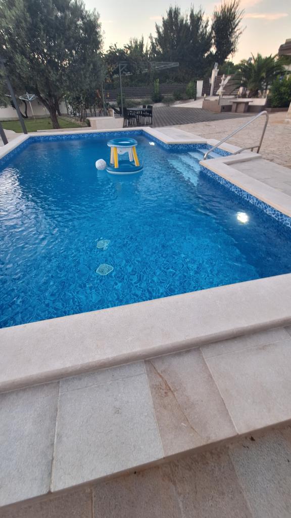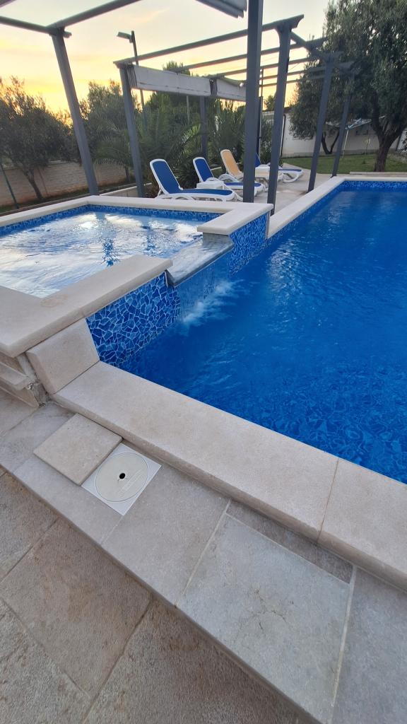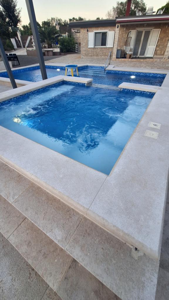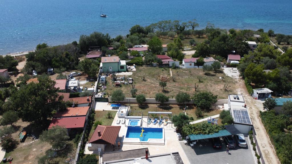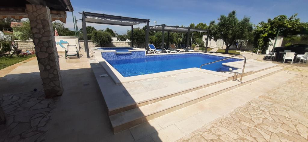 Počitniška hiša z ogrevanim bazenom in masažnim bazenom z umetnim slapom. Bazen meri 8 x 4 m, masažni bazen pa 3 x 3 m. Od plaže je oddaljena 200 metrov. V bližini je restavracija, pristanišče za privez čolnov in plaža za hišne ljubljenčke. Z žarom, parkirišče za 3 avtomobile.