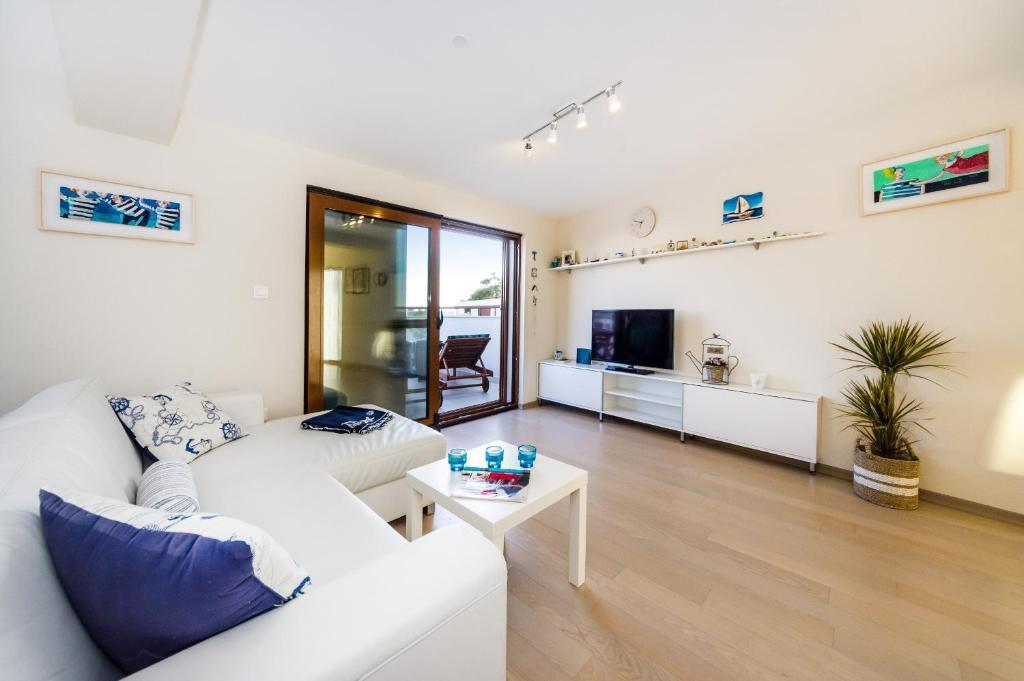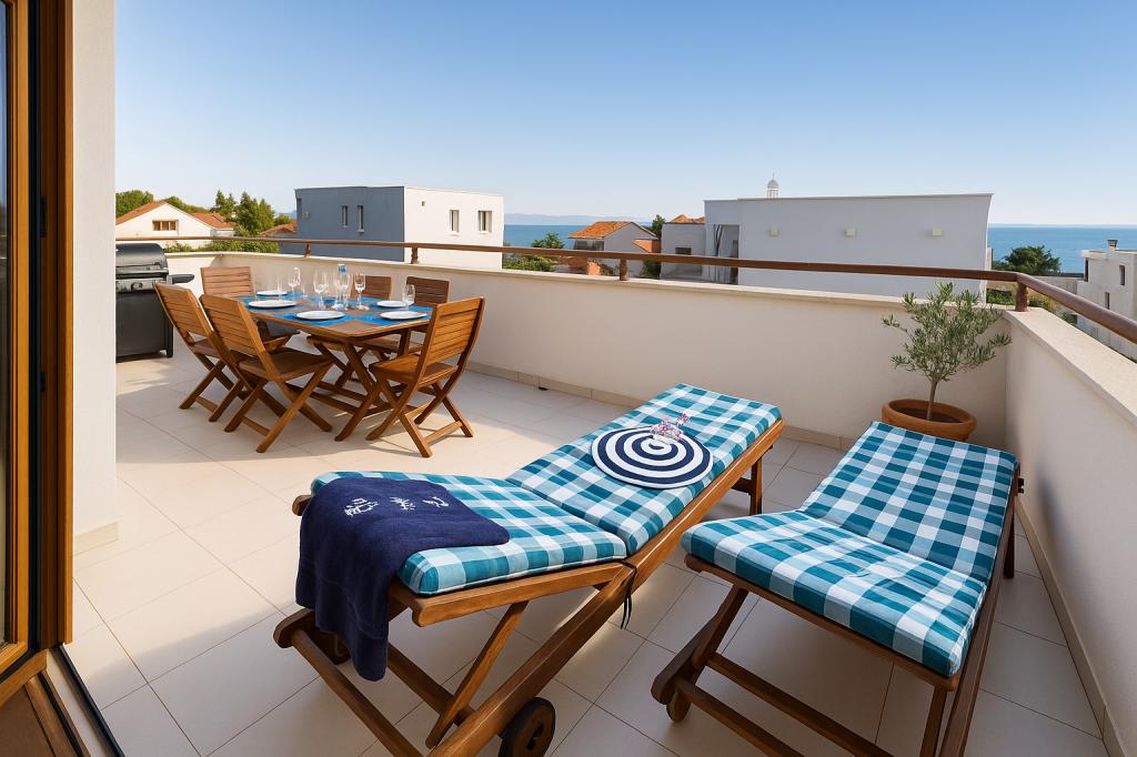 - Pogled na morje - Parkirišče - 3 spalnice - 1 kopalnica - Klimatska naprava - Velika terasa - Žar - Pomivalni stroj - Pralni stroj - Raztegljiv kavč - Opremljena kuhinja - Internet - Televizija (satelit)