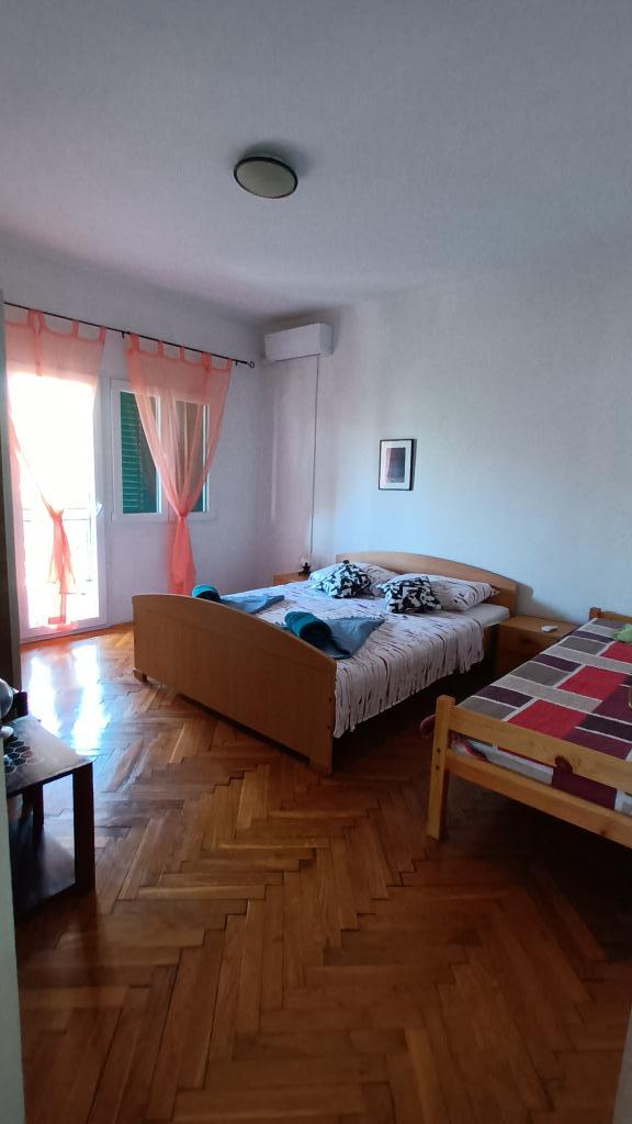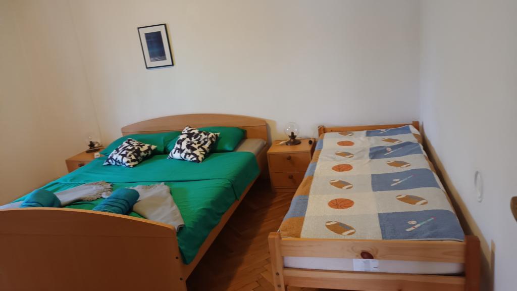 Prostoren apartma, v 1. nadstropju, dve spalnici, vsaka s tremi posteljami (zakonska postelja in enojna postelja), kuhinja, dnevna soba, stranišče, kopalnica, balkon. Klima v obeh spalnicah, satelitska TV, parkirišče, žar, wifi, blizu plaže. Nahaja se v mirnem delu Pirovca, 5-10 minut hoje do centra in manj kot 5 minut do plaže Lolić.