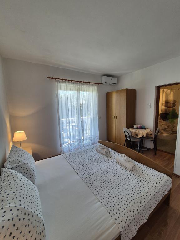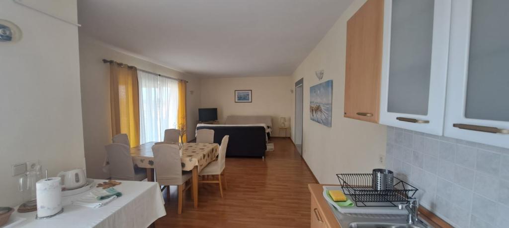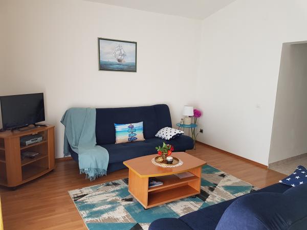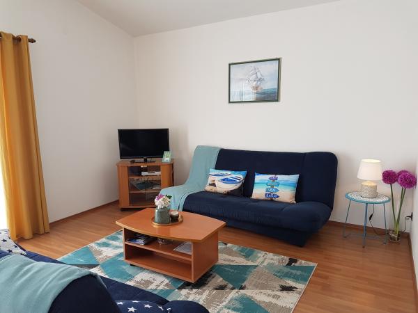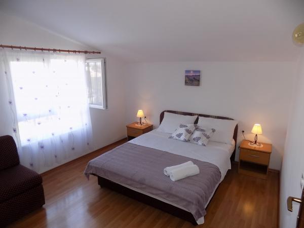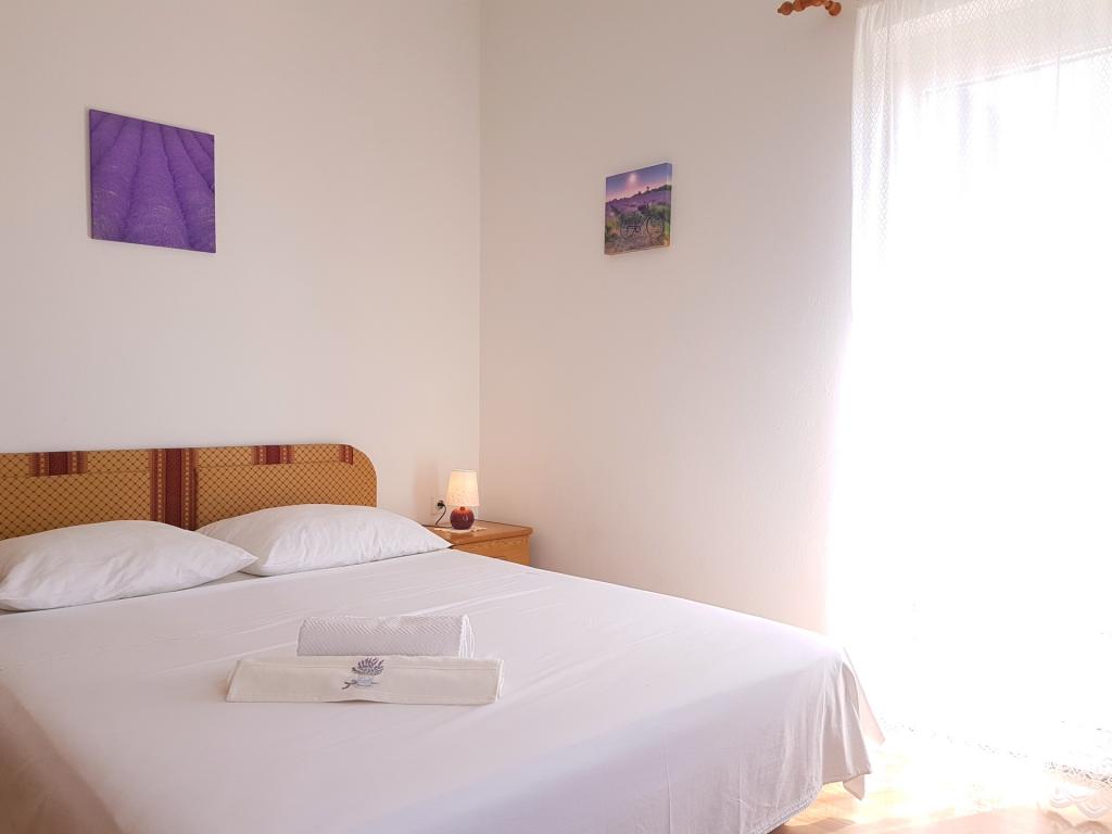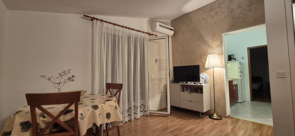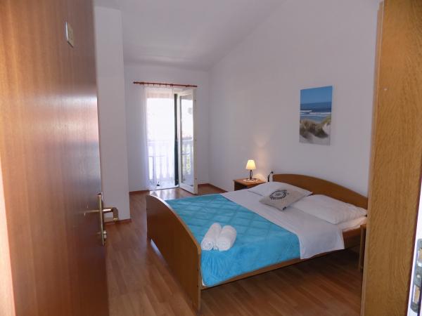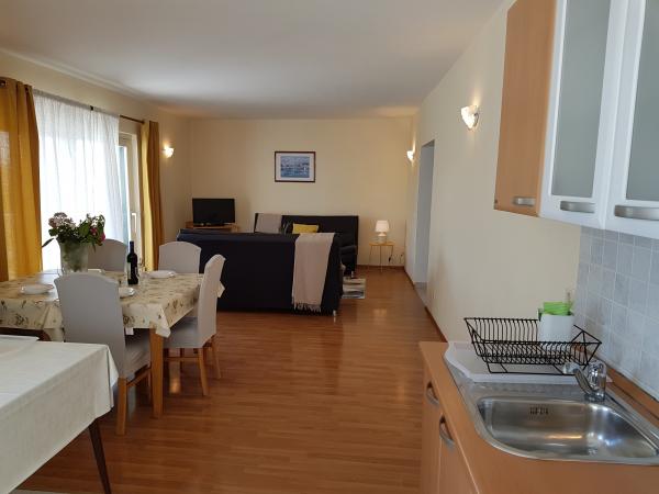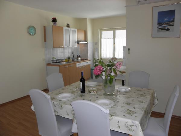 Apartmaji Kristina so oddaljeni le 150–200 m od centra in plaže, so precej prostorni in ponujajo številne ugodnosti, da se gostje počutijo udobno in domače. Vsi trije apartmaji so popolnoma opremljeni s kuhinjo, dnevno sobo (vsi kavči so raztegljivi), klimatsko napravo in TV-jem (satelitski programi). Dva apartmaja po 90 m² (v 1. in 2. nadstropju) sta svetla, zračna, z 20 m² veliko teraso s pogledom na morje in dvema prostornima spalnicama, vsaka soba pa ima kopalnico in ventilator. Apartma po 40 m² ima 5 m² velik balkon. Na voljo je ena spalnica po 15 m² s kopalnico, klimatsko napravo in hladilnikom (na hodniku). Brezplačen brezžični internet je na voljo v celotnem objektu, na hodniku pri vhodu pa je majhna knjižnica (polica z brošurami, knjigami v več tujih jezikih, revijami). Pred hišo je veliko parkirišče. Za rezervacije, pogoje in drugo glejte Opombe. Koledar rezervacij se posodablja. Veselimo se vašega prihoda!