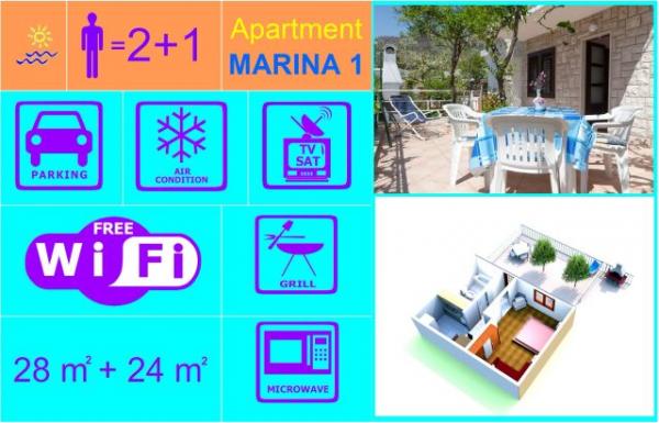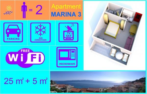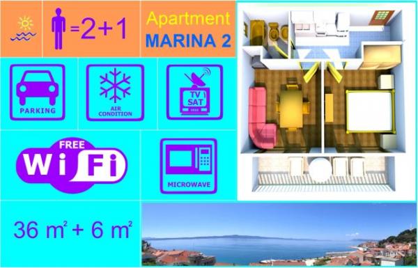 Vsi apartmaji so južno usmerjeni z balkonom ali teraso. Pogled na morje. Hiša se nahaja v drugi vrsti od morja, v mirnem delu Podgora, in blizu mesta, morje, plaže in vseh glavnih znamenitosti. Vsak apartma je opremljen s klimatsko napravo, brezplačen internet, SAT TV, mikrovalovna pečica, Kazan, in ostalo potrebno opremo. Za vsako stanovanje je ena parkirišče ob naši hiši.