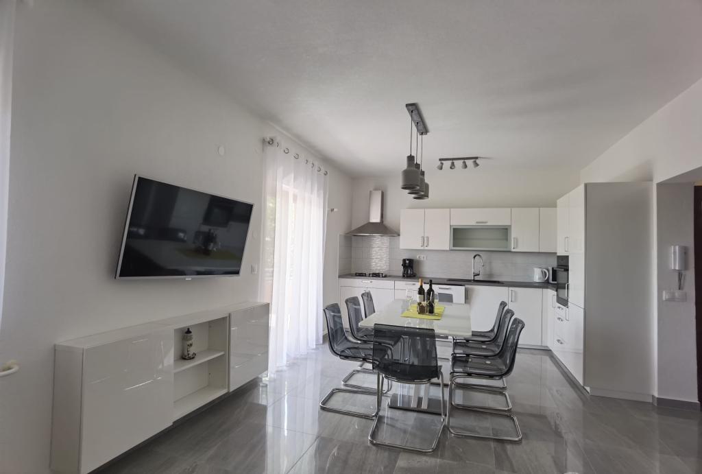 Apartma 6+2 je zelo lep, prostoren, sodobno opremljen, z veliko teraso in pogledom na morje ter klimo in TV v vsaki sobi. Oprema apartmaja je primerna tudi za majhne otroke, saj so imeli tudi prenosno posteljico in stolček za hranjenje. Ob prihodu je bilo v hladilniku veliko ohlajene pijače za dobrodošlico. Apartma je bil ob prihodu zelo čist in urejen. Lastniki so bili zelo prijazni in ustrežljivi. Če smo potrebovalai še kaj, so nam tudi dodatno prinesli. Do morja in plaže - po bližnjici - je blizu, vendar je del poti neprimeren za vožnjo z otroškim vozičkom, kar je bila za nas tudi edina pomanjkljivost. Priporočamo velikim družinam ali skupini prijateljev.