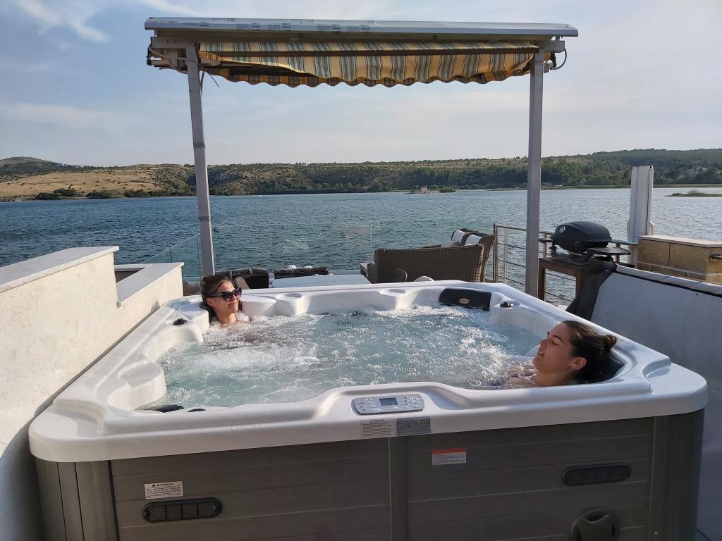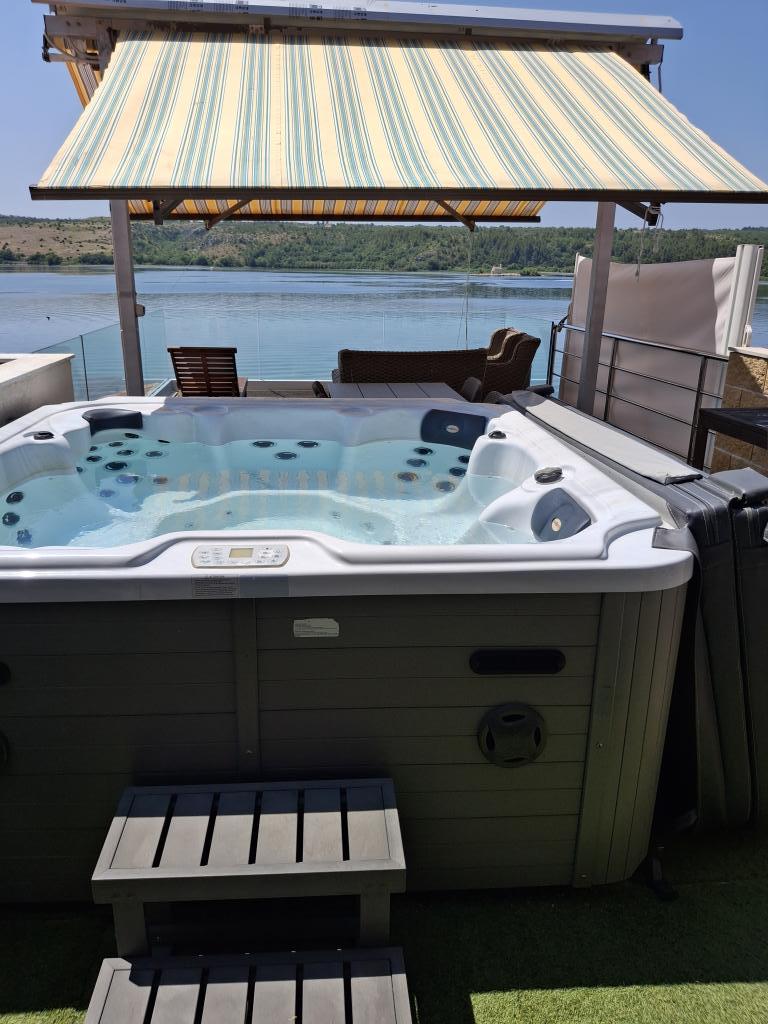 Turistična taksa je vključena v ceno. Dokument o potrditvi rezervacije ob rezervacijiLuksuzni apartma ima zasebni masažni bazen, 50 m2 veliko teraso z ležalniki, sedežno garnituro in mizo s stoli. Del terase je pokrit s paneli, del pa z motoriziranimi tendami.