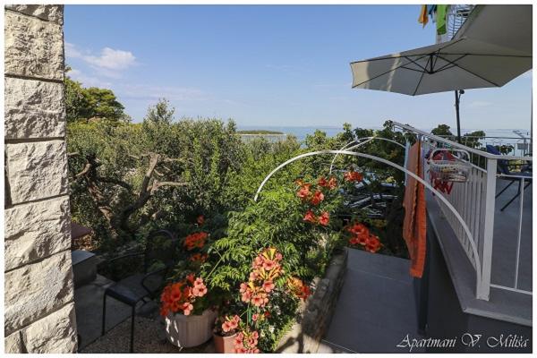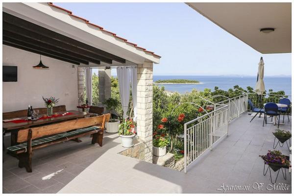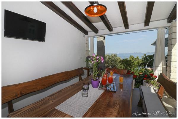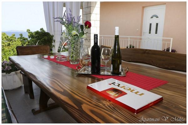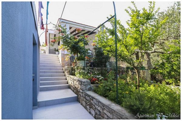 Dobrodošli v apartmajih Miliša-Vesna! Uživajte v miru in lepoti našega čudovitega Primoštena! Apartmaji Miliša se nahajajo v mirnem delu Primoštena. 100 m od prodnate in skalnate plaže in 600 m od centra, do katerega lahko pridete peš v 8 minutah. Naši apartmaji lahko sprejmejo od 2 do 16 oseb. Vsak apartma je opremljen s satelitsko televizijo, klimatsko napravo in wifi. Vsak apartma ima parkirišče na dvorišču. Na vrtu je žar z veliko skupno teraso. Apartmaji Miliša vam nudijo čudovit razgled z vsake terase našega apartmaja in vam omogočajo, da uživate v primoštenskem sončnem zahodu, ki je najlepši in najbolj romantičen sončni zahod.