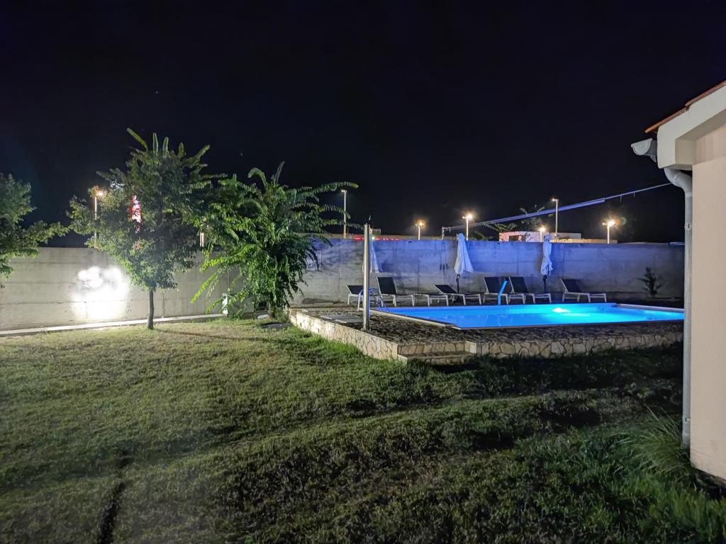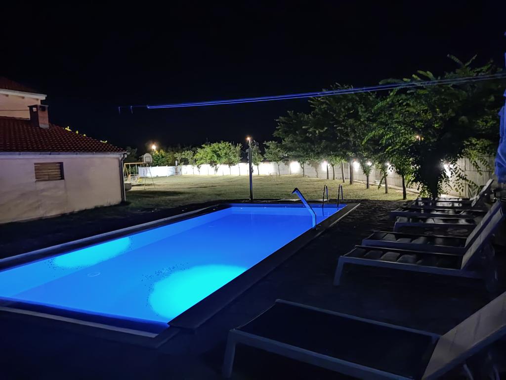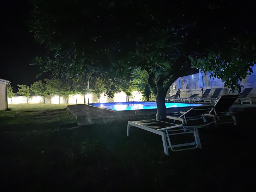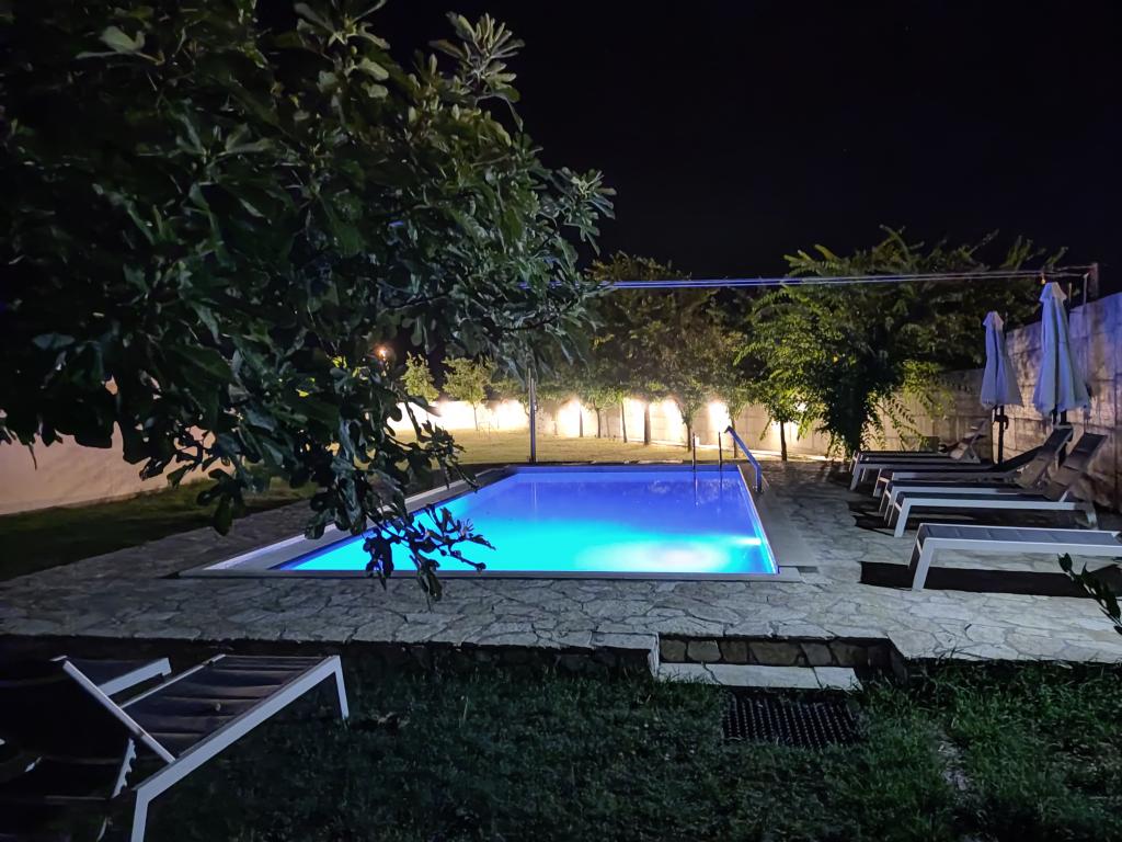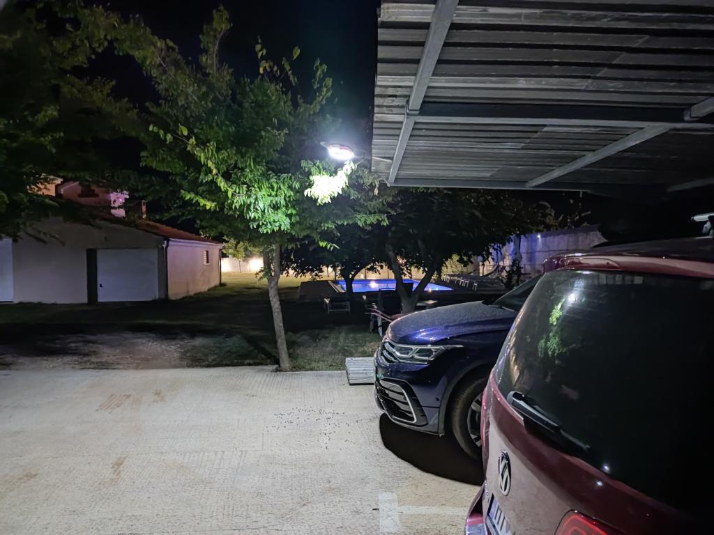 Na našem dvorišču imamo urejeno in rezervirano eno pokrito parkirno mesto za vsak apartma. Imamo tudi parkirna mesta za več avtomobilov na apartma. V pomožni stavbi imajo gostje dostop do gostilne za druženje in pripravo hrane s potrebno jedilno opremo. Bazen je preliven na dveh straneh in opremljen z dvema vrstama vodnih masaž ter je gostom na voljo od 8.00 do 22.00 ure. Ležalniki in senčniki so vključeni v ceno apartmaja. Fiksna nadstrešnica dolžine 12 m zagotavlja varno zaščito pred soncem. Dve vadbeni napravi sta gostom na voljo od 8.00 do 22.00 ure in sta vključeni v ceno apartmaja. Pralni stroj se nahaja v pomožni stavbi in je gostom na voljo od 8.00 do 22.00 ure in je vključen v ceno apartmaja. Gostitelji so vedno na voljo in pripravljeni pomagati pri pripravi hrane z žara.