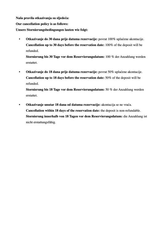 Turistična taksa je vključena v ceno. Dokument o potrditvi rezervacije ob rezervacijiOdpoved 30 dni pred dnevom rezervacije - 100% akontacije se vrne. Odpoved 18 dni pred rezervacijo - 50% akontacije se vrne. Po tem ni vračila akontacije.