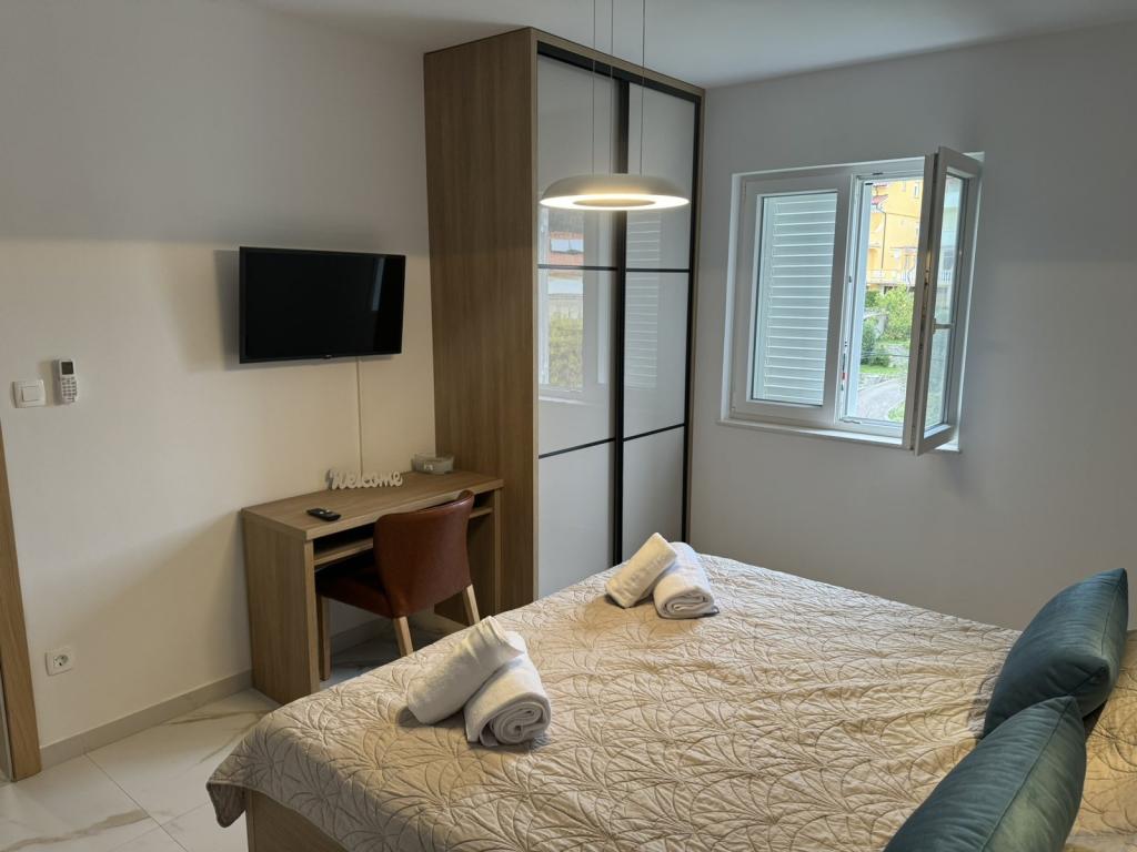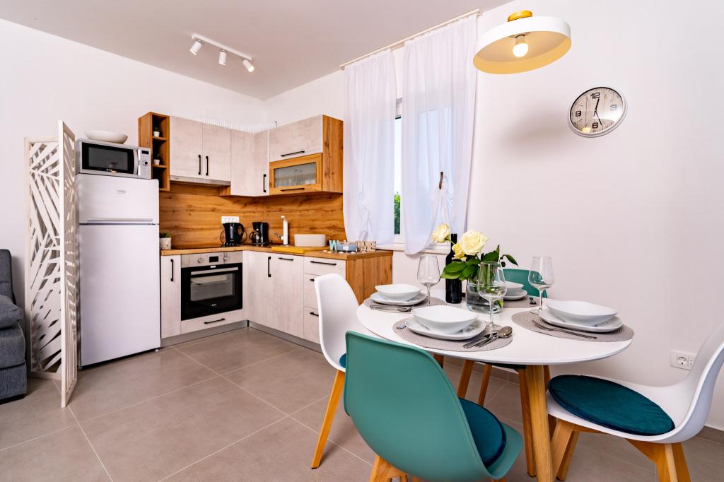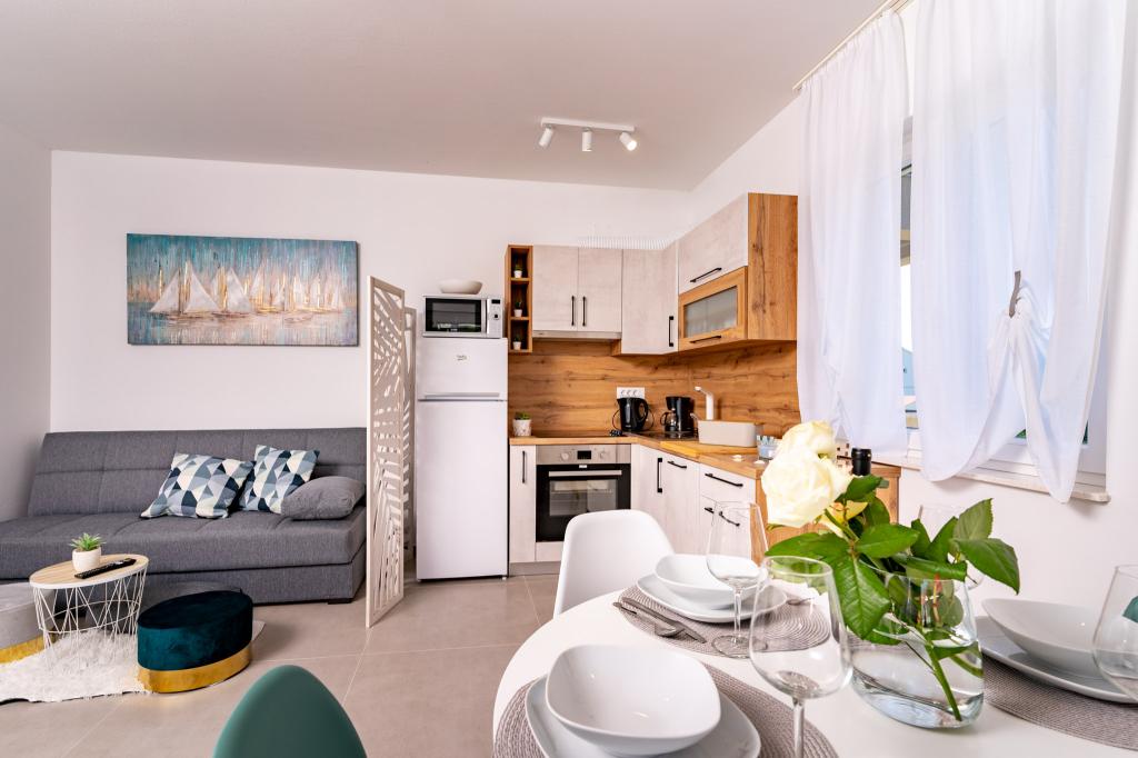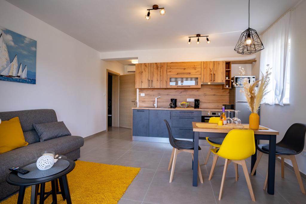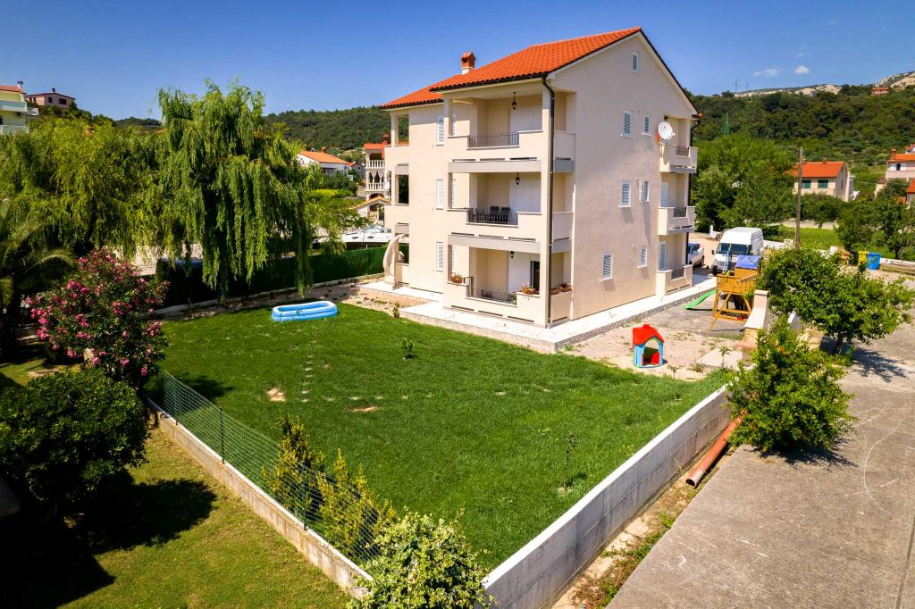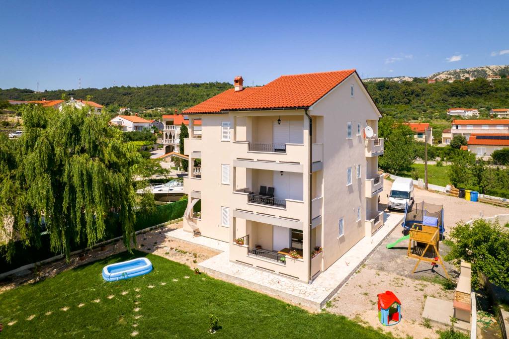 Popolnoma in moderno opremljeni apartmaji v mirnem delu otoka Rab Apartmaji se nahajajo 5 minut hoje od plaže Grat in 10 minut hoje od starega centra Grata, supermarketi so tudi 200 metrov od objekta. Pred stavbo je veliko brezplačno parkirišče in otroško igrišče.