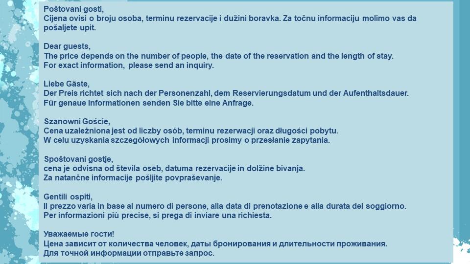 Turistična taksa nije vključena v ceno.Predplačilo služi kot garancija rezervacije.