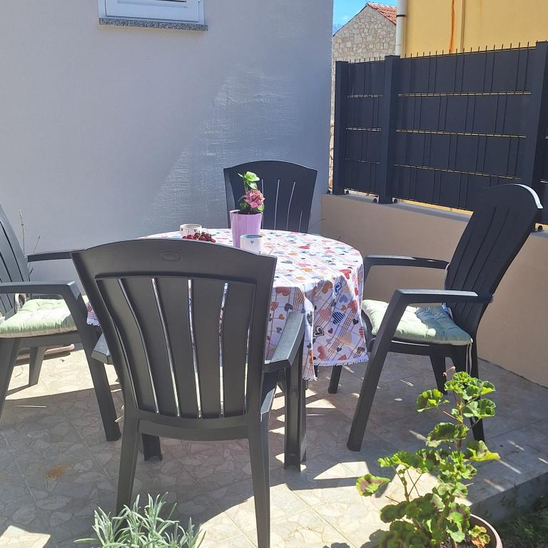 Popolnoma opremljena hiša 45 m2 se nahaja v Ražancu, majhnem mestu s pogledom na Velebit. Hiša se nahaja nekaj minut hoje od samega centra Ražanca, restavracij, lekarne, trgovine, pošte, ribarnice, tržnice. . Prva trgovina je oddaljena minuto hoje, supermarket Tommy je približno 10 minut hoje stran. V hiši je parkirišče za en manjši avto. Hiša je sestavljena iz kuhinje, kopalnice z WC-jem in tušem ter dveh spalnic. Ima klimo, pomivalni stroj, pralni stroj, aparat za kavo, kuhalnik vode, pečico, hladilnik z malim zamrzovalnikom, sušilnik za lase, sušilnik perila, likalnik, likalno desko, brisače, posodo za 6 oseb. Obe spalnici imata TV z max tv sprejemnikom. Na voljo je tudi brezplačen brezžični internet. Pred hišo je terasa z mizo in stoli ter senčnikom.