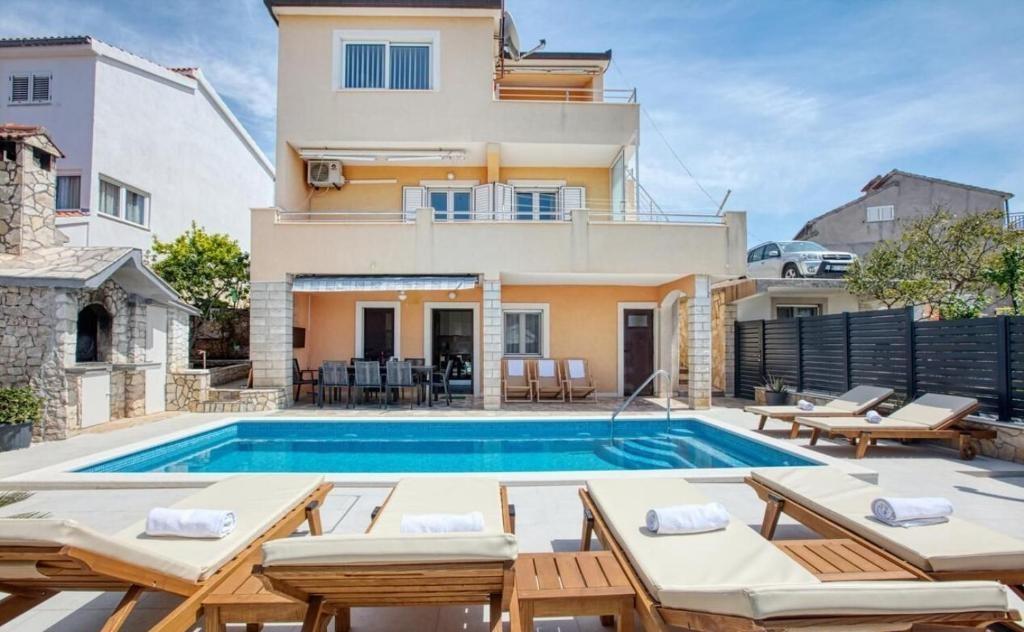 Uživajte v prenovljeni počitniški hiši z ogrevanim bazenom in čudovitim pogledom na morje, le 73 metrov od plaže. Hiša je sestavljena iz 3 enot s skupno 5 spalnicami, 3 kopalnicami in 3 kuhinjami. Zasebno zaprto parkirišče, klima, žar in internet so vključeni v ceno. Možnost privezov za čoln. dobrodošli