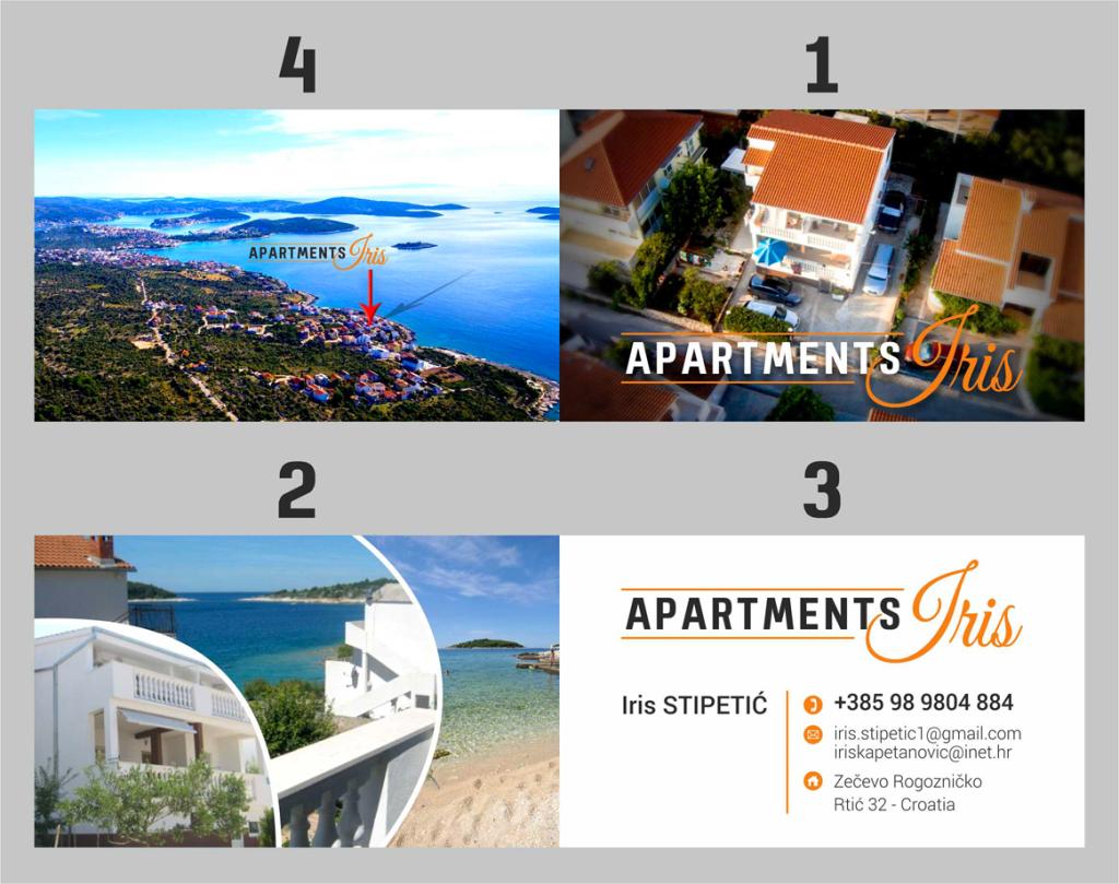 Iris Apartmaji se nahajajo v majhnem turističnem letovišču Zečevo, drugi vrsti od morja, z lepo urejeno peščene plaže oddaljen 40 metrov. V bližini plaže se nahaja LIFE je bogata z vsebinami, ki ponujajo gostinske objekte (restavracije, ležalniki, hladno pijačo, kavo, sladoled). Na plaži so sedeli 4 ležalniki lasti gostitelja, jasno označeni in gostje jih lahko prosto uporabljajo. Skupaj je plaža se nahaja vsaj jaz, kjer se lahko okrepčate v kopalke. Vas je na voljo vsako jutro svež kruh in zvitki, ki se prevažajo s kombiji 7-9 ure zjutraj. Večje mesto Rogoznica, ki je le 30 minut hoje promenada, ki je primeren za športne aktivnosti (kolesarjenje, tek) ali 10 minut vožnje z avtomobilom. Dobava hrane je na voljo v trgovinah (na vhodu v Rogoznici) in več manjših trgovin, ki se nahajajo v kraju Rogoznica.