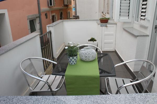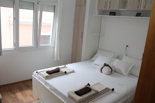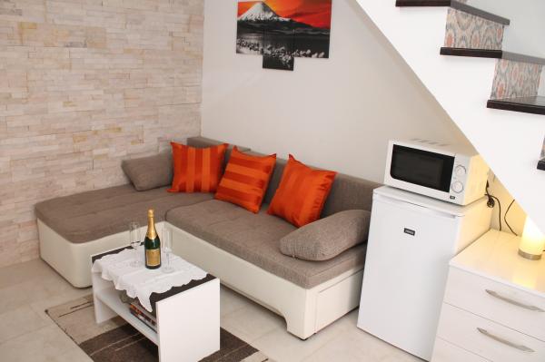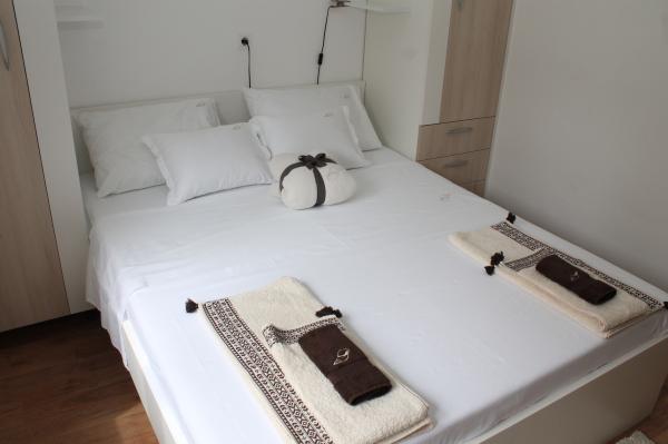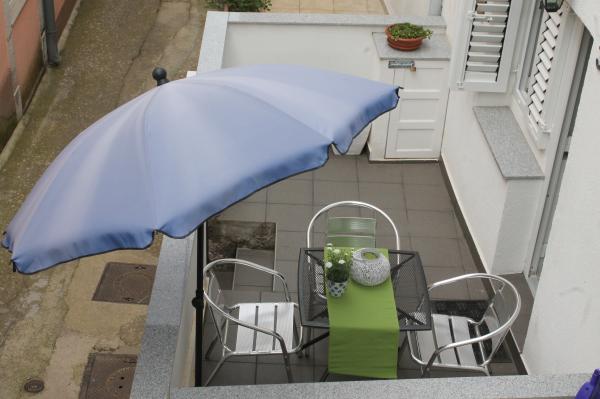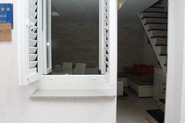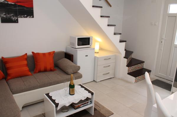 Sodobno opremljeno stanovanje v dveh nadstropjih (samostojna hiša v nizu) z lastno teraso v starem mestnem jedru na zelo mirni lokaciji in le 50 m stran od centra, v bližini supermarketov, pošte, menjalnic, kavarn in restavracij. oddaljenost od plaže 100 m. V zgornjem nadstropju je spalnica z zakonsko posteljo 160x200 in kopalnica, v spodnjem nadstropju pa dnevna soba s kuhinjo in kotni kavč, ki se uporablja kot dodatno ležišče 160x200 . Apartma je popolnoma opremljen z vsem za prijetne počitnice. Pred vhodom je terasa velikosti 10 m2, ki jo lahko uporabljate kot poletno jedilnico ali kot prostor za sprostitev. Kajenje v hiši ni dovoljeno Hišni ljubljenčki niso dovoljeni. Za goste je na voljo parkirišče za eno vozilo 5 minut hoje od apartmaja. Po odhodu gostov stanovanje podrobno razkužijo in sprejmejo vse ukrepe za zaščito gostov pred okužbami. V primeru potrebe je v bližini zdravstvena pomoč, ki je na voljo 24 ur.