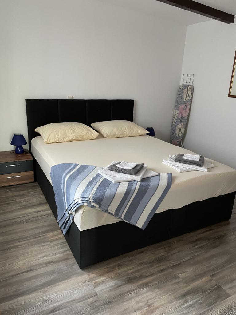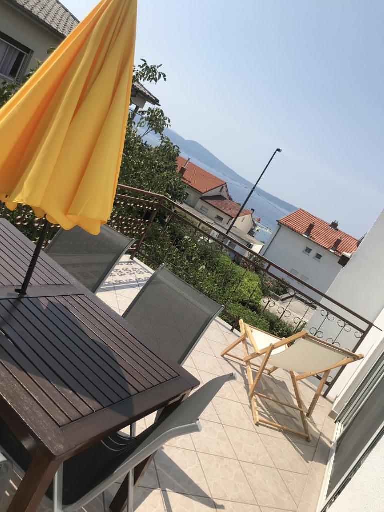 Apartma se nahaja v 1. nadstropju družinske hiše z veliko ločeno teraso in pogledom na morje. Nahaja se cca 350m od morja in plaže ter centra mesta. Sestavljen je iz dveh dvoposteljnih sob, dnevne sobe, opremljene kuhinje z jedilnico, kopalnice (pralni stroj). Popolnoma opremljeno, wi-fi, klima, parkirišče na dvorišču hiše.