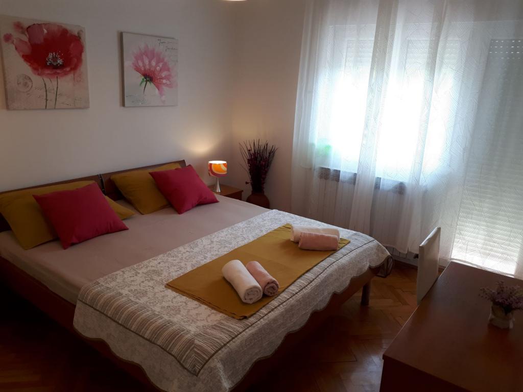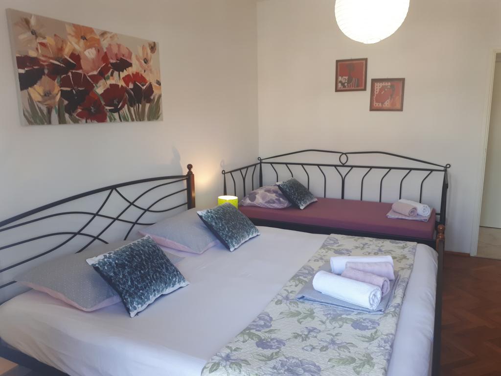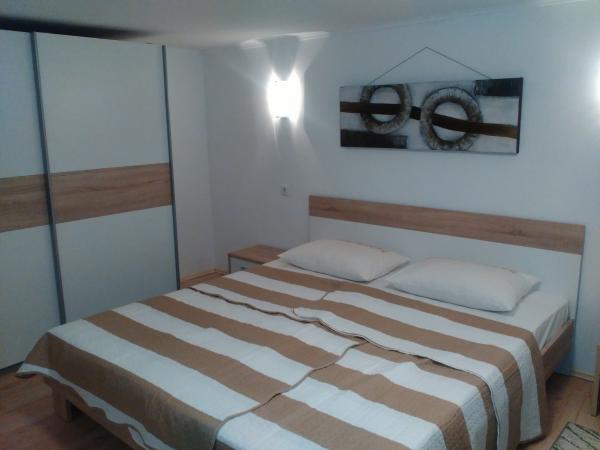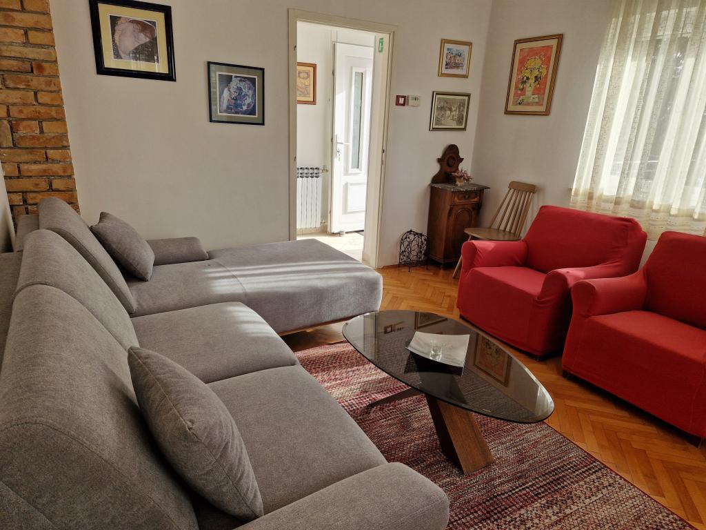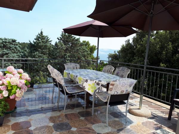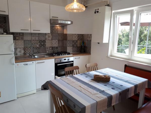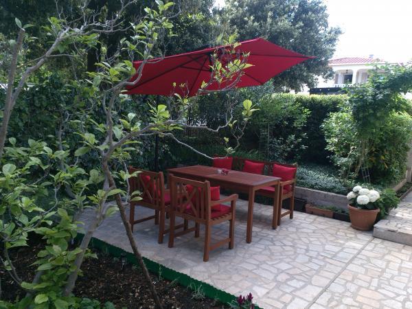 Udobno in lepo opremljeno stanovanje ob morju, obdan z zelenjem. Apartma ima tri spalnice (ena dvoposteljna in ena triposteljna soba), dnevno sobo, kuhinjo, kopalnico in hodnik. Prostorna jugu terasa z mizo in stoli (19 m2) nudi lep pogled na morje, medtem ko vsaka soba in dnevna soba ima dodatno balkon (13 m2 in 3 m2). Stanovanje je zelo lepo opremljeno, v celoti opremljena z vso potrebno opremo. Apartma je klimatiziran, povezan s satelitsko televizijo, internet. Zasebno parkirišče je na dvorišču. Na le 150m od hiše je: morje in plaže (gramozna, žal, beton, ...), potapljaški klub \ Mihurić \, restavracije, teniška igrišča in drugih pomožnih objektov, potrebnih za aktivne počitnice.